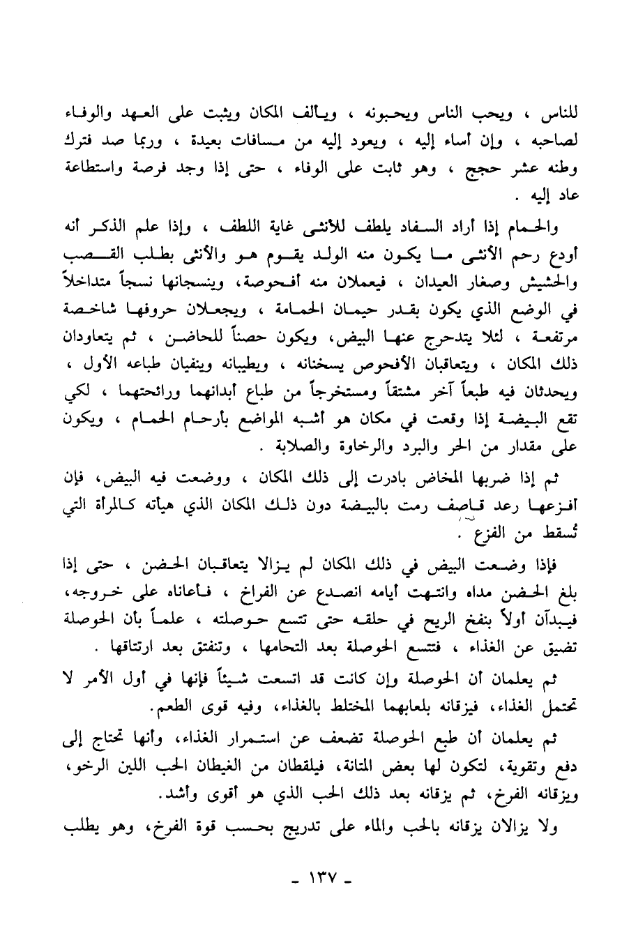 والحمام إذا أراد السفاد يلطف للأنثى غاية اللطف، وإذا علم الذكر أنه أودع رحم الأنثى ما يكون منه الولد يقوم هو والأنثى بطلب القصب والحشيش وصغار العيدان، فيعملان منه أفحوصة، وينسجانها نسجاً متداخلاً في الوضع الذي يكون بقدر حيمان الحمامة، ويجعلان حروفها شاخصة مرتفعة، لئلا يتدحرج عنها البيض، ويكون حصناً للحاضن، ثم يتعاودان ذلك المكان، ويتعاقبان الأفحوص يسخنانه، ويطيبانه وينفيان طباعه الأول، ويحدثان فيه طبعاً آخر مشتقاً ومستخرجاً من طباع أبدانهما ورائحتهما، لكي تقع البيضة إذا وقعت في مكان هو أشبه المواضع بأرحام الحمام، ويكون على مقدار من الحر والبرد والرخاوة والصلابة.