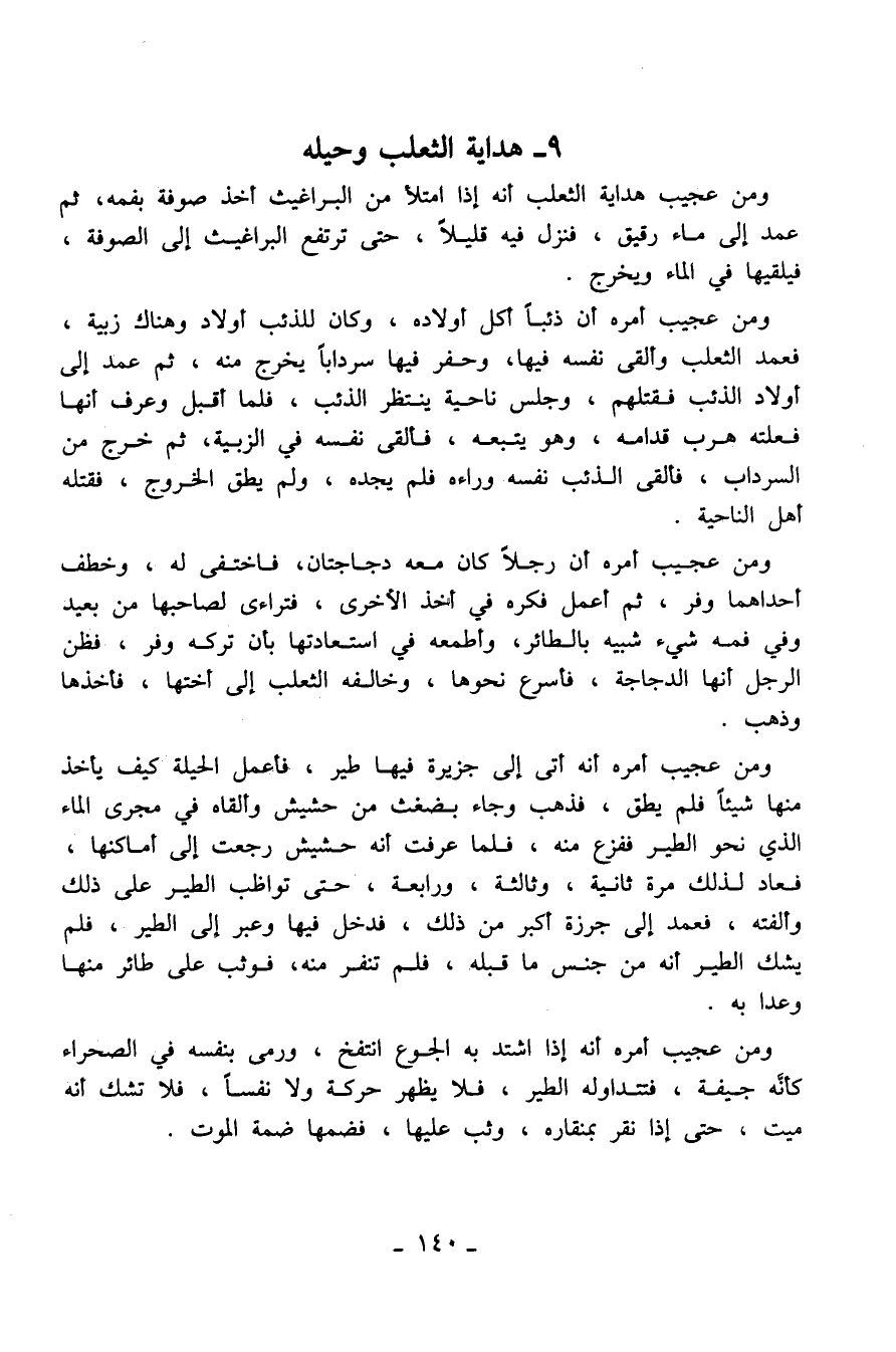 ومن عجيب هداية الثعلب أنه إذا امتلأ من البراغيث أخذ صوفة بفمه، ثم عمد إلى ماء رقيق، فنزل فيه قليلاً، حتى ترتفع البراغيث إلى الصوفة، فيلقيها في الماء ويخرج.