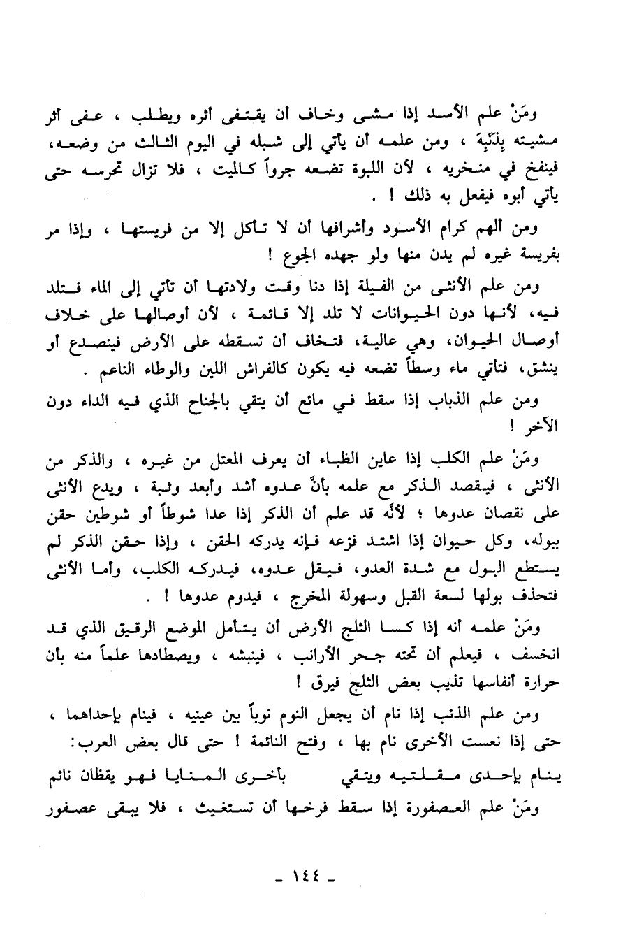 ومَنْ علم الأسد إذا مشى وخاف أن يقتفى أثره ويطلب، عفى أثر مشيته بِذَنَبِه، ومن علمه أن يأتي إلى شبله في اليوم الثالث من وضعه، فينفخ في منخريه، لأن اللبوة تضعه جرواً كالميت، فلا تزال تحرسه حتى يأتي أبوه فيفعل به ذلك! .