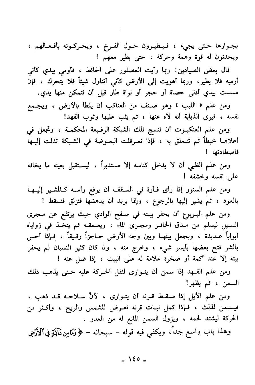 ومن علم العنكبوت أن تنسج تلك الشبكة الرفيعة المحكمة، وتجعل في أعلاها خيطاً ثم تتعلق به، فإذا تعرقلت البعوضة في الشبكة تدلت إليها فاصطادتها!