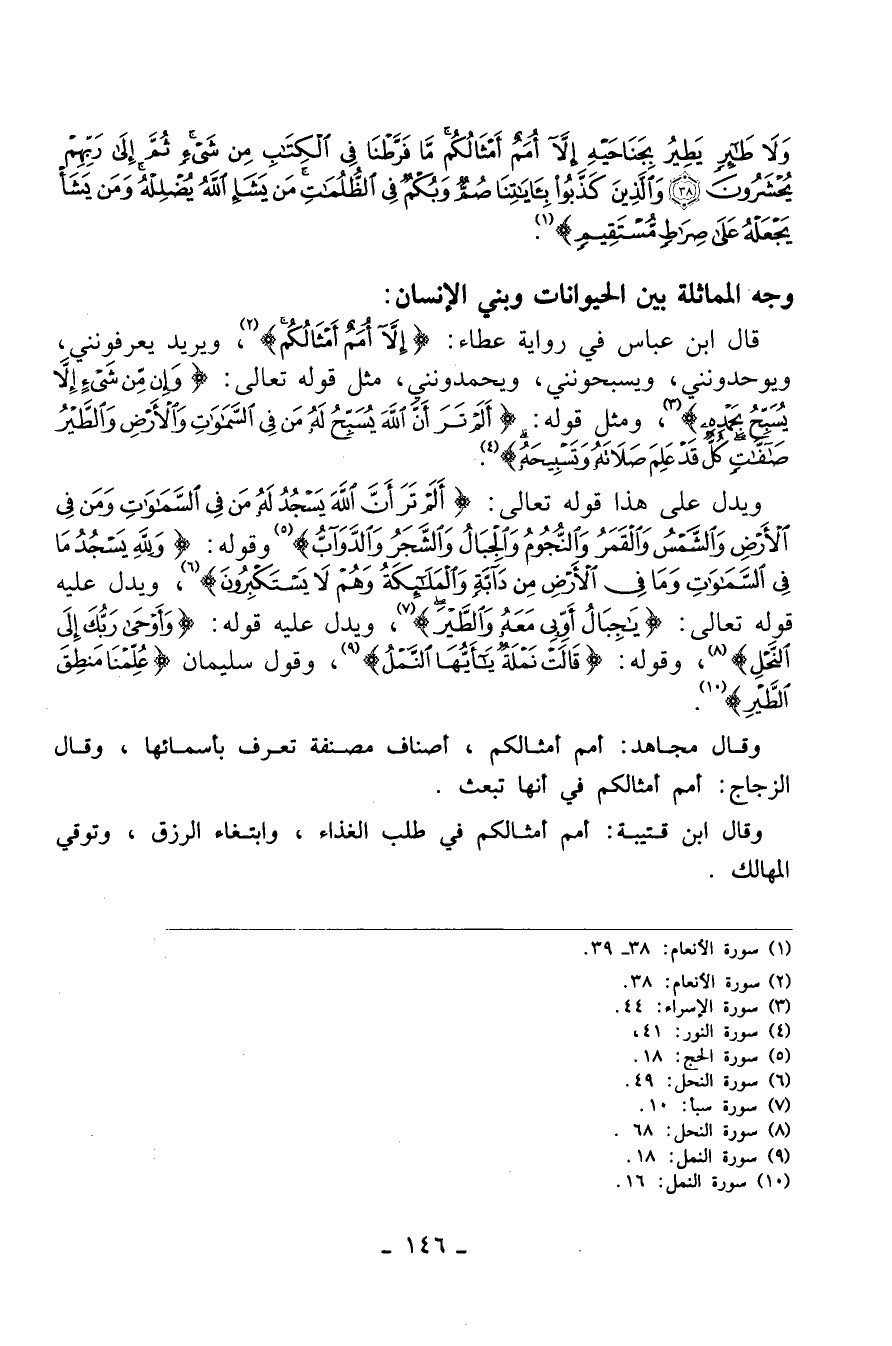 قال ابن عباس في رواية عطاء: (إلاَّ أمم أمثالكم) [الأنعام: 38] ، ويريد: يعرفونني، ويوحدونني، ويسبحونني، ويحمدونني، مثل قوله تعالى: (وإن من شيءٍ إلاَّ يسبح بحمده) [الإسراء: 44] ، ومثل قوله: (ألم تر أنَّ الله يسبح له من في السَّماوات والأرض والطَّير صافاتٍ كلٌّ قد علم صلاته وتسبيحه) [النور: 41] .
