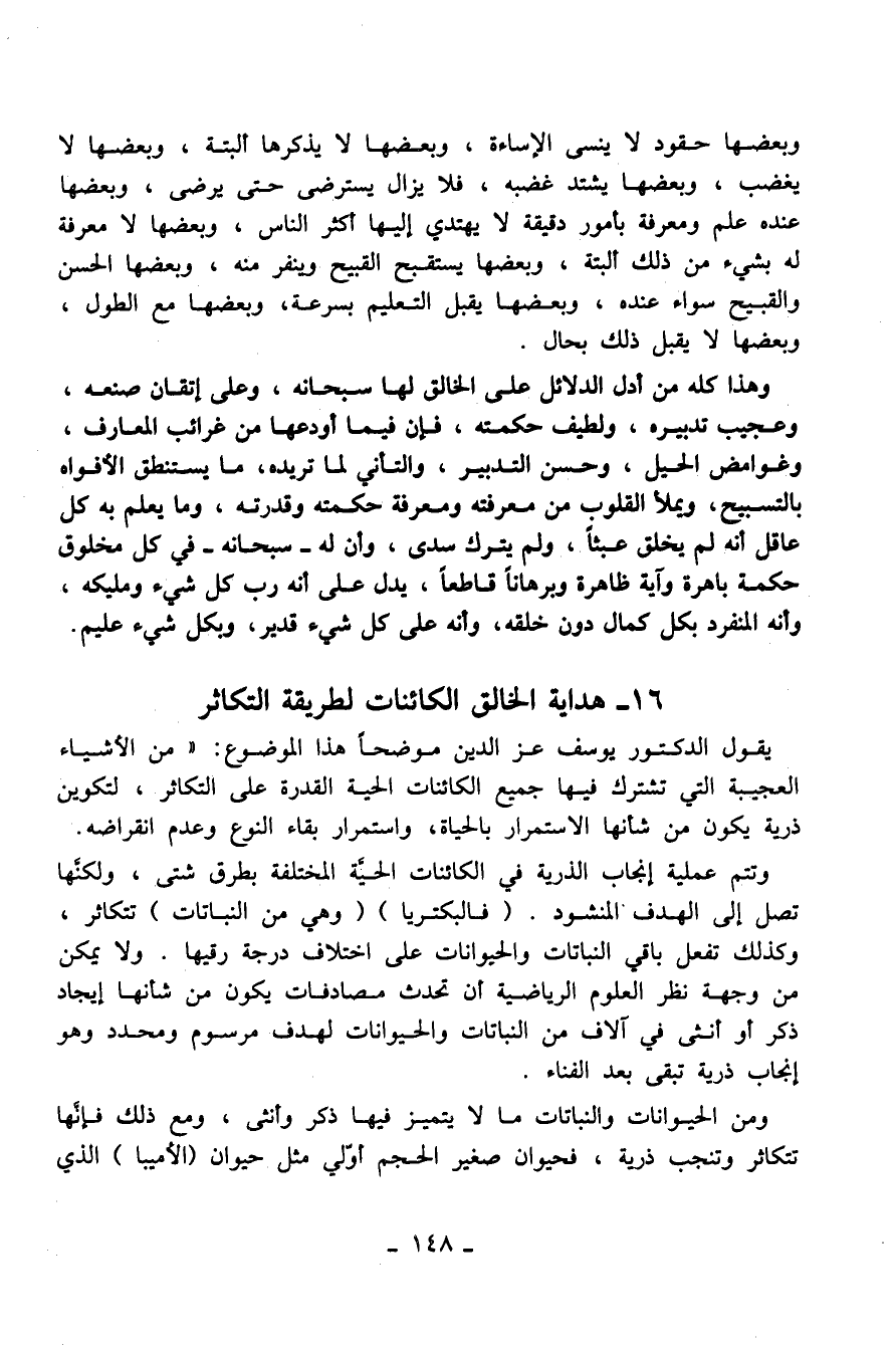 وتتم عملية إنجاب الذرية في الكائنات الحية المختلفة بطرق شتى، ولكنّها تصل إلى الهدف المنشود. (فالبكتريا) (وهي من النباتات) تتكاثر، وكذلك تفعل باقي النباتات والحيوانات على اختلاف درجة فيها. ولا يمكن من وجهة نظر العلوم الرياضية أن تحدث مصادفات يكون من شأنها إيجاد ذكر أو أنثى في آلاف من النباتات والحيوانات لهدف مرسوم ومحدد وهو إنجاب ذرية تبقى بعد الفناء.