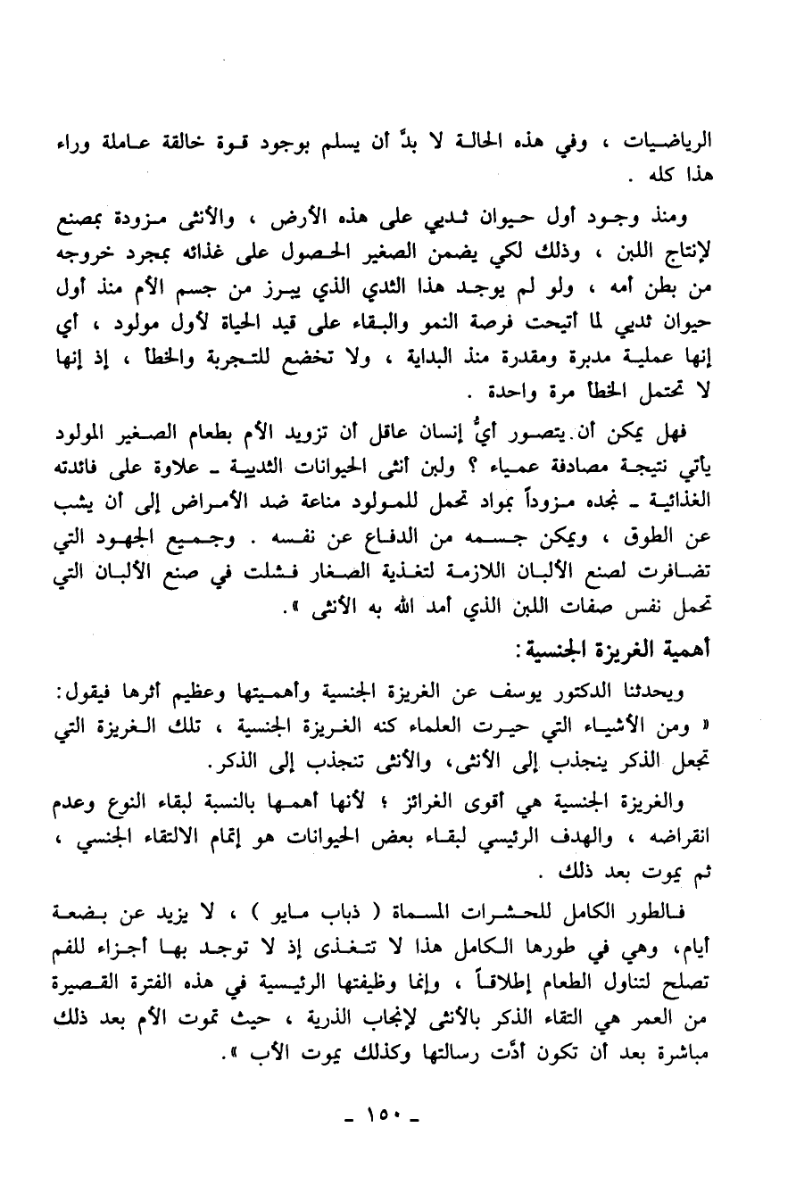 فهل يمكن أن يتصور أيّ إنسان عاقل أن تزويد الأم بطعام الصغير المولود يأتي نتيجة مصادفة عمياء؟ ولبن أنثى الحيوانات الثديية - علاوة على فائدته الغذائية - نجده مزوداً بمواد تحمل للمولود مناعة ضد الأمراض إلى أن يشب عن الطوق، ويمكن جسمه من الدفاع عن نفسه. وجميع الجهود التي تضافرت لصنع الألبان اللازمة لتغذية الصغار فشلت في صنع الألبان التي تحمل نفس صفات اللبن الذي أمد الله به الأنثى ".