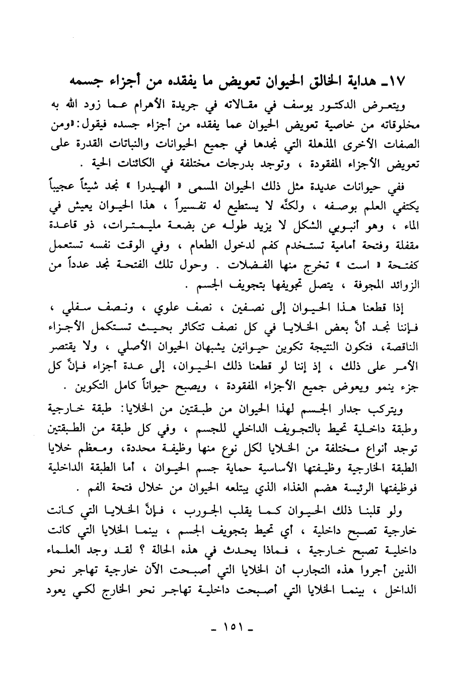 ويتعرض الدكتور يوسف في مقالاته في جريدة الأهرام عما زود الله به مخلوقاته من خاصية تعويض الحيوان عما يفقده من أجزاء جسده فيقول: " ومن الصفات الأخرى المذهلة التي نجدها في جميع الحيوانات والنباتات القدرة على تعويض الأجزاء المفقودة، وتوجد بدرجات مختلفة في الكائنات الحية.