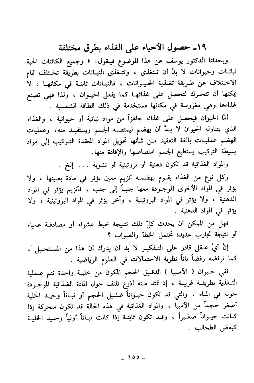 ويحدثنا الدكتور يوسف عن هذا الموضوع فيقول: " وجميع الكائنات الحية نباتات وحيوانات لا بدّ أن تتغذى، وتتغذى النباتات بطريقة تختلف تمام الاختلاف عن طريقة تغذية الحيوانات، فالنباتات ثابتة في مكانها، لا يمكنها أن تتحرك لتحصل على غذائها كما يفعل الحيوان، ولذا فهي تصنع غذاءها وهي مغروسة في مكانها مستخدمة في ذلك الطاقة الشمسية.