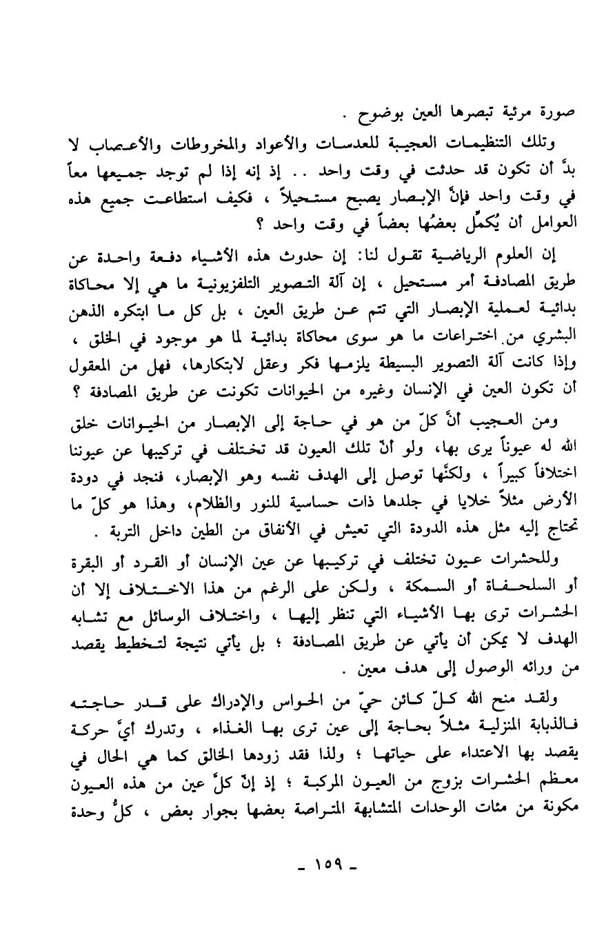 إنّ العلوم الرياضية تقول لنا: إن حدوث هذه الأشياء دفعة واحدة عن طريق المصادفة أمر مستحيل، إن آلة التصوير التلفزيونية ما هي إلا محاكاة بدائية لعملية الإبصار التي تتم عن طريق العين، بل كل ما ابتكره الذهن البشري من اختراعات ما هو سوى محاكاة بدائية لما هو موجود في الخلق، وإذا كانت آلة التصوير البسيطة يلزمها فكر وعقل لابتكارها، فهل من المعقول أن تكون العين في الإنسان وغيره من الحيوانات تكونت عن طريق المصادفة؟