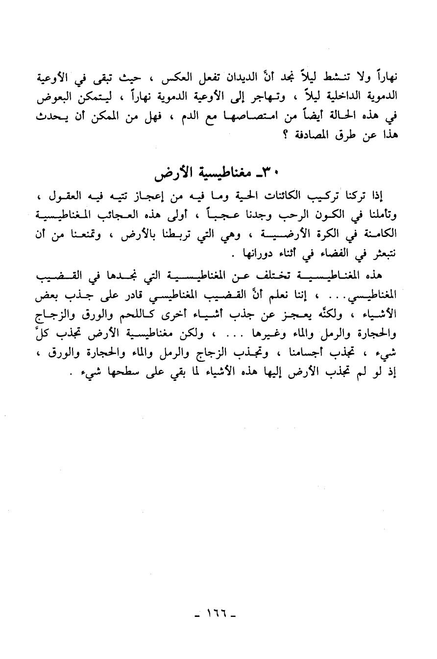 هذه المغناطيسية تختلف عن المغناطيسية التي نجدها في القضيب المغناطيسي ... ، إننا نعلم أنّ القضيب المغناطيسي قادر على جذب بعض الأشياء، ولكنّه يعجز عن جذب أشياء أخرى كاللحم والورق والزجاج والحجارة والرمل والماء وغيرها....، ولكن مغناطيسية الأرض تجذب كلّ شيء، تجذب أجسامنا، وتجذب الزجاج والرمل والماء والحجارة والورق، إذ لو لم تجذب الأرض إليها هذه الأشياء لما بقي على سطحها شيء.