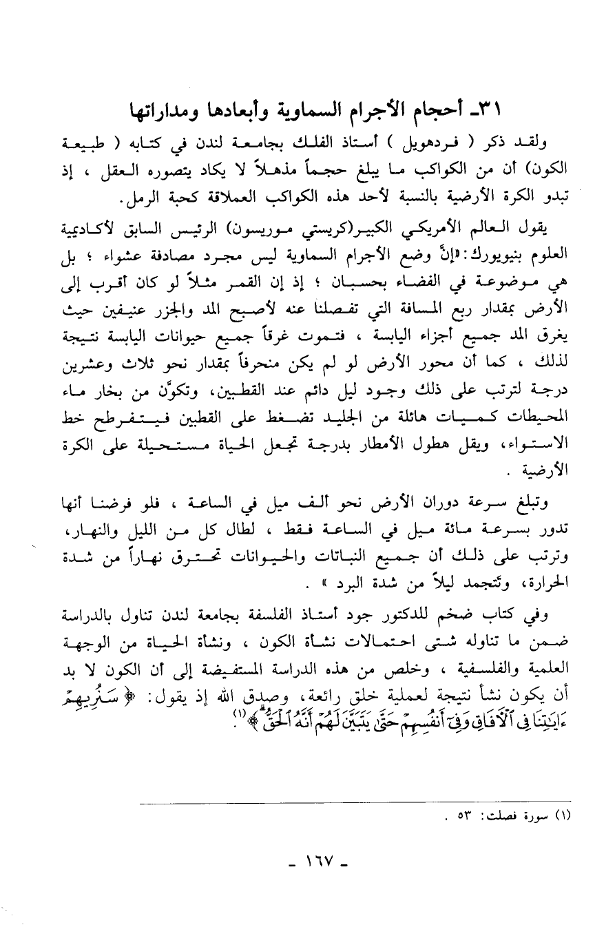 وتبلغ سرعة دوران الأرض نحو ألف ميل في الساعة، فلو فرضنا أنها تدور بسرعة مائة ميل في الساعة فقط، لطال كل من الليل والنهار، وترتب على ذلك أن جميع النباتات والحيوانات تحترق نهاراً من شدة الحرارة، وتَتجمد ليلاً من شدة البرد ".