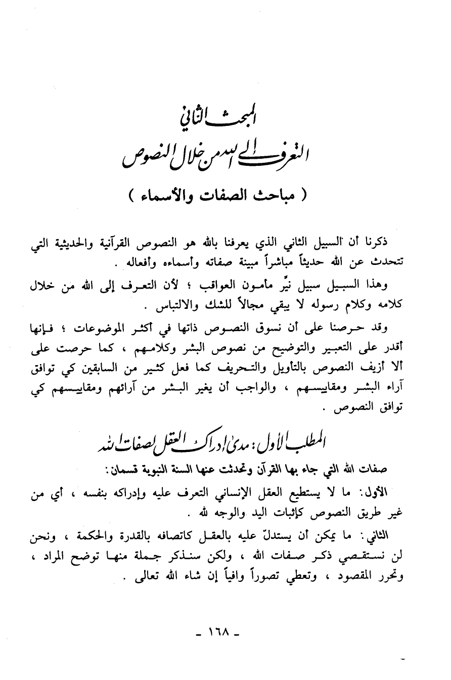الأول: ما لا يستطيع العقل الإنساني التعرف عليه وإدراكه بنفسه، أي من غير طريق النصوص كإثبات اليد والوجه لله.