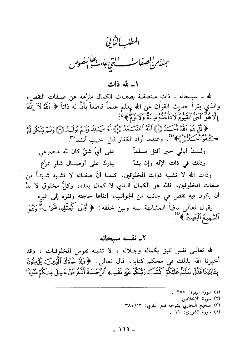 وذات الله لا تشبه ذوات المخلوقين، كما أنّ صفاته لا تشبه شيئاً من صفات المخلوقين، فالله هو الكمال الذي لا كمال بعده، وكلّ مخلوق لا بدّ أن يكون فيه نقص في جانب من الجوانب، أدناها حاجته وفقره إلى غيره.