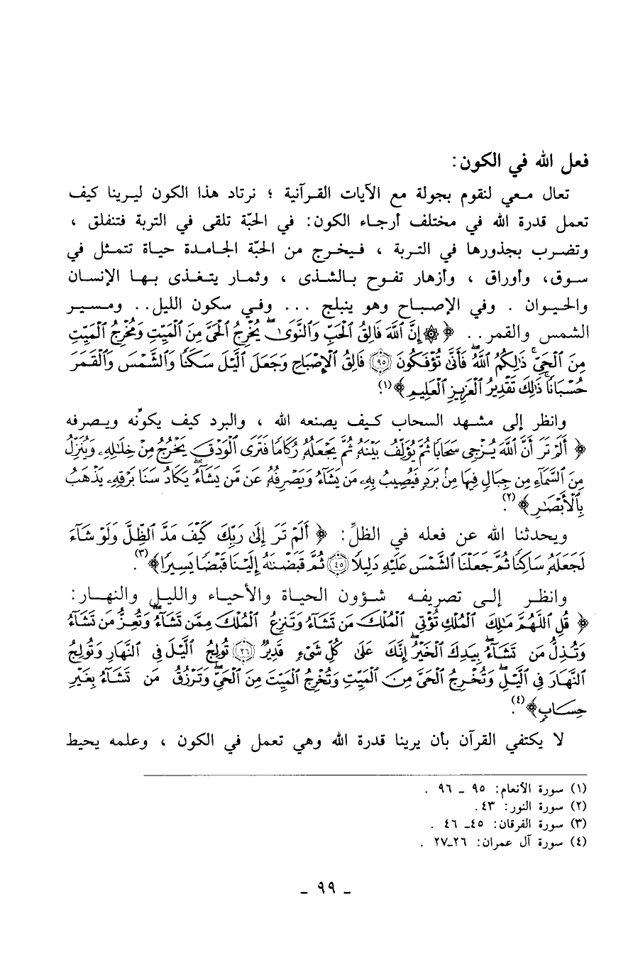 تعال معي لنقوم بجولة مع الآيات القرآنية؛ نرتاد هذا الكون ليرينا كيف تعمل قدرة الله في مختلف أرجاء الكون: في الحبّة تلقى في التربة فتنفلق، وتضرب بجذورها في التربة، فيخرج من الحبّة الجامدة حياة تتمثل في سوق، وأوراق، وأزهار تفوح بالشذى، وثمار يتغذى بها الإنسان والحيوان. وفي الإصباح وهو ينبلج ... وفي سكون اليل ... ومسير الشمس والقمر.. (إن الله فالق الحب والنوى يخرج الحي من الميت ومخرج الميت من الحي ذلكم الله فأنَّى تؤفكون - فالق الإصباح وجعل اليل سكناً والشمس والقمر حسباناً ذلك تقدير العزيز العليم) [الأنعام: 95-96] .