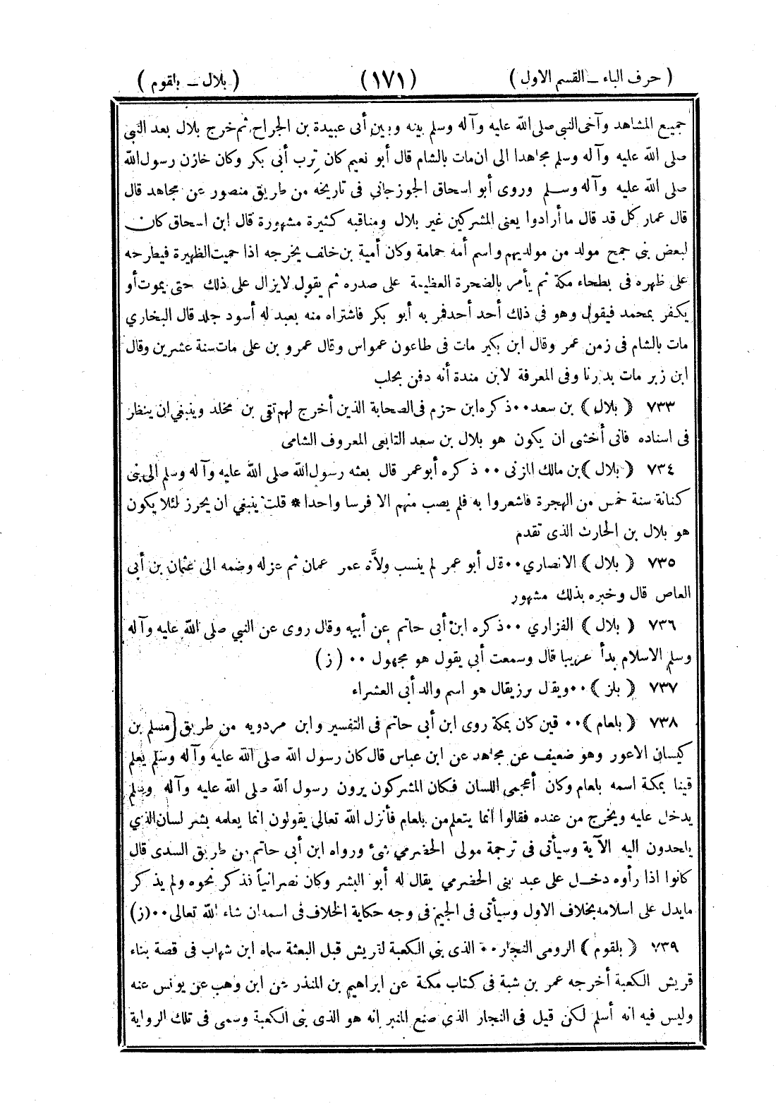 <171> جميع المشاهد وآخى النبي صلى الله عليه وسلم بينه وبين أبي عبيدة بن الجراح ثم خرج بلال بعد النبي صلى الله عليه وسلم مجاهدا إلى أن مات بالشام قال أبو نعيم كان ترب أبي بكر وكان خازن رسول الله صلى الله عليه وسلم وروى أبو إسحاق الجوزجاني في تاريخه من طريق منصور عن مجاهد قال قال عمار كل قد قال ما أرادوا يعني المشركين غير بلال ومناقبه كثيرة مشهورة قال بن إسحاق كان لبعض بني جمح مولد من مولديهم واسم أمه حمامة وكان أمية بن خلف يخرجه إذا حميت الظهيرة فيطرحه على ظهره في بطحاء مكة ثم يأمر بالصخرة العظيمة على صدره ثم يقول لا يزال على ذلك حتى يموت أو يكفر بمحمد فيقول وهو في ذلك أحد أحد فمر به أبو بكر فاشتراه منه بعبد له أسود جلد قال البخاري مات بالشام زمن عمر وقال بن بكير مات في طاعون عمواس وقال عمرو بن علي مات سنة عشرين وقال بن زبر مات بداريا وفي المعرفة لابن منده أنه دفن بحلب بلال بن سعد ذكره بن حزم في الصحابة الذين أخرج لهم بقي بن مخلد وينبغي أن ينظر في إسناده فإني أخشى أن يكون هو بلال بن سعد التابعي المعروف الشامي بلال بن مالك المزني ذكره أبو عمر قال بعثه رسول الله صلى الله عليه وسلم إلى بني كنانة سنة خمس من الهجرة فأشعروا به فلم يصب منهم الا فرسا واحدا قلت ينبغي أن يحرر لئلا يكون هو بلال بن الحارث الذي تقدم بلال الأنصاري قال أبو عمر لم ينسب ولاه عمر عمان ثم عزله وضمها إلى عثمان بن أبي العاص قال وخبره بذلك مشهور بلال الفزاري ذكره بن أبي حاتم عن أبيه وقال روى عن النبي صلى الله عليه وسلم الإسلام بدا غريبا قال وسمعت أبي يقول هو مجهول بلز ويقال برز يقال هو اسم والد أبي العشراء بلعام قين كان بمكة روى بن أبي حاتم في التفسير وابن مردويه من طريق مسلم بن كيسان الأعور وهو ضعيف عن مجاهد عن بن عباس قال كان رسول الله صلى الله عليه وسلم يعلم قينا بمكة اسمه بلعام وكان اعجمي اللسان فكان المشركون يرون رسول الله صلى الله عليه وسلم يدخل عليه ويخرج من عنده فقالوا إنما يتعلم من بلعام فأنزل الله تعالى يقولون إنما يعلمه بشر لسان الذي يلحدون إليه الآية وسيأتي في ترجمة مولى الحضرمي شيء من هذا ورواه بن أبي حاتم من طريق السدي قال كانوا إذا رأوه دخل على عبد بن الحضرمي يقال له أبو اليسر وكان نصرانيا فذكر نحوه ولم يذكر ما يدل على إسلامه بخلاف الأول وسيأتي في الجيم في جبر حكاية الخلاف في اسمه إن شاء الله تعالى بلقوم الرومي النجار الذي بنى الكعبة لقريش قبل البعثة وسماه بن شهاب في قصة بناء قريش الكعبة أخرجه عمر بن شبة في كتاب مكة عن إبراهيم بن المنذر عن بن وهب عن يونس عنه وليس فيه أنه أسلم لكن قيل في النجار الذي صنع المنبر أنه هو الذي بنى الكعبة وسمي في تلك الرواية §