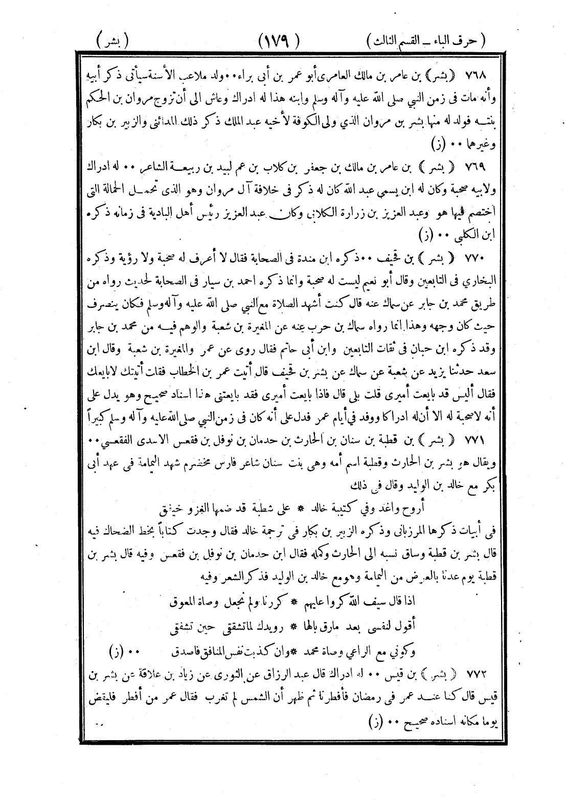 <179> بشر بن عامر بن مالك العامري أبو عمر بن أبي براء ولد ملاعب الأسنة وسيأتي ذكر أبيه وأنه مات في زمن النبي صلى الله عليه وسلم وابنه هذا له إدراك وعاش إلى أن تزوج مروان بن الحكم بنته فولد له منها بشر بن مروان الذي ولى الكوفة لأخيه عبد الملك ذكر ذلك المدائني والزبير بن بكار وغيرهما بشر بن عامر بن مالك بن جعفر بن كلاب بن عم لبيد بن ربيعة الشاعر له إدراك ولأبيه صحبة وكان له بن يسمى عبد الله كان له ذكر في خلافة آل مروان وهو الذي تحمل الحمالة التي اختصم فيها هو وعبدالعزيز بن زرارة الكلابي وكان عبد العزيز رئيس أهل البادية في زمانه ذكره بن الكلبي بشر بن قحيف ذكره بن منده في الصحابة فقال لا أعرف له صحبة ولا رؤية وذكره البخاري في التابعين وقال أبو نعيم ليست له صحبة وإنما ذكره أحمد بن سيار في الصحابة لحديث رواه من طريق محمد بن جابر عن سماك عنه قال كنت أشهد الصلاة مع النبي صلى الله عليه وسلم فكان ينصرف حيث كان وجهه وهذا إنما رواه سماك بن حرب عنه عن المغيرة بن شعبة والوهم فيه من محمد بن جابر وقد ذكره بن حبان في ثقات التابعين وابن أبي حاتم فقال روى عن عمر والمغيرة بن شعبة وقال بن سعد حدثنا يزيد عن شعبة عن سماك عن بشر بن قحيف قال أتيت عمر بن الخطاب فقلت أتيتك لأبايعك فقال أليس قد بايعت أميري قلت بلى قال فإذا بايعت أميري فقد بايعتني هذا إسناد صحيح وهو يدل على أنه لا صحبة له الا أن له ادراكا ووفد في أيام عمر فدل على أنه كان في زمن النبي صلى الله عليه وسلم كبيرا بشر بن قطبة بن سنان بن الحارث بن جدعان بن نوفل بن فقعس الأسدي الفقعسي ويقال هو بشر بن الحارث وقطبة اسم أمه وهي بنت سنان شاعر فارس مخضرم شهد اليمامة في عهد أبي بكر مع خالد بن الوليد وقال في ذلك أروح وأغدو في كتيبة خالد على شطبة قد ضمها الغزو خيفق في أبيات ذكرها المرزباني وذكره الزبير بن بكار في ترجمة خالد فقال وجدت كتابا بخط الضحاك فيه قال بشر بن قطبة وساق نسبه إلى الحارث وكمله فقال بن جدعان بن نوفل بن فقعس وفيه قال بشر بن قطبة يوم عقرباء بالعرض من اليمامة وهو مع خالد بن الوليد فذكر الشعر وفيه إذا قال سيف الله كروا عليهم كررنا ولم نحفل وصاه المعوق أقول لنفسي بعد ما رق بالها رويدك لما تشققن حين تشقق وكوني مع الراعي وصاه محمد وإن كذبت نفس المنافق فاصدقي بشر بن قيس له إدراك قال عبد الرزاق عن الثوري عن زياد بن علاقة عن بشر بن قيس قال كنا عند عمر في رمضان فافطرنا ثم ظهر أن الشمس لم تغرب فقال عمر من أفطر فليقض يوما مكانه إسناده صحيح §