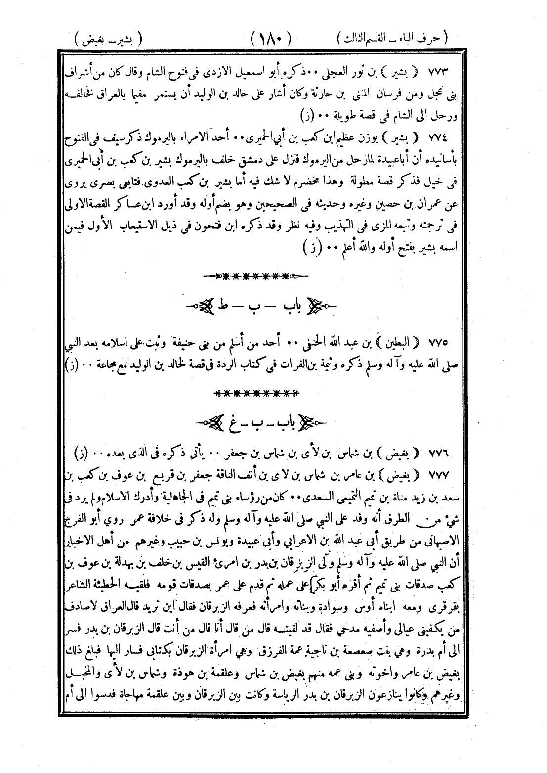 <180> بشير بن ثور العجلي ذكره أبو إسماعيل الأزدي في فتوح الشام وقال كان من أشراف بني عجل ومن فرسان المثنى بن حارثة وكان أشار على خالد بن الوليد لن يستمر مقيما بالعراق فحالفه ورحل إلى الشام في قصة طويلة بشير بوزن عظيم بن كعب بن أبي الحميري أحد الأمراء باليرموك ذكر سيف في الفتوح بأسانيده أن أبا عبيدة لما رحل من اليرموك فنزل على دمشق خلف باليرموك بشير بن كعب بن أبي الحميري في خيل فذكر قصة مطولة وهذا مخضرم لا شك فيه أما بشير بن كعب العدوي فتابعي بصري يروي عن عمران بن حصين وغيره وحديثه في الصحيحين وهو بضم أوله وقد أورد بن عساكر القصة الأولى في ترجمته وتبعه المزي في التهذيب وفيه نظر وقد ذكر بن فتحون في ذيل الاستيعاب الأول فيمن اسمه بشير بفتح أوله والله أعلم الباء بعدها الطاء البطين بن عبد الله الحنفي أحد من أسلم من بني حنيفة وثبت على إسلامه بعد وفاة النبي صلى الله عليه وسلم ذكره وثيمة بن الفرات في كتاب الردة في قصة لخالد بن الوليد مع مجاعة الباء بعدها الغين بغيض بن شماس بن لأي بن شماس بن جعفر يأتي ذكره في الذي بعده بغيض بن عامر بن شماس بن لأي بن أنف الناقة جعفر بن قريع بن عوف بن كعب بن سعد بن زيد مناة بن تميم التميمي السعدي كان من رؤساء بني تميم في الجاهلية وأدرك الإسلام ولم يرد في شيء من الطرق أنه وفد على النبي صلى الله عليه وسلم وله ذكر في خلافة عمر وروى أبو الفرج الأصبهاني من طريق أبي عبد الله بن الأعرابي وأبي عبيدة ويونس بن حبيب وغيرهم من أهل الأخبار أن النبي صلى الله عليه وسلم ولي الزبرقان بن بدو بن امرئ القيس بن خلف بن بهدلة بن عوف بن كعب صدقات بني تميم ثم اقره أبو بكر على عمله ثم قدم على عمر بصدقات قومه فلقيه الحطيئه الشاعر بقرقرى ومعه أبناه أوس وسواده وبناته وامرأته فعرفه الزبرقان فقال أين تريد قال العراق لاصادف من يكفيني عيالي واصفيه مدحى فقال لقد لقيته قال من قال أنا قال من أنت قال الزبرقان بن بدر فسر إلى أم بدرة وهي بنت صعصعه بن ناجية عمة الفرزدق وهي امرأة الزبرقان بكتابى فسار إليها فبلغ ذلك بغيض بن عامر وإخوته وبنى عمه منهم بغيض بن شماس وعلقمه بن هوذة وشماس بن لأي والمخبل وغيرهم وكانوا ينازعون الزبرقان بن بدر الرياسة وكانت بين الزبرقان وبين علقمة مهاجاة فدسوا إلى أم §
