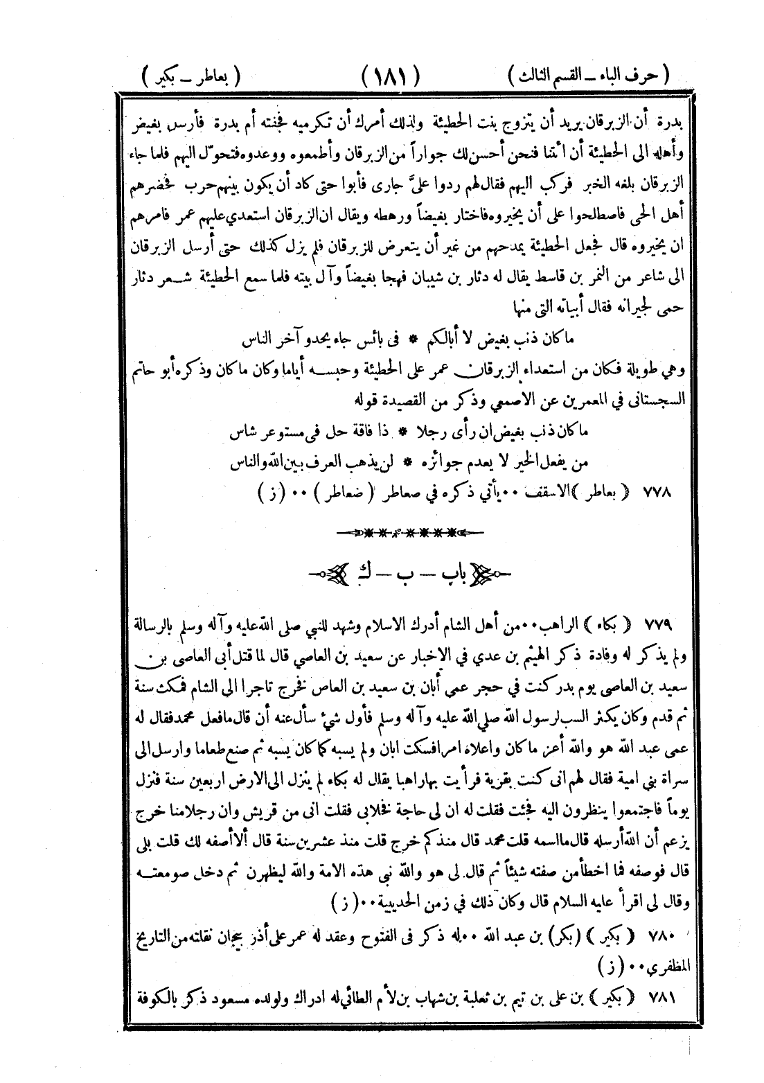 <181> بدرة أن الزبرقان يريد أن يتزوج بنت الحطيئة ولذلك أمرك أن تكرميه فجفته أم بدرة فأرسل بغيض وأهله إلى الحطيئة أن ائتنا فنحن أحسن لك جوارا من الزبرقان فاطمعوه ووعدوه فتحول إليهم فلما جاء الزبرقان بلغه الخبر فركب إليهم فقال لهم ردوا علي جاري فأبوا حتى كاد أن يكون بينهم حرب فحضرهم أهل الحي فاصطلحوا على أن يخيروه فاختار بغيضا ورهطه ويقال أن الزبرقان استعدى عليهم عمر فأمرهم أن يخيروه قال فجعل الحطيئة يمدحهم من غير أن يتعرض للزبرقان فلم يزل كذلك حتى أرسل الزبرقان إلى شاعر من النمر بن قاسط يقال له دثار بن شيبان فهجا بغيضا وآل بيته فلما سمع الحطيئة شعر دثار حمى لجيرانه فقال أبياته التي منها ما كان ذنب بغيض لا ابالكم في بائس جاء يحدو آخر الناس وهي طويلة فكان من استعداء الزبرقان عمر على الحطيئة وحبسه إياه وكان ما كان وذكره أبو حاتم السجستاني في المعمرين عن الأصمعي وذكر من القصيدة قوله ما كان ذنب بغيض أن رأى رجلا ذا فاقة حل في مستوعر شاس من يفعل الخير لا يعدم جوازيه لن يذهب العرف بين الله والناس الباء بعدها العين بعاطر الأسقف يأتي ذكره في ضغاطر الباء بعدها الكاف بكاء الراهب من أهل الشام أدرك الإسلام وشهد للنبي صلى الله عليه وسلم بالرسالة ولم يذكر له وفادة ذكر الهيثم بن عدي في الأخبار عن سعيد بن العاصي قال لما قتل أبي العاصي بن سعيد بن العاصي يوم بدر كنت في حجر عمي أبان بن سعيد بن العاص فخرج تاجرا إلى الشام فمكث سنة ثم قدم وكان يكثر السب لرسول الله صلى الله عليه وسلم فأول شيء سأل عنه أن قال ما فعل محمد فقال له عمي عبد الله هو والله أعز ما كان وأعلاه أمرا فسكت أبان ولم يسبه كما كان يسبه ثم صنع طعاما وأرسل إلى سراة بني أمية فقال لهم إني كنت بقرية فرأيت بها راهبا يقال له بكاء لم ينزل إلى الأرض أربعين سنة فنزل يوما فاجتمعوا ينظرون إليه فجئت فقلت له إن لي حاجة فخلا بي فقلت إني من قريش وإن رجلا منا خرج يزعم أن الله أرسله قال ما اسمه قلت محمد قال منذ كم خرج قلت منذ عشرين سنة قال الا اصفه لك قلت بلى قال فوصفه فما أخطأ من صفته شيئا ثم قال لي هو والله نبي هذه الأمة والله ليظهرن ثم دخل صومعته وقال لي اقرأ عليه السلام قال وكان ذلك في زمن الحديبة بكر بن عبد الله له ذكر في الفتوح وعقد له عمر على أذربيجان نقلته من التاريخ المظفري بكير بن علي بن تميم بن ثعلبة بن شهاب بن لأم الطائي له إدراك ولولده مسعود ذكر بالكوفة §