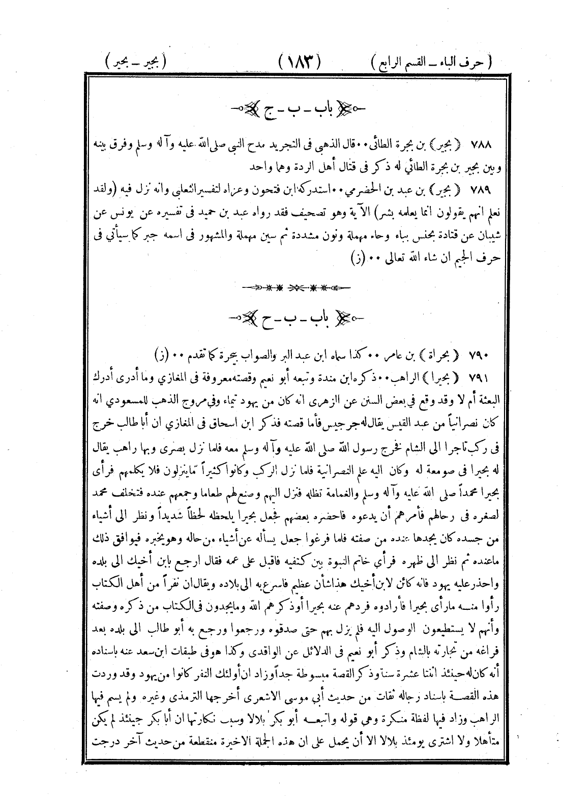 بجير بن بجرة الطائي قال الذهبي في التجريد مدح النبي صلى الله عليه وسلم وفرق بينه وبين بجير بن بجرة الطائي له ذكر في قتال أهل الردة وهما واحد بجير بن عبد بن الحضرمي استدركه بن فتحون وعزاه لتفسير الثعلبي وأنه نزل فيه ولقد نعلم أنهم يقولون إنما يعلمه بشر الآية وهو تصحيف فقد رواه عبد بن حميد في تفسيره عن يونس عن شيبان عن قتادة فقال يحنس بياء وحاء مهملة ونون مشددة ثم سين مهملة والمشهور في اسمه جبر كما سيأتي في حرف الجيم إن شاء الله تعالى الباء بعدها الحاء بحراة بن عامر كذا سماه بن عبد البر والصواب بيحرة كما تقدم بحيرا الراهب ذكره بن منده وتبعه أبو نعيم وقصته معروفة في المغازي وما أدري أدرك البعثة أم لا وقد وقع في بعض السير عن الزهري أنه كان من يهود تيماء وفي مروج الذهب للمسعودي أنه كان نصرانيا من عبد القيس يقال له جرجيس فأما قصته فذكر بن إسحاق في المغازي أن أبا طالب خرج في ركب تاجرا إلى الشام فخرج رسول الله صلى الله عليه وسلم معه فلما نزل الركب بصري وبها راهب يقال له بحيرا في صومعة له وكان إليه علم النصرانية فلما نزل الركب وكانوا كثيرا ما ينزلون فلا يكلمهم فرأى بحيرا محمدا صلى الله عليه وسلم والغمامة تظله فنزل إليهم وصنع لهم طعاما وجمعهم عنده فتخلف محمد لصغره في رحالهم فأمرهم أن يدعوه فاحضره بعضهم فجعل بحيرا يلحظه لحظا شديدا وينظر إلى أشياء من جسده كان يجدها عنده من صفته فلما فرغوا جعل يسأله عن أشياء من حاله وهو يخبره فيوافق ذلك ما عنده ثم نظر إلى ظهره فرأى خاتم النبوة بين كتفيه فأقبل على عمه فقال ارجع بابن أخيك إلى بلده واحذر عليه من يهود فإنه كائن لابن أخيك هذا شأن عظيم فأسرع به إلى بلاده ويقال إن نفرا من أهل الكتاب رأوا منه ما رأى بحيرا فارادوه فردهم عنه بحيرا وذكرهم الله وما يجدون في الكتاب من ذكره وصفته وأنهم لا يستطيعون الوصول إليه فلم يزل بهم حتى صدقوه ورجعوا ورجع به أبو طالب إلى بلده بعد فراغه من تجارته بالشام وذكر أبو نعيم في الدلائل عن الواقدي وكذا هو في طبقات بن سعد عنه بإسناده أنه كان له حينئذ اثنتا عشرة سنة وذكر القصة مبسوطة جدا وزاد إن أولئك النفر كانوا من يهود وقد وردت هذه القصة بإسناد رجاله ثقات من حديث أبي موسى الأشعري أخرجها الترمذي وغيره ولم يسم فيها الراهب وزاد فيها لفظة منكرة وهي قوله واتبعه أبو بكر بلالا وسبب نكارتها أن أبا بكر حينئذ لم يكن متأهلا ولا اشترى يومئذ بلالا الا أن يحمل على أن هذه الجملة الأخيرة مقتطعة من حديث آخر أدرجت §