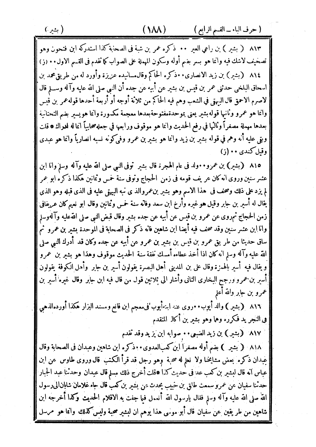 <188> بشير بن راعي العير ذكره عمر بن شبة في الصحابة كذا استدركه بن فتحون وهو تصحيف لا شك فيه وإنما هو بسر بضم أوله وسكون المهملة على الصواب كما تقدم في القسم الأول بشير بن زيد الأنصاري ذكره الحاكم وقال مسانيده عزيزة وأورد له من طريق محمد بن إسحاق البلخي حدثني عمر بن قيس بن بشير عن أبيه عن جده أن النبي صلى الله عليه وسلم قال الأصرم الاحمق قال البيهقي في الشعب وهم فيه الحاكم من ثلاثة أوجه أو أربعة أحدها قوله عمر بن قيس وإنما هو عمرو وثانيها قوله بشير يعني بموحدة مفتوحة بعدها معجمة مكسورة وإنما هو يسير بضم التحتانية بعدها مهملة مصغرا وثالثها في رفع الحديث وإنما هو موقوف ورابعها في جعله صحابيا وإنما له إدراك قلت وبقي عليه أنه وهم في قوله بشير بن زيد وإنما هو بشير بن عمرو وفي كونه نسبه أنصاريا وإنما هو عبدي وقيل كندي بشير بن عمرو ولد في عام الهجرة قال بشير توفي النبي صلى الله عليه وسلم وأنا بن عشر سنين وروى أنه كان عريف قومه في زمن الحجاج توفي سنة خمس وثمانين هكذا ذكره أبو عمر لم يزد على ذلك وصحف في هذا الاسم وهو بشير بن عمرو الذي نبه البيهقي عليه في الذي قبله وهو الذي يقال له أسير بن جابر وقيل هو غيره وأرخ بن سعد وفاته سنة خمس وثمانين وقال أبو نعيم كان عريفا في زمن الحجاج ثم روى عن عمرو بن قيس عن أبيه عن جده بشير وقال قبض النبي صلى الله عليه وسلم وأنا بن عشر سنين وقد صحف فيه أيضا بن شاهين فإنه ذكر في الصحابة في الموحدة بشير بن عمرو ثم ساق حديثا من طريق عمرو بن قيس بن بشير بن عمرو عن أبيه عن جده وكان قد أدرك النبي صلى الله عليه وسلم إنه كان إذا أخذ عطاءه أمسك نفقة سنة الحديث موقوف وهذا هو يسير بن عمرو ويقال أسير بالهمزة وقال علي بن المديني أهل البصرة يقولون أسير بن جابر وأهل الكوفة يقولون أسير بن عمرو ورجح البخاري الثاني وأشار إلى تليين قول من قال فيه بن جابر وقال غيره أسير بن عمرو بن جابر والله أعلم بشير والد أيوب روى عنه ابنه أيوب في معجم بن قانع ومسند البزار هكذا وأورده الذهبي في التجريد فكرره وهما وهو بشير بن أكال المتقدم بشير بن زيد الضبعي صوابه بن يزيد وقد تقدم بشير بضم أوله مصغرا بن كعب العدوي ذكره بن شاهين وابن عبدان في الصحابة وقال عبدان ذكره بعض مشايخنا ولا نعلم له صحبة وهو رجل قد قرأ الكتب قال وروى طاوس عن بن عباس أنه قال لبشير بن كعب عد في حديث كذا قلت أخرج ذلك مسلم قال عبدان وحدثنا عبد الجبار حدثنا سفيان عن عمر وسمعت طلق بن حبيب يحدث عن بشير بن كعب قال جاء غلامان شابان إلى رسول الله صلى الله عليه وسلم فقالا يا رسول الله أنعمل فيما جفت به الأقلام الحديث وكذا أخرجه بن شاهين من طريقين عن سفيان قال أبو موسى هذا يوهم أن لبشير صحبة وليس كذلك وإنما هو مرسل §