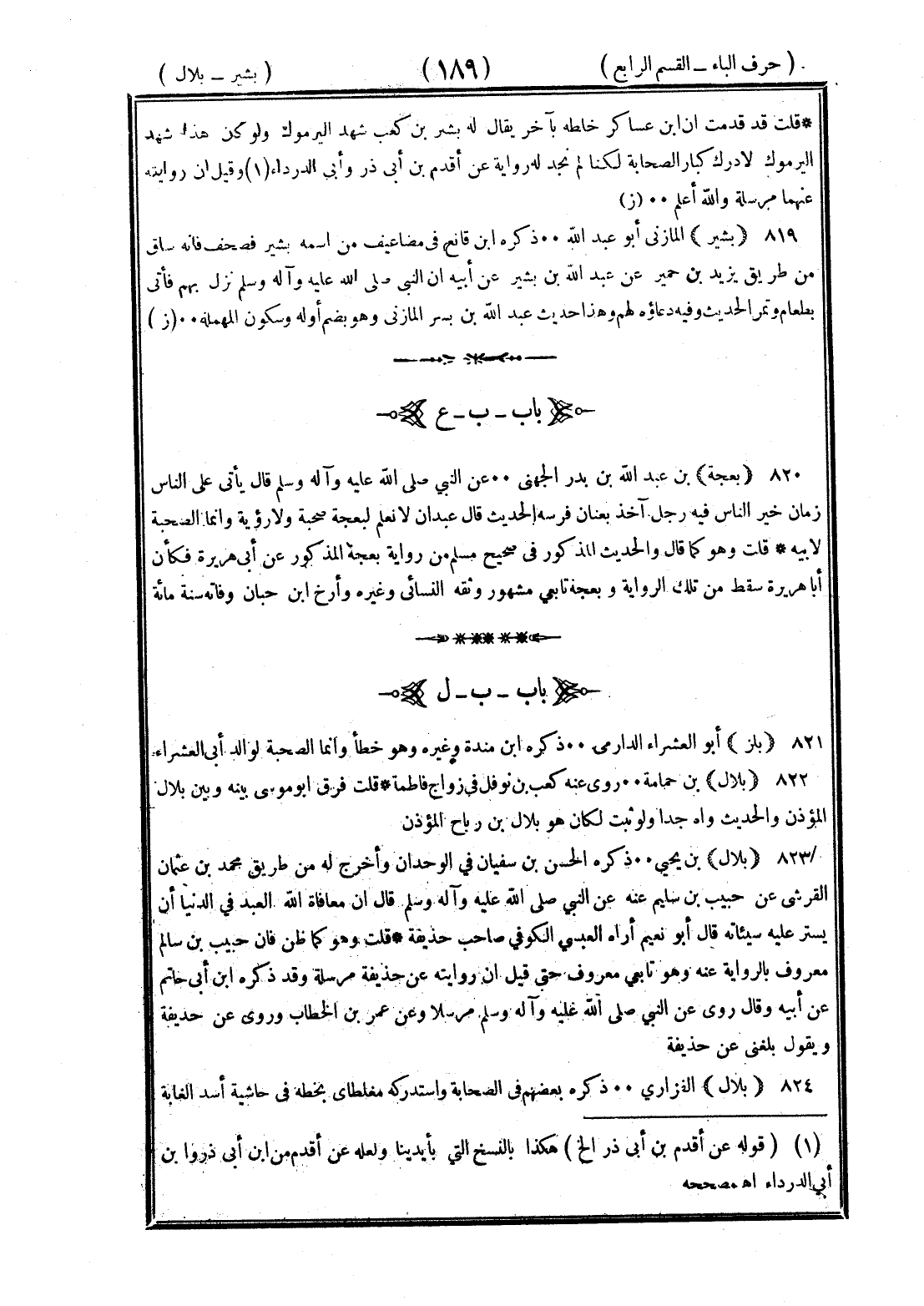 <189> قلت قد قدمت أن بن عساكر خلطه بآخر يقال له بشير بن كعب شهد اليرموك ولو كان هذا شهد اليرموك لأدرك كبار الصحابة لكنا لم نجد له رواية عن أقدم من أبي ذر وأبي الدرداء وقيل إن روايته عنهما مرسلة والله أعلم بشير المازني أبو عبد الله ذكره بن قانع في تضاعيف من اسمه بشير فصحف فإنه ساق من طريق يزيد بن حمير عن عبد الله بن بشير عن أبيه أن النبي صلى الله عليه وسلم نزل بهم فأتى بطعام وتمر وفيه دعاؤه لهم وهذا حديث عبد الله بن بشر المازني وهو بضم أوله وسكون المهملة الباء بعدها العين بعجة بن عبد الله بن بدر الجهني ذكره عبدان وأورد له حديثا مرسلا من طريق أسامة بن زيد عن بعجة الجهني عن النبي صلى الله عليه وسلم قال يأتي على الناس زمان خير الناس فيه رجل آخذ بعنان فرسه الحديث قال عبدان لا نعلم لبعجة صحبة ولا رؤية وإنما الصحبة لأبيه قلت وهو كما قال والحديث المذكور في صحيح مسلم من رواية بعجة المذكور عن أبي هريرة فكأن أبا هريرة سقط من تلك الرواية وبعجة تابعي مشهور وثقة النسائي وغيره وأرخ بن حبان وفاته سنة مائة الباء بعدها اللام بلز ايو العشراء الدارمي ذكره بن منده وغيره وهو خطأ وإنما الصحبة لوالد أبي العشراء بلال بن حمامة يروي عنه كعب بن نوفل في زواج فاطمة قلت فرق أبو موسى بينه وبين بلال المؤذن والحديث واه جدا ولو ثبت لكان هو بلال بن رباح المؤذن بلال بن يحيى ذكره الحسن بن سفيان في الوحدان وأخرج له من طريق محمد بن عثمان القرشي عن حبيب بن سليم عنه عن النبي صلى الله عليه وسلم قال إن معافاة الله العبد في الدنيا أن يستر عليه سيئاته قال أبو نعيم أراه العبسي الكوفي صاحب حذيفة قلت وهو كما ظن فإن حبيب بن سالم معروف بالرواية عنه وهو تابعي معروف حتى قيل إن روايته عن حذيفة مرسلة وقد ذكره بن أبي حاتم عن أبيه وقال روى عن النبي صلى الله عليه وسلم مرسلا وعن عمر بن الخطاب وروى عن حذيفة ويقول بلغني عن حذيفة بلال الفزاري ذكره بعضهم في الصحابة واستدركه مغلطاي بخطه في حاشية أسد الغابة §