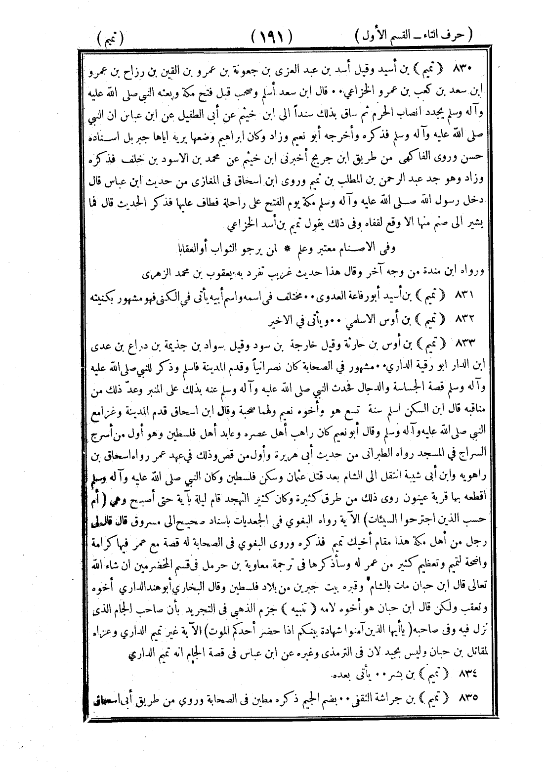 <191> تميم بن أسيد وقيل أسد بن عبد العزى بن جعونة بن عمرو بن القين بن رزاح بن عمرو بن كعب بن عمرو الخزاعي قال بن سعد أسلم وصحب قبل فتح مكة وبعثة النبي صلى الله عليه وسلم يجدد انصاب الحرم ثم ساق بذلك سندا إلى بن خثيم عن أبي الطفيل عن بن عباس أن النبي صلى الله عليه وسلم فذكره وأخرجه أبو نعيم وزاد وكان إبراهيم وضعها يريه إياها جبريل إسناده حسن وروى الفاكهي من طريق بن جريج أخبرني بن خثيم عن محمد بن الأسود بن خلف فذكره وزاد وهو جد عبد الرحمن بن المطلب بن تميم وروى بن إسحاق في المغازي من حديث بن عباس قال دخل رسول الله صلى الله عليه وسلم مكة يوم الفتح على راحلة فطاف عليها فذكر الحديث قال فما يشير إلى ضم منها إلا وقع لقفاه وفي ذلك يقول تميم بن أسد الخزاعي وفي الأصنام معتبر وعلم لمن يرجو الثواب أو العقابا ورواه بن منده من وجه آخر وقال هذا حديث غريب تفرد به يعقوب بن محمد الزهري تميم بن أسيد أبو رفاعة العدوي مختلف في اسمه واسم أبيه يأتي في الكنى فهو مشهور بكنيته تميم بن أوس الأسلمي ويأتي في الأخير تميم بن أوس بن حارثة وقيل خارجة بن سود وقيل سواد بن جذيمة بن ذراع بن عدي بن الدار أبو رقية الداري مشهور في الصحابة كان نصرانيا وقدم المدينة فأسلم وذكر النبي صلى الله عليه وسلم قصة الجساسة والدجال فحدث النبي صلى الله عليه وسلم عنه بذلك على المنبر وعد ذلك من مناقبة قال بن السكن أسلم سنة تسع هو وأخوه نعيم ولهما صحبة وقال بن إسحاق قدم المدينة وغزا مع النبي صلى الله عليه وسلم وقال أبو نعيم كان راهب أهل فلسطين وعابد أهل فلسطين وهو أول من اسرج السراج في المسجد روى الطبراني من حديث أبي هريرة وأول من قص وذلك في عهد عمر رواه إسحاق بن راهويه وابن أبي شيبة انتقل إلى الشام بعد قتل عثمان وسكن فلسطين وكان النبي صلى الله عليه وسلم أقطعه بها قرية عينون روى ذلك من طرق كثيرة وكان كثير التهجد قام ليلة بآية حتى أصبح وهي أم حسب الذين اجترحوا السيئات الآية رواه البغوي في الجعديات بإسناد صحيح إلى مسروق قال قال لي رجل من أهل مكة هذا مقام أخيك تميم فذكره وروى البغوي في الصحابة له قصة مع عمر فيها كرامة واضحة تميم وتعظم كثير من عمر له وسأذكرها في ترجمة معاوية بن حرمل في قسم المخضرمين إن شاء الله تعالى قال بن حبان مات بالشام وقبره ببيت جبرين من بلاد فلسطين وقال البخاري أبو هند الداري أخوه وتعقب ولكن قال بن حبان هو أخوه لأمه تنبيه جزم الذهبي في التجريد بأن صاحب الجام الذي نزل فيه وفي صاحبه يا أيها الذين آمنوا شهادة بينكم إذا حضر أحدكم الموت الآية غير تميم الداري وعزاه لمقاتل بن حيان وليس بجيد لأن في الترمذي وغيره عن بن عباس في قصة الجام أنه تميم الداري تميم بن بشر يأتي بعده تميم بن جراشة الثقفي بضم الجيم ذكره مطين في الصحابة وروى من طريق أبي إسحاق §
