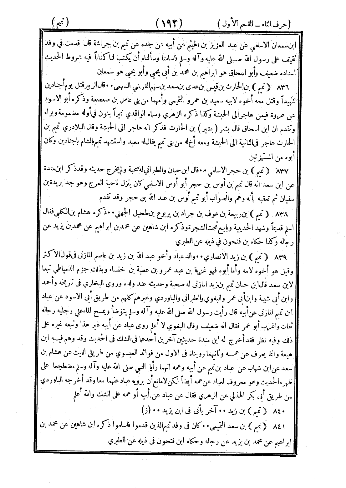 <192> بن سمعان الأسلمي عن عبد العزيز بن الهيثم عن أبيه عن جده عن تميم بن جراشة قال قدمت في وفد ثقيف على رسول الله صلى الله عليه وسلم فأسلمنا وسألناه أن يكتب لنا كتابا فيه شروط الحديث إسناده ضعيف وأبو إسحاق هو إبراهيم بن محمد بن أبي يحيى وأبو يحيى هو سمعان تميم بن حارث بن قيس بن عدي بن سعد بن سهم القرشي السهمي قال الزبير قتل يوم أجنادين شهيدا وقتل معه أخوه لأمه سعيد بن عمرو التميمي وأمها من بني عامر بن صعصعة وذكره أبو الأسود عن عروة فيمن هاجر إلى الحبشة وكذا ذكره الزهري وسماه الواقدي نميرا بنون في أوله مضمومة وبراء وتقدم أن بن إسحاق قال بشير بن الحارث فذكر أنه هاجر إلى الحبشة وقال البلاذري تميم بن الحارث هاجر في الثانية إلى الحبشة ومعه أخ له من بني تميم يقال له معبد واستشهد تميم بالشام بأجنادين وكان أبوه من المستهزئين تميم بن حجر الأسلمي قال بن حبان والطبراني له صحبة ولم يخرج حديثه وقد ذكر بن منده عن بن سعد أنه قال تميم بن أوس بن حجر أبو أوس الأسلمي كان ينزل ناحية العرج وهو جد بريدة بن سفيان ثم تعقبه بأنه وهم والصواب أبو تميم أوس بن عبد الله بن حجر وقد تقدم تميم بن ربيعة بن عوف بن جراد بن يربوع بن طحيل الجهني ذكره بن هشام بن الكلبي فقال أسلم قديما وشهد الحديبية وبايع تحت الشجرة وذكره بن شاهين عن محمد بن إبراهيم عن محمد بن يزيد عن رجاله وكذا بن فتحون في ذيله عن الطبري تميم بن زيد الأنصاري والد عباد وأخو عبد الله بن زيد بن عاصم المازني في قول الأكثر وقيل هو أخوه لأمه وأما أبوه فهو غزية بن عبد عمرو بن عطية بن خنساء بذلك جزم الدمياطي تبعا لابن سعد قال بن حبان تميم بن زيد المازني له صحبة وحديثه عن ولده وروى البخاري في تاريخه وأحمد بن أبي شيبة وابن أبي عمرو البغوي والطبراني والباوردي وغيرهم كلهم من طريق أبي الأسود عن عباد بن تميم المازني عن أبيه قال رأيت رسول الله صلى الله عليه وسلم يتوضأ ويمسح الماء على رجليه رجاله ثقات وأغرب أبو عمر فقال إنه ضعيف وقال البغوي لا أعلم روى عباد عن أبيه غير هذا وتبعه غيره على ذلك وفيه نظر فقد أخرج له بن منده حديثين آخرين أحدهما في الشك في الحديث وقد وهم فيه بن لهيعة وإنما يعرف عن عمه وثانيهما ورويناه في الأول من فوائد العيسوي من طريق الليث عن هشام بن سعد عن بن شهاب عن عباد بن تميم عن أبيه وعمه أنهما رأيا النبي صلى الله عليه وسلم مضطجعا على ظهره الحديث وهو معروف لعباد عن عمه أيضا لكن لا مانع أن يرويه عباد عنهما معا وقد أخرجه الباوردي من طريق أبي بكر الهذلي عن الزهري فقال عن عباد عن أبيه أو عمه على الشك والله أعلم تميم بن زيد آخر يأتي في بن يزيد تميم بن سعد التميمي كان في وفد تميم الذين قدموا فأسلموا ذكره بن شاهين عن محمد بن إبراهيم عن محمد بن يزيد عن رجاله وحكاه بن فتحون في ذيله عن الطبري §