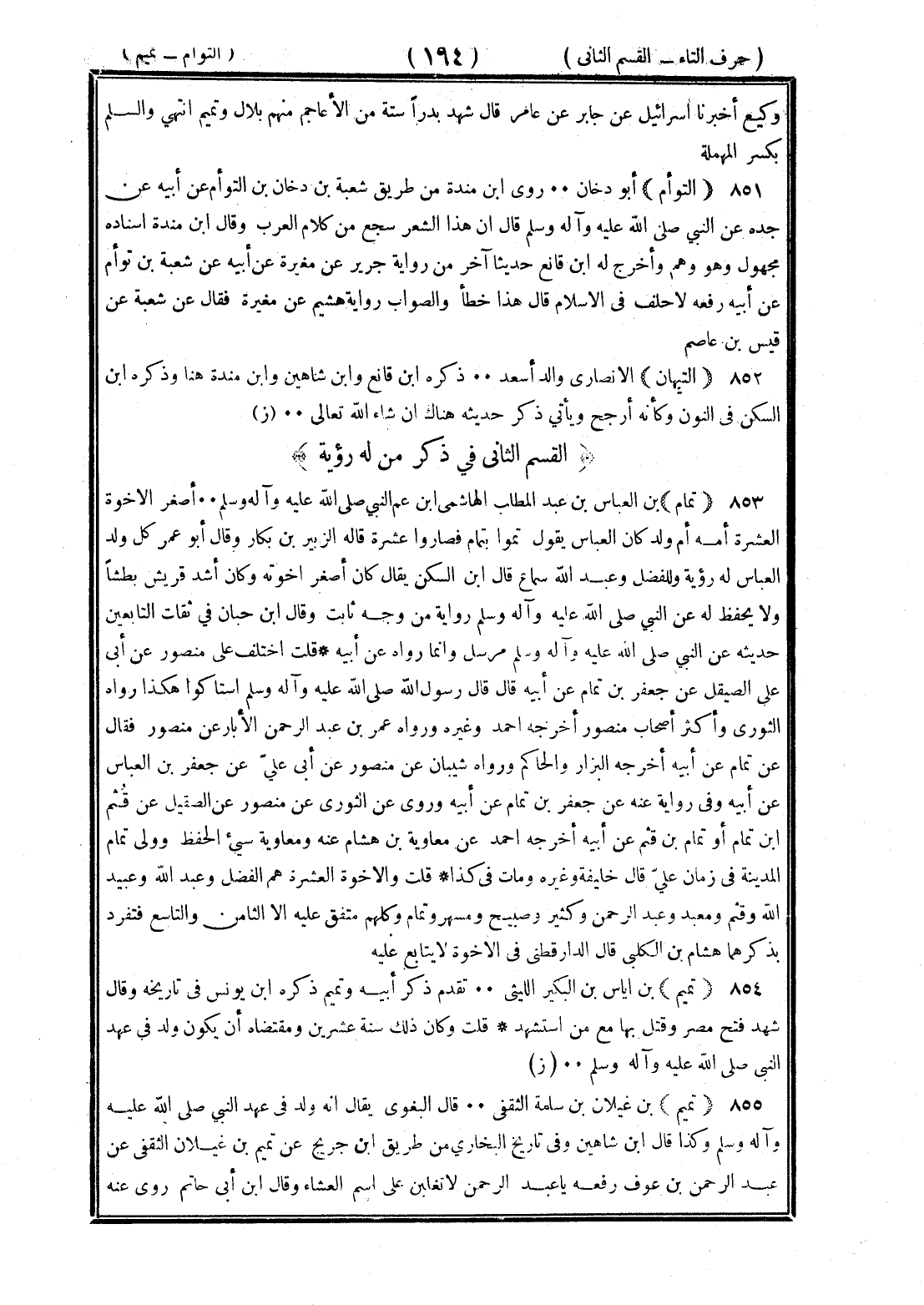 <194> وكيع أخبرنا إسرائيل عن جابر عن عامر قال شهد بدرا ستة من الأعاجم منهم بلال وتميم انتهى والسلم بكسر السين المهملة التاء بعدها الواو والياء التوأم أبو دخان روى بن منده من طريق شعبة بن دخان بن التوأم عن أبيه عن جده عن النبي صلى الله عليه وسلم قال إن هذا الشعر سجع من كلام العرب وقال بن منده إسناده مجهول وهو وهم وأخرج له بن قانع حديثا آخر من رواية جرير عن مغيرة عن أبيه عن شعبة بن توأم عن أبيه رفعه لا حلف في الإسلام قال هذا خطأ والصواب رواية هشيم عن مغيرة فقال عن شعبة عن قيس بن عاصم التيهان الأنصاري والد أسعد ذكره بن قانع وابن شاهين وابن منده هنا وذكره بن السكن في النون وكأنه أرجح ويأتي ذكر حديثه هناك إن شاء الله تعالى القسم الثاني في ذكر من له رؤية التاء بعدها الميم تمام بن العباس بن عبد المطلب الهاشمي بن عم النبي صلى الله عليه وسلم أصغر الإخوة أمه أم ولد كان العباس يقول تموا بتمام فصاروا عشرة قاله الزبير بن بكار وقال أبو عمر كل ولد العباس له رؤية وللفضل وعبد الله سماع قال بن السكن يقال كان أصغر إخوته وكان أشد قريش بطشا ولا يحفظ له عن النبي صلى الله عليه وسلم رواية من وجه ثابت وقال بن حبان في ثقات التابعين حديثه عن النبي صلى الله عليه وسلم مرسل وإنما رواه عن أبيه قلت اختلف على منصور عن أبي علي الصيقل عن جعفر بن تمام عن أبيه قال قال رسول الله صلى الله عليه وسلم استاكوا هكذا رواه الثوري وأكثر أصحاب منصور وأخرجه أحمد وغيره ورواه عمر بن عبد الرحمن الأبار عن منصور فقال عن تمام عن أبيه أخرجه البزار والحاكم ورواه شيبان عن منصور عن أبي علي عن جعفر بن العباس عن أبيه وفي رواية عنه عن جعفر بن تمام عن أبيه وروى عن الثوري عن منصور عن الصقيل عن قثم بن تمام أو تمام بن قثم عن أبيه أخرجه أحمد عن معاوية بن هشام عنه ومعاوية سيء الحفظ ولي تمام المدينة في زمان علي قال حليفة وغيره ومات في قلت والاخوة العشرة هم الفضل وعبد الله وعبيد الله وقثم ومعبد وعبد الرحمن وكثير وصبيح ومسهر وتمام وكلهم متفق عليه الا الثامن والتاسع فتفرد بذكرهما هشام بن الكلبي قال الدارقطني في الإخوة لا يتابع عليه تميم بن إياس بن البكير الليثي تقدم ذكر أبيه وتميم ذكره أبو يونس في تاريخه وقال شهد فتح مصر وقتل بها مع من استشهد قلت وكان ذلك سنة عشرين ومقتضاه أن يكون ولد في عهد النبي صلى الله عليه وسلم تميم بن غيلان بن سلمة الثقفي قال البغوي يقال إنه ولد في عهد النبي صلى الله عليه وسلم وكذا قال بن شاهين وفي تاريخ البخاري من طريق بن جريج عن تميم بن غيلان الثقفي عن الرحمن بن عوف رفعه يا عبد الرحمن لا تغلبن على اسم العشاء وقال بن أبي حاتم روى عنه §