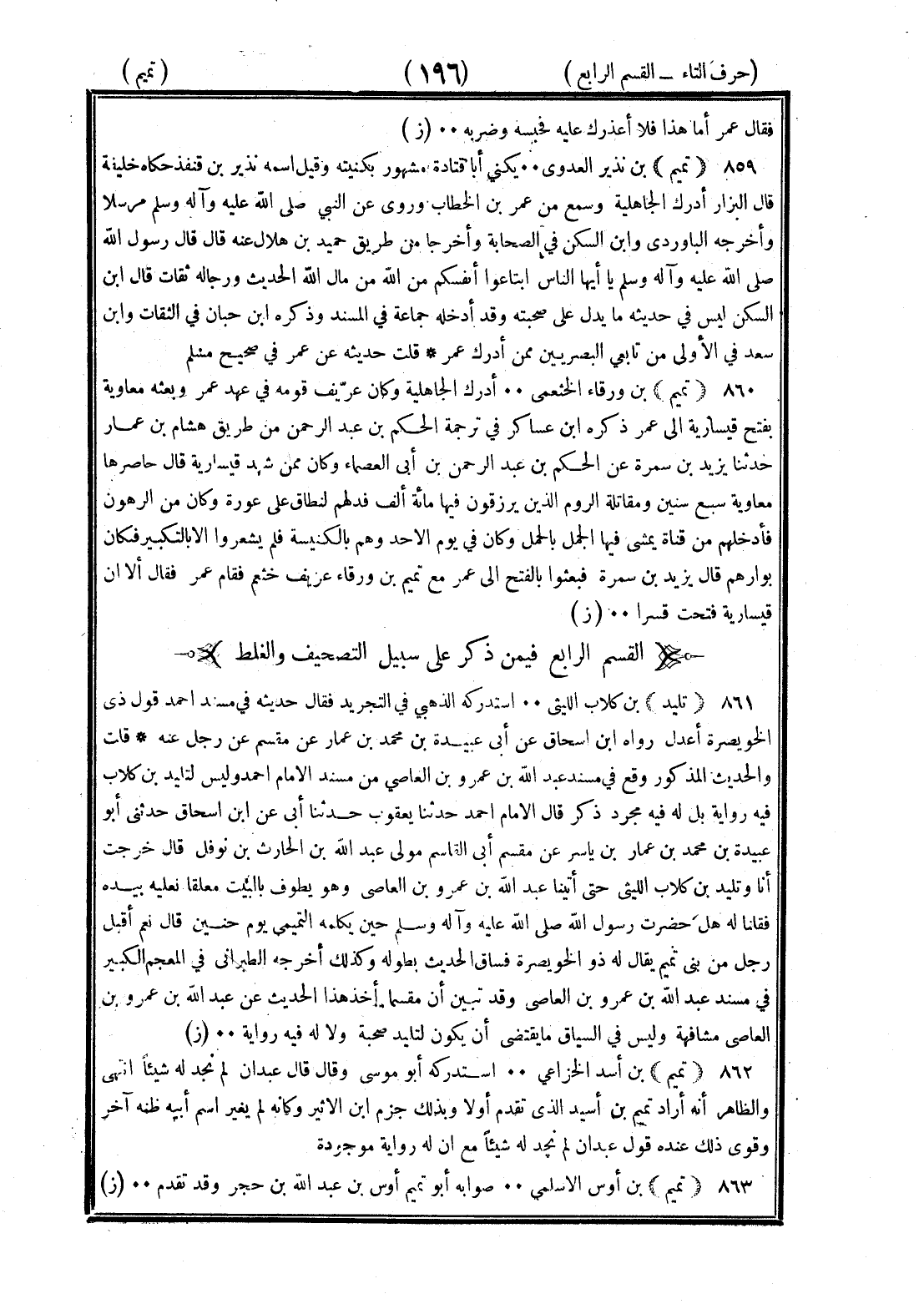 <196> فقال عمر أما هذا فلا اعذرك عليه فحبسه وضربه تميم بن نذير العدوي يكنى أبا قتادة مشهور بكنيته وقيل اسمه بدير بن قنفذ حكاه خلفية قال البزار أدرك الجاهلية وسمع من عمر بن الخطاب وروى عن النبي صلى الله عليه وسلم مرسلا وأخرجه الباوردي وابن السكن في الصحابة وأخرجا من طريق حميد بن هلال عنه قال قال رسول الله صلى الله عليه وسلم يأيها الناس ابتاعوا أنفسكم من الله من مال الله الحديث ورجاله ثقات قال بن السكن ليس في حديثه ما يدل على صحبته وقد أدخله جماعة في المسند وذكره بن حبان في الثقات وابن سعد في الأولى من تابعي البصريين ممن أدرك عمر قلت حديثه عن عمر في صحيح مسلم تميم بن ورقاء الخثعمي أدرك الجاهلية وكان عريف قومه في عهد عمر وبعثه معاوية بفتح قيسارية إلى عمر ذكره بن عساكر في ترجمة الحكم بن عبد الرحمن من طريق هشام بن عمار حدثنا يزيد بن سمرة عن الحكم بن عبد الرحمن بن أبي العصماء وكان ممن شهد قيسارية قال حاصرها معاوية سبع سنين ومقاتلة الروم الذين يرزقون فيها مائة ألف فدلهم النطاق على عورة وكان من الرهون فأدخلهم من قناة يمشي فيها الجمل بالحمل وكان في يوم الأحد وهم بالكنيسة فلم يشعروا الا بالتكبير فكان بوارهم قال يزيد بن سمرة فبعثوا بالفتح إلى عمر مع تميم بن ورقاء عريف خثعم فقام عمر فقال الا إن قيسارية فتحت قسرا القسم الرابع فيمن ذكر على سبيل التصحيف والغلط التاء بعدها اللام والميم تليد بن كلاب الليثي استدركه الذهبي في التجريد فقال حديثه في مسند أحمد قول ذي الحويصرة أعدل رواه بن إسحاق عن أبي عبيدة بن محمد بن عمار عن مقسم عن رجل عنه قلت والحديث المذكور وقع في مسند عبد الله بن عمرو بن العاص من مسند الإمام أحمد وليس لتليد بن كلاب فيه رواية بل له فيه مجرد ذكر قال الإمام أحمد حدثنا يعقوب حدثنا أبي عن بن إسحاق حدثني أبو عبيدة بن محمد بن عمار بن ياسر عن مقسم أبي العباس مولى عبد الله بن الحارث بن نوفل قال خرجت أنا وتليد بن كلاب الليثي حتى أتينا عبد الله بن عمرو بن العاصي وهو يطوف بالبيت معلقا نعليه بيده فقلنا له هل حضرت رسول الله صلى الله عليه وسلم حين يكلمه التميمي يوم حنين قال نعم أقبل رجل من بني تميم يقال له ذو الحويصرة فساق الحديث بطوله وكذا أخرجه الطبراني في المعجم الكبير في مسند عبد الله بن عمرو بن العاصي وقد تبين أن مقسما أخذ هذا الحديث عن عبد الله بن عمرو بن العاصي مشافهة وليس في السياق ما يقتضي أن يكون لتليد صحبة ولا له فيه رواية تميم بن أسد الخزاعي استدركه أبو موسى وقال قال عبدان لم نجد له شيئا انتهى والظاهر أنه أراد تميم بن أسيد الذي تقدم أولا وبذلك حزم بن الأثير وكأنه لما تغير اسم أبيه ظنه آخر وقوى ذلك عنده قول عبدان لم نجد له شيئا مع أن له رواية موجودة تميم بن أوس الأسلمي صوابه أبو تميم أوس بن عبد الله بن حجر وقد تقدم §