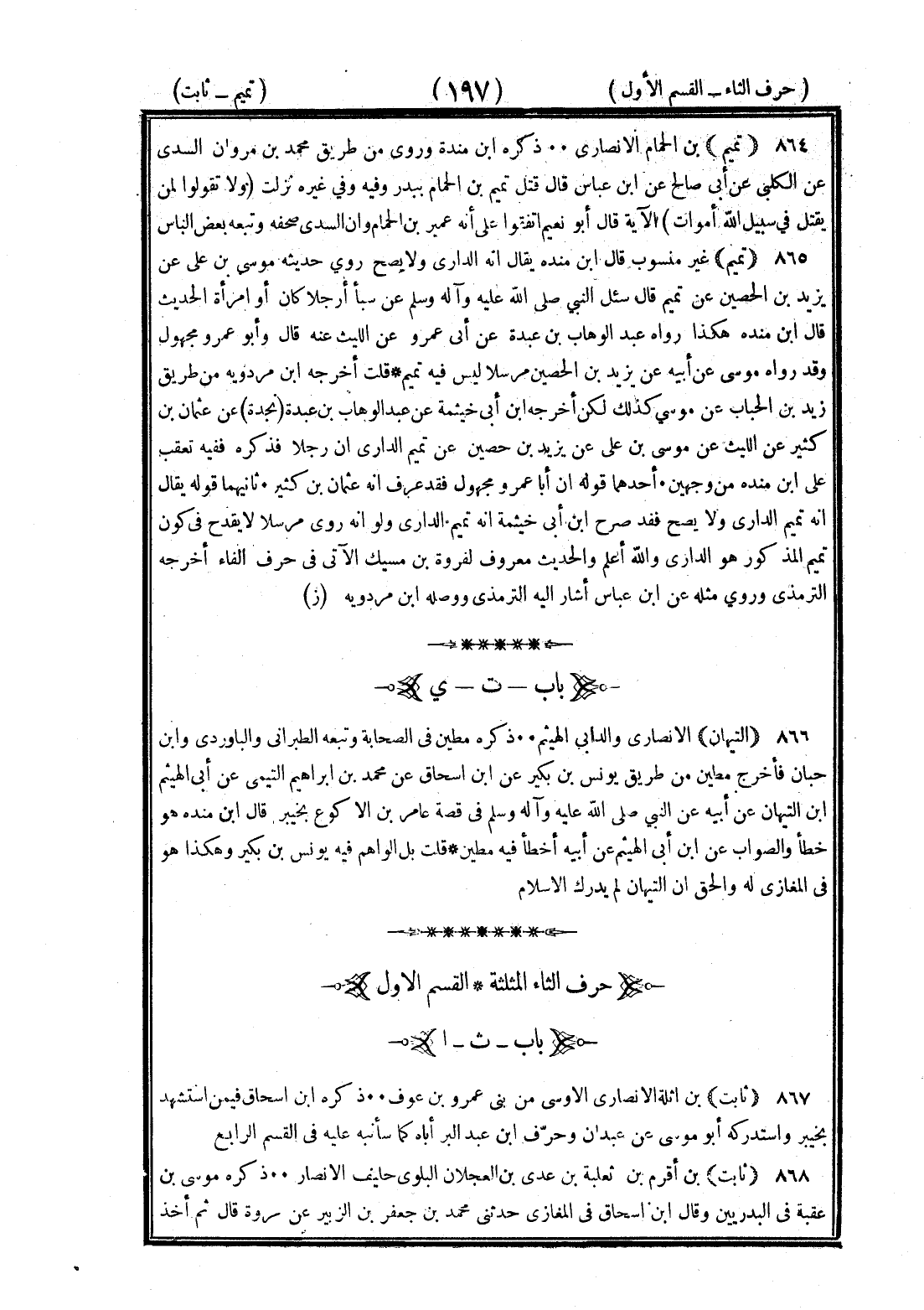 <197> تميم بن الحمام الأنصاري ذكره بن منده وروى من طريق محمد بن مروان السدي عن الكلبي عن أبي صالح عن بن عباس قال قتل تميم بن الحمام ببدر وفيه وفي غيره نزلت ولا تقولوا لمن يقتل في سبيل الله أموات الآية قال أبو نعيم اتفقوا على أنه عمرو بن الحمام وأن السدي صحفه وتبعه بعض الناس تميم غير منسوب قال بن منده يقال إنه الداري ولا يصح روى حديثه موسى بن علي عن يزيد بن الحصين عن تميم قال سئل النبي صلى الله عليه وسلم عن سبأ ارجلا كان أو امرأة الحديث قال بن منده هكذا رواه عبد الوهاب بن عبدة عن أبي عمرو عن الليث عنه قال وأبو عمرو مجهول وقد رواه موسى عن أبيه عن يزيد بن الحصين مرسلا ليس فيه تميم قلت أخرجه بن مردويه من طريق زيد بن الحباب عن موسى كذلك لكن أخرجه بن أبي خيثمة عن عبد الوهاب بن عبدة عن عثمان بن كثير عن الليث عن موسى بن علي عن يزيد بن حصين عن تميم الداري أن رجلا فذكره ففيه تعقب على بن منده من وجهين أحدهما قوله إن أبا عمرو مجهول فقد عرف أنه عثمان بن كثير ثانيها قوله يقال إنه تميم الداري ولا يصح فقد صرح بن أبي خيثمة أنه تميم الداري وكونه روى مرسلا لا يقدح في كون تميم المذكور هو الداري والله أعلم والحديث معروف لفروة بن مسيك الآتي في حرف الفاء أخرجه الترمذي وروى مثله عن عباس أشار إليه الترمذي ووصله بن مردويه التاء بعدها الياء المثناة من تحت التيهان الأنصاري والد أبي الهيثم ذكره مطين في الصحابة وتبعه الطبراني والباوردي وابن حبان فأخرج مطين من طريق يونس بن بكير عن بن إسحاق عن محمد بن إبراهيم التيمي عن أبي الهيثم بن التيهان عن أبيه عن النبي صلى الله عليه وسلم في قصة عامر بن الأكوع بخيبر قال بن منده وهو خطأ والصواب عن بن أبي الهيثم عن أبيه أخطأ فيه مطين قلت بل الواهم فيه يونس بن بكير وهكذا هو في المغازي له والحق أن التيهان لم يدرك الإسلام