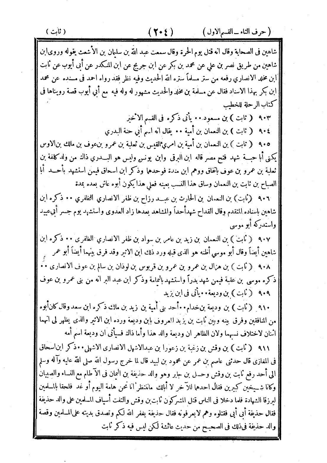 <204> شاهين في الصحابة وقال إنه قتل يوم الحرة وقال سمعت عبد الله بن سليمان بن الأشعث يقوله وروى بن شاهين من طريق نصر بن علي عن محمد بن بكر عن بن جريج عن بن المنكدر عن أبي أيوب عن ثابت بن مخلد الأنصاري رفعه من ستر مسلما ستره الله الحديث وفيه نظر فقد رواه أحمد في مسنده عن محمد بن بكر بهذا الإسناد فقال عن مسلمة بن مخلد والحديث مشهور له وله فيه مع أبي أيوب قصة رويناها في كتاب الرحلة للخطيب ثابت بن مسعود يأتي ذكره في القسم الأخير ثابت بن النعمان بن أمية ويقال إنه اسم أبي حبة البدري ثابت بن النعمان بن أمية بن امرئ القيس بن ثعلبة بن عمرو بن عوف بن مالك بن الأوس يكنى ابا حبة شهد فتح مصر قاله بن البرقي وابن يونس وليس هو البدري ذاك من ولد كلفة بن ثعلبة بن عمرو بن عوف باتفاق ووهم بن منده فوحدهما وذكر بن إسحاق فيمن استشهد بأحد أبا الصباح بن ثابت بن النعمان وساق هذا النسب بعينه فعلى هذا يكون أبوه عاش بعده بمدة ثابت بن النعمان بن الحارث بن عبد رزح بن ظفر الأنصاري الظفري ذكره بن شاهين بإسناد المتقدم وقال القداح شهد أحدا والمشاهد بعدها زاد العدوي واستشهد يوم جسر أبي عبيد واستدركه أبو موسى ثابت بن النعمان بن زيد بن عامر بن سواد بن ظفر الأنصاري الظفري ذكره بن شاهين أيضا وقال أبو موسى أظنه هو الذي قبله ورد ذلك بن الأثير وقد فرق بينهما أيضا أبو عمر ثابت بن هزال بن عمرو بن عمر بن قربوس بن لوذان بن سالم بن عوف الأنصاري ذكره موسى بن عقبة فيمن شهد بدرا واستشهد باليمامة وذكر بن عبد البر أنه من بني عمرو بن عوف ثابت بن وديعة يأتي في بن يزيد ثابت بن وديعة بن خذام أحد بني أمية بن زيد بن مالك ذكره بن سعد وقال كان أبوه من المنافقين وفرق بينه وبين ثابت بن يزيد والمعروف بن وديعة ورده بن الأثير والذي يظهر إنهما اثنان لاختلاف نسبهما ولان الظاهر أن وديعة والد هذا وأما ذاك فسياتي أن وديعة اسم أمه ثابت بن وقش بن زغبة بن زعوراء بن عبد الأشهل الأنصاري الأشهلي ذكر بن إسحاق في المغازي قال حدثني عاصم بن عمر عن محمود بن لبيد قال لما خرج رسول الله صلى الله عليه وسلم إلى أحد رفع ثابت بن وقش وحسل بن جابر وهو والد حذيفة بن اليمان في الآطام مع النساء والصبيان وكانا شيخين كبيرين فقال أحدهما للآخر لاابا لك ما ننتظر إنما نحن هامة اليوم أو غدا فلحقا بالمسلمين ليرزقا الشهادة فلما دخلا في الناس قتل المشركون ثابت بن وقش والتفت اسياف المسلمين على والد حذيفة فقال حذيفة أبي أبي فقتلوه وهم لا يعرفونه فقال حذيفة يغفر الله لكم وتصدق بديته على المسلمين وقصة والد حذيفة في ذلك في الصحيح من حديث عائشة لكن ليس فيه ذكر ثابت §