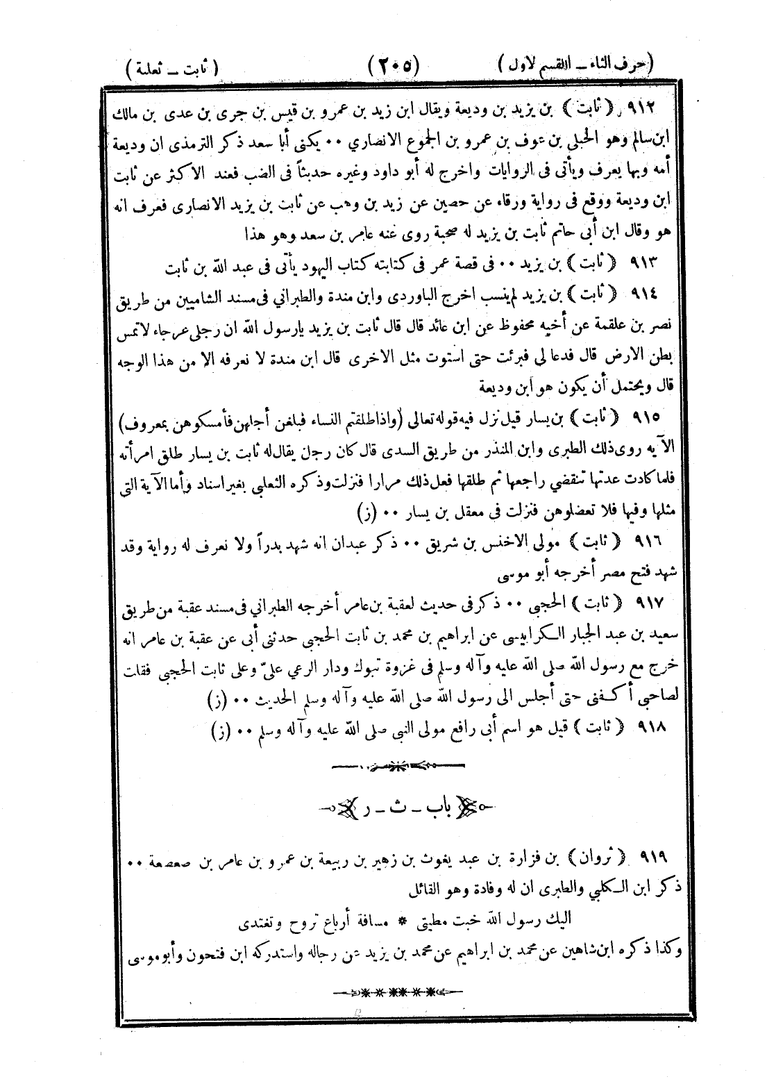 <205> ثابت بن يزيد بن وديعة ويقال بن زيد بن عمرو بن قيس بن جزى بن عدي بن مالك بن سالم وهو الحبلي بن عوف بن عمرو بن الجموح الأنصاري يكنى أبا سعد ذكر الترمذي أن وديعة أمه وبها يعرف ويأتي في الروايات وأخرج له أبو داود وغيره حديثا في الضب فعند الأكثر عن ثابت بن وديعة ووقع في رواية ورقاء عن حصين عن زيد بن وهب عن ثابت بن يزيد الأنصاري فعرف أنه هو وقال بن أبي حاتم ثابت بن يزيد له صحبة روى عنه عامر بن سعد وهو هذا ثابت بن يزيد في قصة عمر في كتابته كتاب الشهود يأتي في عبد الله بن ثابت ثابت بن يزيد لم ينسب أخرج الباوردي وابن منده والطبراني في مسند الشاميين من طريق نصر بن علقمة عن أخيه محفوظ عن بن عائذ قال قال ثابت بن يزيد يا رسول الله إن رجلي عرجاء لا تمس بطن الأرض قال فدعا لي فبرئت حتى استوت مثل الأخرى قال بن منده لا نعرفه الا من هذا الوجه قال ويحتمل أن يكون هو بن وديعة ثابت بن يسار قيل نزل فيه قوله تعالى وإذا طلقتم النساء فبلغن أجلهن فأمسكوهن بمعروف الآية روى ذلك الطبري وابن المنذر من طريق السدي قال كان رجل يقال له ثابت بن يسار طلق امرأته فلما كادت عدتها تنقضي راجعها ثم طلقها فعل ذلك مرارا فنزلت وذكره الثعلبي بغير إسناد وأما الآية التي تليها وفيها فلا تعضلوهن فنزلت في معقل بن يسار ثابت مولى الأخنس بن شريق ذكر عبدان أنه شهد بدرا ولا تعرف له رواية وقد شهد فتح مصر أخرجه أبو موسى ثابت الحجبي ذكر في حديث لعقبة بن عامر أخرجه الطبراني في مسند عقبة من طريق سعيد بن عبد الجبار الكرابيسي عن إبراهيم بن محمد بن ثابت الحجبي حدثني أبي عن عقبة بن عامر أنه خرج مع رسول الله صلى الله عليه وسلم في غزوة تبوك ودار الراعي علي وعلى ثابت الحجبي فقلت لصاحبي اكفني حتى أجلس إلى رسول الله صلى الله عليه وسلم الحديث ثابت قيل هو اسم أبي رافع مولى النبي صلى الله عليه وسلم الثاء بعدها الراء ثروان بن فزارة بن عبد يغوث بن زهير بن ربيعة بن عمرو بن عامر بن صعصعة ذكر بن الكلبي والطبري أن له وفادة وهو القائل إليك رسول الله خبت مطيتى مسافة ارباع تروح وتغتدي وكذا ذكره بن شاهين عن محمد بن إبراهيم عن حمد بن يزيد عن رجاله واستدركه بن فتحون وأبو موسى §