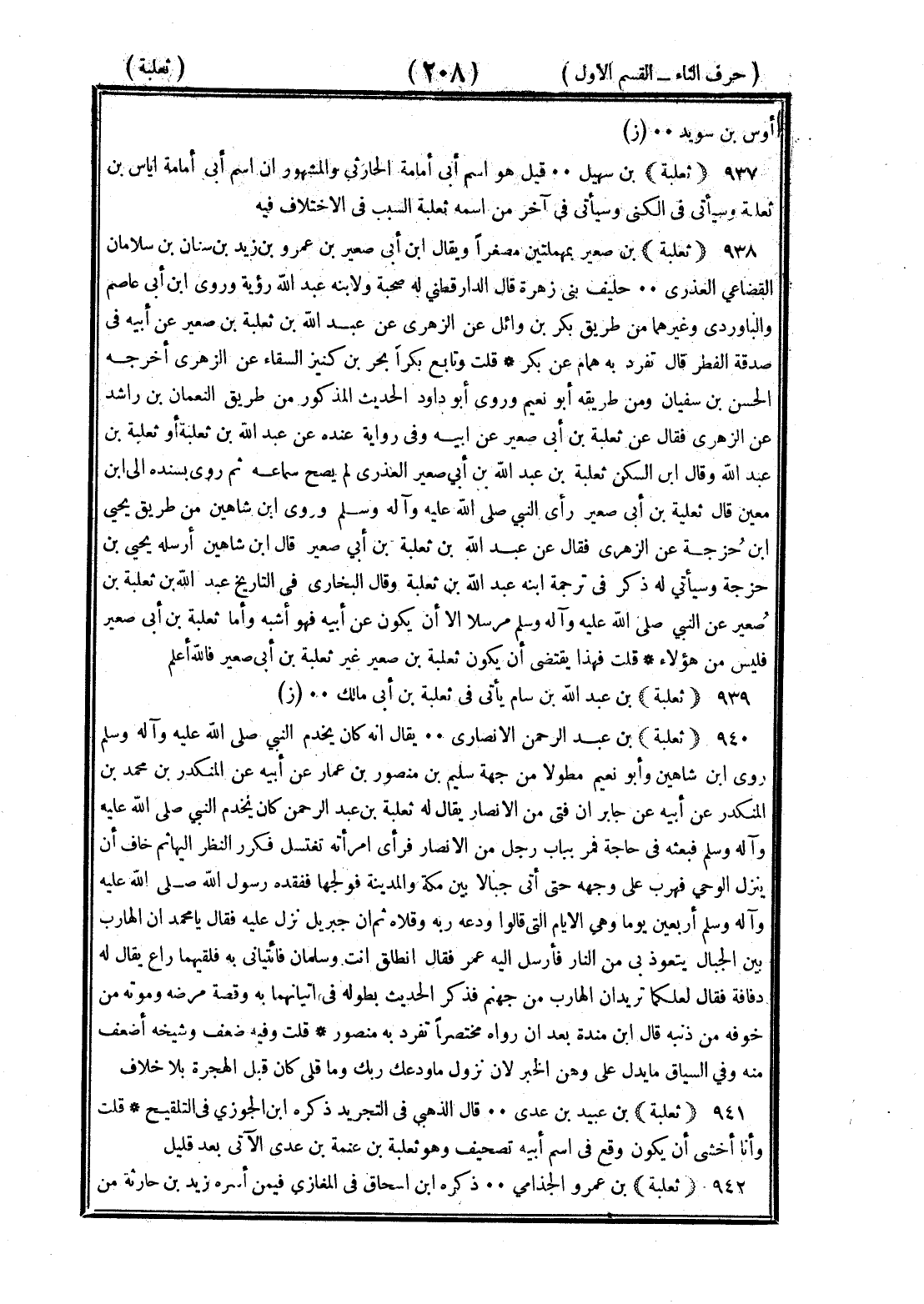 <208> أوس بن سويد ثعلبة بن سهيل قيل هو اسم أبي أمامة الحارثي والمشهور أن اسم أبي إمامة إياس بن ثعلبة وسيأتي في الكنى وسيأتي في آخر من اسمه ثعلبة السبب في الاختلاف فيه ثعلبة بن صغير بمهملتين مصغرا ويقال بن أبي صغير بن عمرو بن زيد بن سنان بن سلامان القضاعي العذري حليف بني زهرة قال الدار قطني له صحبة ولابنه عبد الله رؤية وروى بن أبي عاصم والباوردي وغيرهما من طريق بكر بن وائل عن الزهري عن عبد الله بن ثعلبة بن صغير عن أبيه في صدقه الفطر قال تفرد به همام عن بكر قلت وتابع بكر بحر بن كنيز السقاء عن الزهري أخرجه الحسن بن سفيان ومن طريقه أبو نعيم وروى أبو داود الحديث المذكور من طريق النعمان بن راشد عن الزهري قال عن ثعلبة بن أبي صغير عن أبيه وفي رواية عنده عن عبد الله بن ثعلبة أتوا ثعلبة بن عبد الله وقال بن السكن ثعلبة بن عبد الله بن أبي صغير العذري لم يصح سماعه ثم روى بسنده إلى بن معين قال ثعلبة بن أبي صغير رأى النبي صلى الله عليه وسلم وروى بن شاهين من طريق يحيى بن خارجة عن الزهري فقال عن عبد الله بن ثعلبة بن أبي صغير قال بن شاهين أرسله يحيى بن خارجة وسيأتي له ذكر في ترجمة ابنه عبد الله بن ثعلبة وقال البخاري في التاريخ عبد الله بن ثعلبة بن صغير عن النبي صلى الله عليه وسلم مرسلا إلا أن يكون عن أبيه فهو أشبه أما ثعلبة بن أبي صغير فليس من هؤلاء قلت فهذا يقتضى أن يكون ثعلبة بن صغير غير ثعلبة بن أبي صغير فالله أعلم ثعلبة بن عبد الله بن سام يأتي في ثعلبة بن أبي مالك ثعلبة بن عبد الرحمن الأنصاري يقال إنه كان يخدم النبي صلى الله عليه وسلم روى بن شاهين وأبو نعيم مطولا من جهة سليم بن منصور بن عمار عن أبيه عن المنكدر بن محمد بن المنكدر عن أبيه عن جابر أن فتى من الأنصار يقال له ثعلبة بن عبد الرحمن كان يخدم النبي صلى الله عليه وسلم فبعثه في حاجة فمر بباب رجل من الأنصار فرأى امرأته تغتسل فكرر النظر إليها ثم خاف أن ينزل الوحي فهرب على وجهه حتى أتي جبالا بين مكة المدينة فقطنها ففقده النبي صلى الله عليه وسلم أربعين يوما وهي الأيام التي قالوا ودعه ربه وقلاه ثم إن جبريل نزل عليه فقال يا محمد أن الهارب بين الجبال يتعوذ بي من النار فأرسل إليه عمر فقال انطلق أنت وسلمان فائتياني به فلقيها راع يقال له دفافة فقال لعلكما تريدان الهارب من جهنم فذكر الحديث بطوله في اتيانهما به وقصة مرضه وموته من خوفه من ذنبه قال بن منده بعد أن رواه مختصرا تفرد به منصور قلت وفيه ضعف وشيخه أضعف منه وفي السياق ما يدل على وهن الخبر لأن نزول ما ودعك ربك وما قلى كان قبل الهجرة بلا خلاف ثعلبة بن عبيد بن عدي قال الذهبي في التجريد ذكره بن الجوزي في التلقيح قلت وأنا أخشى أن يكون وقع في اسم أبيه تصحيف وهو ثعلبة بن عنمة بن عدي الآتي بعد قليل ثعلبة بن عمرو الجذامي ذكره بن إسحاق في المغازي فيمن أسره زيد بن حارثة §