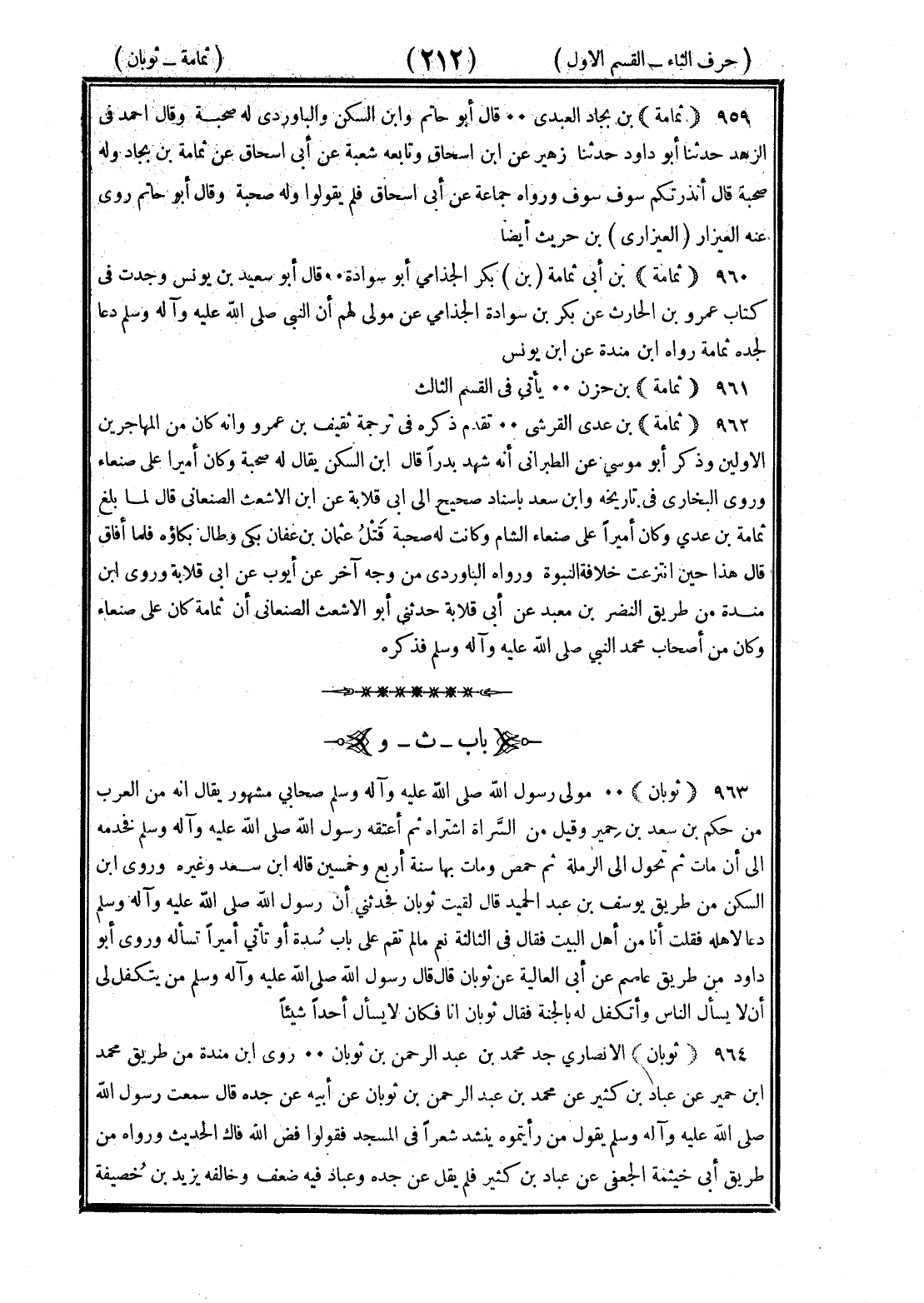 <212> ثمامة بن بجاد العبدي قال أبو حاتم وابن السكن والباوردي له صحبة وقال أحمد في الزهد حدثنا أبو داود حدثنا زهير عن أبي إسحاق وتابعه شعبة عن أبي إسحاق عن ثمامة بن بجاد وله صحبة قال أنذرتكم سوف سوف ورواه جماعة عن أبي إسحاق فلم يقولوا وله صحبة وقال أبو حاتم روى عنه العيزار بن حريث أيضا ثمامة بن أبي ثمامة بكر الجذامي أبو سوادة قال أبو سعيد بن يونس وجدت في كتاب عمرو بن الحارث عن بكر بن سوادة الجذامي عن مولى لهم أن النبي صلى الله عليه وسلم دعا لجده ثمامة رواه بن منده عن بن يونس ثمامة بن حزن يأتي في القسم الثالث ثمامة بن عدي القرشي تقدم ذكره في ترجمة ثقف بن عمرو وأنه كان من المهاجرين الأولين وذكر أبو موسى عن الطبري أنه شهد بدرا وقال بن السكن يقال له صحبة وكان أميرا على صنعاء وروى البخاري في تاريخه وابن سعد بإسناد صحيح إلى أبي قلابة عن أبي الأشعث الصنعاني قال لما بلغ ثمامة بن عدي وكان أميرا على صنعاء الشام وكانت له صحبة قتل عثمان بن عفان بكى وطال بكاؤه فلما أفاق قال هذا حين انتزعت خلافة النبوة ورواه الباوردي من وجه آخر عن أيوب عن أبي قلابة وروى بن منده من طريق النضر بن معبد عن أبي قلابة حدثني أبو الأشعث الصنعاني أن ثمامة كان على صنعاء وكان من أصحاب محمد النبي صلى الله عليه وسلم فذكره الثاء بعدها الواو ثوبان مولى رسول الله صلى الله عليه وسلم صحابي مشهور يقال إنه من العرب حكمي من حكم بن سعد حمير وقيل من السراه اشتراه ثم أعتقه رسول الله صلى الله عليه وسلم فخدمه إلى أن مات ثم تحول إلى الرملة ثم حمص ومات بها سنة أربع وخمسين قاله بن سعد وغيره وروى بن السكن من طريق يوسف بن عبد الحميد قال لقيت ثوبان فحدثني أن رسول الله صلى الله عليه وسلم دعا لأهله فقلت أنا من أهل البيت فقال في الثالثة نعم ما لم تقم على باب سده أو تأتي أميرا تسأله وروى أبو داود من طريق عاصم عن أبي العالية عن ثوبان قال قال رسول الله صلى الله عليه وسلم من يتكفل لي الا يسأل الناس واتكفل له بالجنة فقال ثوبان أنا فكان لا يسأل أحدا شيئا ثوبان الأنصاري جد محمد بن عبد الرحمن بن ثوبان روى بن منده من طريق محمد بن حمير عن عباد بن كثير عن محمد بن عبد الرحمن أبن ثوبان عن أبيه عن جده قال سمعت رسول الله صلى الله عليه وسلم يقول من رأيتوه ينشد شعرا في المسجد فقولوا فض الله فاك الحديث ورواه من طريق أبي خيثمة الجعفي عن عباد بن كثير فلم يقل عن جده وعباد فيه ضعيف وخالفه يزيد بن خصيفة §