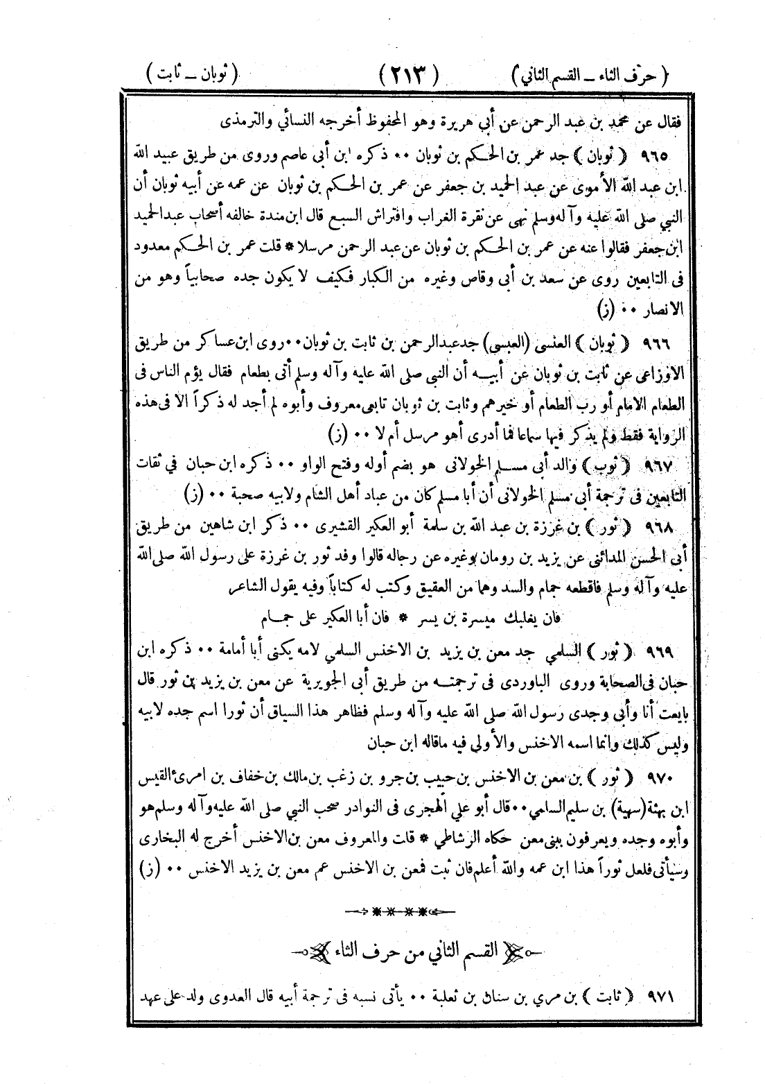 <213> فقال عن محمد بن عبد الرحمن عن أبي هريرة وهو المحفوظ أخرجه النسائي والترمذي ثوبان جد عمر بن الحكم بن ثوبان ذكره بن أبي عاصم وروى من طريق عبيد الله بن عبد الله الأموي عن عبد الحميد بن جعفر عن عمر بن الحكم بن ثوبان عن عمه عن أبيه ثوبان أن النبي صلى الله عليه وسلم نهى عن نقرة الغراب وافتراش السبع قال بن منده خالفه أصحاب عبد الحميد بن جعفر فقالوا عنه عن عمر بن الحكم عن ثوبان عن عبد الرحمن مرسلا قلت عمر بن الحكم معدود في التابعين روى عن سعد بن أبي وقاص وغيره من الكبار فكيف لا يكون جده صحابيا وهو من الأنصار ثوبان العنسي جد عبد الرحمن بن ثابت بن ثوبان روى بن عساكر من طريق الأوزاعي عن ثابت بن ثوبان عن أبيه أن النبي صلى الله عليه وسلم أتى بطعام فقال يؤم الناس في الطعام الإمام او رب الطعام أو خيرهم وثابت بن ثوبان تابعي ومعروف وأبوه لم أجد له ذكرا الا في هذه الرواية فقط ثوب والد أبي مسلم الخولاني هو بضم أوله وفتح الواو وذكر بن حبان في ثقات التابعين في ترجمة أبي مسلم الخولاني أن أبا مسلم كان من عباد أهل الشام ولأبيه صحبة ثور بن عزرة بن عبد الله بن سلمة أبو العكير القشيري ذكر بن شاهين عن أبي الحسن المدائني عن يزيد بن رومان وغيره عن رجاله قالوا وفد ثور بن عزرة على رسول الله صلى الله عليه وسلم فأقطعه حمام والسد وهما من العقيق وكتب له كتابا وفيه يقول الشاعر فإن يغلبك ميسرة بن بشر فإن أبا العكير على حمام ثور السلمي جد معن بن يزيد بن الأخنس السلمي لأمه يكنى أبا أمامة ذكره بن حبان في الصحابة وروى الباوردي في ترجمته عن طريق أبي الجويرية عن معن بن يزيد بن ثور قال بايعت أنا وأبي وجدي رسول الله صلى الله عليه وسلم فظاهر هذا السياق أن ثورا اسم جده لأبيه وليس كذلك وإنما اسمه الأخنس والأولى فيه ما قاله بن حبان ثور بن معن بن الأخنس بن حبيب بن جرة بن زغب بن مالك بن خفاف بن امرئ القيس بن بهثة بن سليم السلمي قال أبو علي الهجري في النوادر صحب النبي صلى الله عليه وسلم هو وأبوه وجده ويعرفون ببني معن حكاه الرشاطي قلت والمعروف معن بن الأخنس أخرج له البخاري وسيأتي فلعل ثورا هذا بن عمه والله أعلم فإن ثبت فمعن بن الأخنس عم معن بن يزيد بن الأخنس