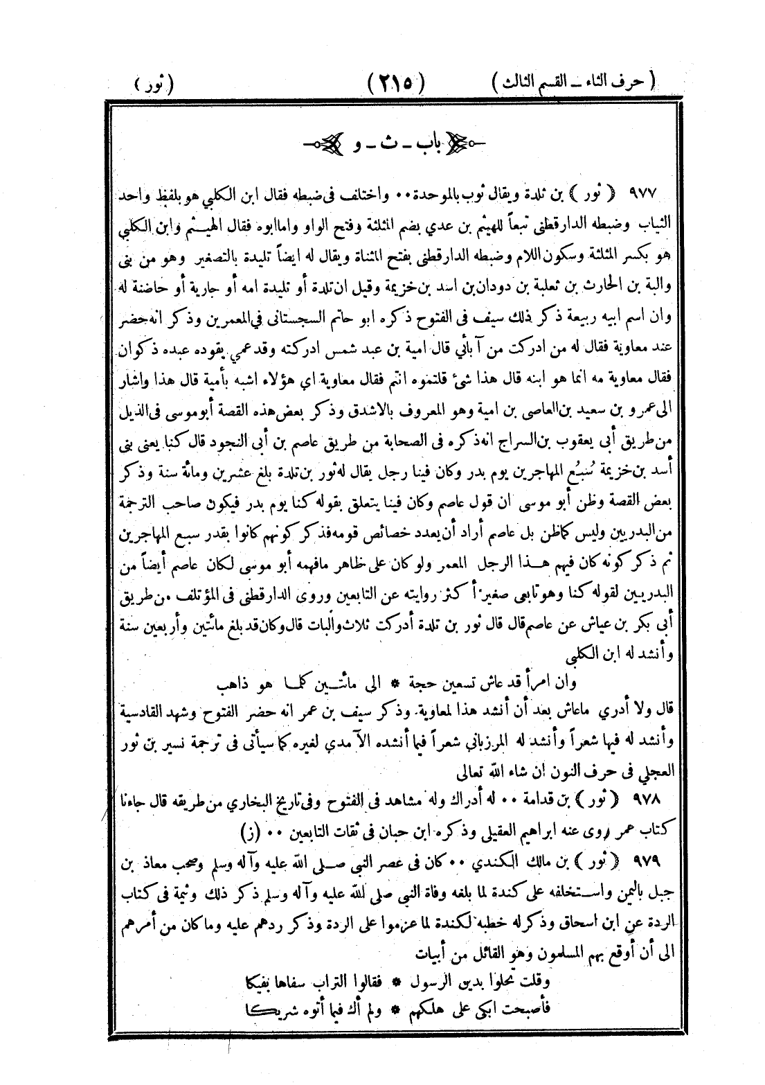 <215> الثاء بعدها الواو ثور بن تلدة ويقال ثوب بالموحدة واختف في ضبطه فقال بن الكلبي هو بلفظ واحد الثياب وضبطه الدار قطني تبعا للهيثم بن عدي بضم المثلثة وفتح الواو وأما أبوه فقال الهيثم وابن الكلبي هو بكسر المثلثة وسكون اللام وضبطه الدار قطني بفتح المثناة ويقال له أيضا تليدة بالتصغير وهو من بني والبة بن الحارث بن ثعلبة بن دودان بن أسد بن خزيمة وقيل إن تلدة أو تليدة أمه أو جارية حاضنة له وإن اسم أبيه ربيعة ذكر ذلك سيف في الفتوح ذكره أبو حاتم السجستاني في المعمرين وذكر أنه حضر عند معاوية فقال من أدركت من آبائي قال أمية بن عبد شمس أدركته وقد عمي يقوده عبدة ذكوان فقال معاوية مه إنما هو ابنه قال هذا شيء قلتموه أنتم فقال معاوية أي هؤلاء أشبه بأمية فقال هذا وأشار إلى عمرو بن سعيد بن العاصي بن أمية وهو المعروف بالأشدق وذكر بعض هذه القصة أبو موسى في الذيل من طريق أبي يعقوب السراج أنه ذكره في الصحابة من طريق عاصم بن أبي النجود قال كنا يعني بني أسد بن خزيمة سبع المهاجرين يوم بدر وكان فينا رجل يقال له ثور بن تلدة بلغ عشرين ومائة سنة وذكر بعض القصة وظن أبو موسى أن قول عاصم وكان فينا يتعلق بقوله كنا يوم بدر فيكون صاحب الترجمة من البدريين وليس كما ظن بل عاصم أراد أن يعد خصائص قومه فذكر كونهم كانوا بقدر سبع المهاجرين ثم ذكر كونه كان فيهم هذا الرجل المعمر ولو كان على ظاهر ما فهمه أبو موسى لكان عاصم أيضا من البدريين لقوله كنا وهو تابعي صغير أكثر روايته عن التابعين وروى الدار قطني في الؤتلف من طريق أبي بكر بن عياش عن عاصم قال قال ثور بن تلدة أدركت ثلاث والبات قال وكان قد بلغ مائتين وأربعين سنة وأنشد له بن الكلبي وإن امرأ قد عاش تسعين حجة إلى مائتين كلها هو ذاهب قال ولا أدري ما عاش بعد ما أنشد هذا لمعاوية وذكر سيف بن عمر أنه حضر الفتوح وشهد القادسية وأنشد له فيها شعرا وأنشد له المرزباني شعرا فيما أنشده الآمدي لغيره كما سيأتي في ترجمة نسير بن ثور العجلي في حرف النون إن شاء الله تعالى ثور بن قدامة له إدراك وله مشاهد في الفتوح وفي تاريخ البخاري من طريقه قال جاءنا كتاب عمر روى عنه إبراهيم العقيلي وذكره بن حبان في ثقات التابعين ثور بن مالك الكندي كان في عصر النبي صلى الله عليه وسلم وصحب معاذ بن جبل باليمن واستخلفه على كندة لما بلغه وفاة النبي صلى الله عليه وسلم ذكر ذلك وثيمة في كتاب الدرة عن بن إسحاق وذكر له خطبة لكندة لما عزموا على الردة وذكر ردهم عليه وما كان من أمرهم إلى أن أوقع بهم المسلمون وهو القائل من أبيات وقلت تحلوا بدين الرسول فقالوا التراب سفاها بفيكا فأصبحت أبكي على هلكهم ولم اك فيما أتوه شريكا §