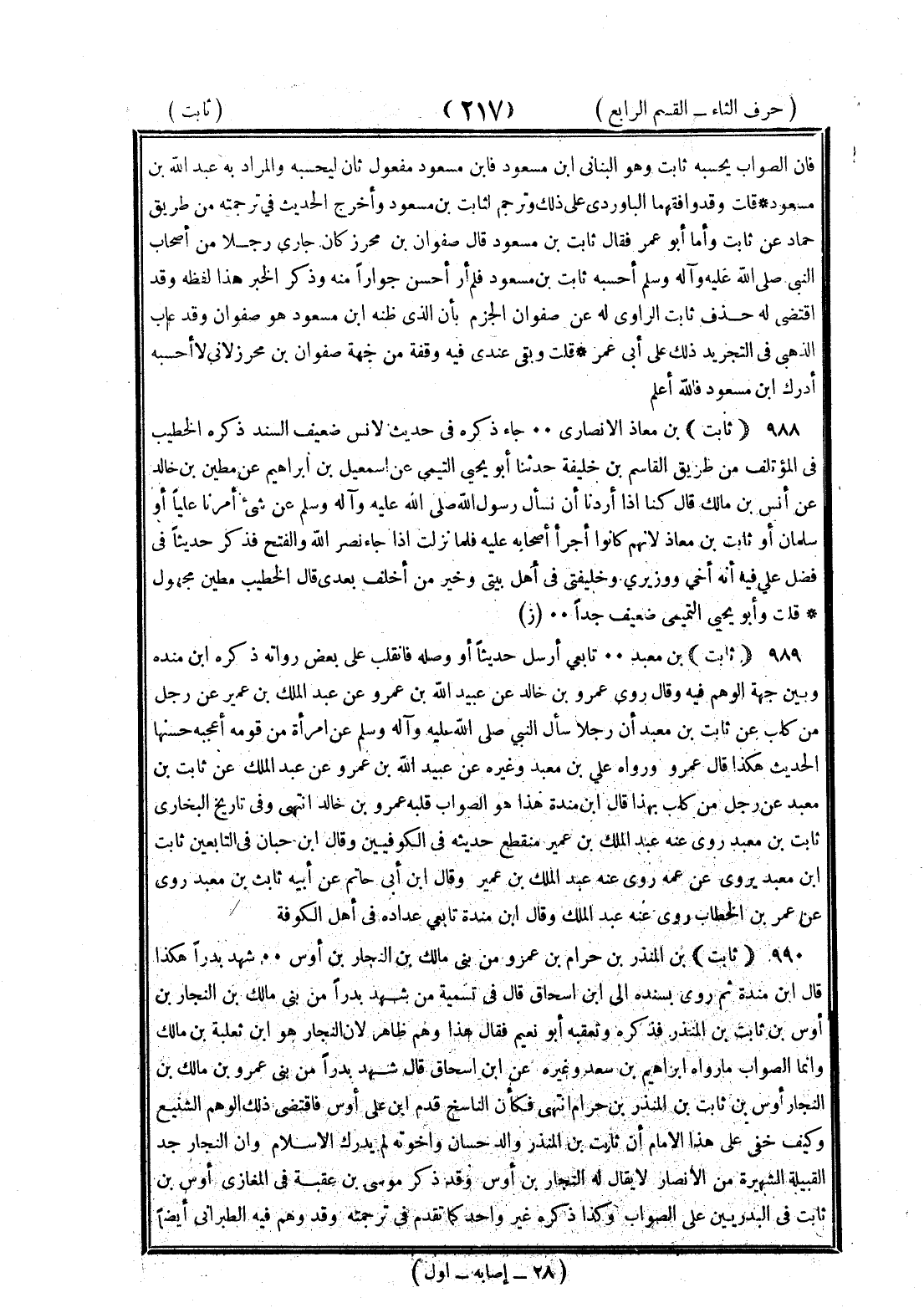 <217> فإن الصواب نحسبه ثابت وهو البناني بن مسعود فابن مسعود مفعول ثان لنحسبه والمراد به عبد الله بن مسعود قلت وقد وافقهما الباوردي على ذلك وترجم لثابت بن مسعود وأخرج الحديث في ترجمته من طريق حماد بن ثابت وأما أبو عمر فقال ثابت بن مسعود قال صفوان بن محرز كان جاري رجلا من أصحاب النبي صلى الله عليه وسلم أحسبه ثابت بن مسعود فلم أر أحسن جوارا منه وذكر الخبر هذا لفظه وقد اقتضى له حذف ثابت الراوي له عن صفوان الجزم بأن الذي ظنه بن مسعود هو صفوان وقد عاب الذهبي في التجريد ذلك على أبي عمر قلت وبقي عندي فيه وقفة من جهة صفوان بن محرز لأني لا أحسبه أدرك بن مسعود فالله أعلم ثابت بن معاذ الأنصاري جاء ذكره في حديث لأنس ضعيف السند ذكره الخطيب في المؤتلف من طريق القاسم بن خليفة حدثنا أبو يحيى التيمي إسماعيل بن إبراهيم عن مطير أبي خالد عن أنس بن مالك قال كنا إذا أردنا أن نسأل رسول الله صلى الله عليه وسلم عن شيء أمرنا عليا أو سلمان أو ثابت بن معاذ لأنهم كانوا اجرأ أصحابه عليه فلما نزلت إذا جاء نصر الله والفتح فذكر حديثا منكرا في فضل علي فيه إنه أخي ووزيري وخليفتي في أهل بيتي وخير من أخلف بعدي قال الخطيب مطير مجهول قلت وأبو يحيى التيمي ضعيف جدا ثابت بن معبد تابعي أرسل حديثا أو وصله فانقلب على بعض رواته ذكره بن منده وبين جهة الوهم فيه وقال روى عمرو بن خالد عن عبيد الله بن عمرو عن عبد الملك بن عمير عن رجل من كلب عن ثابت بن معبد أن رجلا سأل النبي صلى الله عليه وسلم عن امرأة من قومه أعجبه حسنها الحديث هكذا قال عمرو ورواه علي بن معبد وغيره عن عبيد الله بن عمرو عن عبد الملك عن ثابت بن سعيد عن رجل من كلب بهذا قال بن منده هذا هو الصواب قلبه عمرو بن خالد انتهى وفي تاريخ البخاري ثابت بن معبد روى عنه عبد الملك بن عمير منقطع حديثه في الكوفيين وقال بن حبان في التابعين ثابت بن معبد عن عمر بن الخطاب روى عنه عبد الملك وقال بن منده تابعي عداده في أهل الكوفة ثابت بن المنذر بن حرام بن عمرو من بني مالك بن النجار بن أوس شهد بدرا هكذا قال بن منده ثم روى بسنده إلى بن إسحاق قال في تسمية من شهد بدرا من بني مالك بن النجار بن أوس بن ثابت بن المنذر فذكره وتعقبه أبو نعيم فقال هذا وهم ظاهر لأن النجار هو بن ثعلبة بن مالك وإنما الصواب ما رواه إبراهيم بن سعد وغيره عن بن إسحاق قال شهد بدرا من بني عمرو مالك بن النجار أوس بن ثابت بن المنذر بن حرام انتهى فكأن الناسخ قدم بن على أوس فاقتضى ذلك الوهم الشنيع وكيف خفي على هذا الإمام أن ثابت بن المنذر والد حسان وإخوته لم يدرك الإسلام وأن النجار جد القبيلة الشهيرة من الأنصار لا يقال له النجار بن أوس وقد ذكر موسى بن عقبة في المغازي أوس بن ثابت في البدريين على الصواب وكذا ذكره غير واحد كما تقدم في ترجمته وقد وهم فيه الطبراني أيضا §