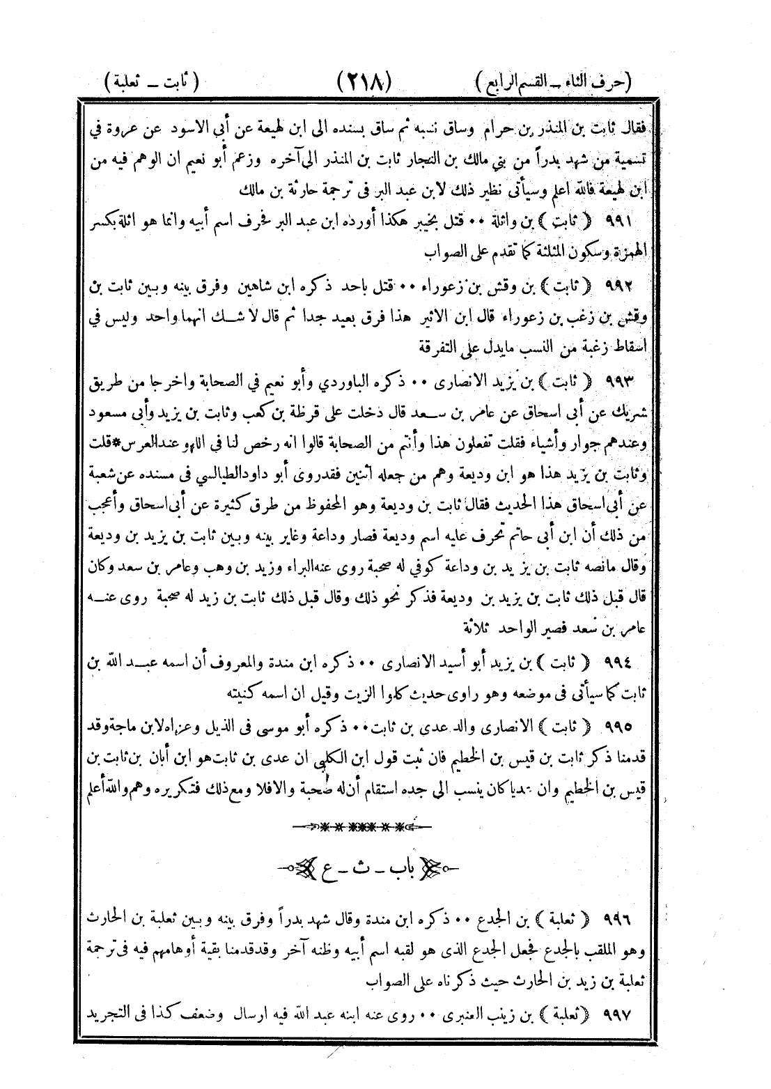 <218> فقال ثابت بن المنذر بن حرام وساق بسنده إلى بن لهيعة عن أبي الأسود عن عروة في تسمية من شهد بدرا من بني مالك بن النجار ثابت بن المنذر إلى آخره وزعم أبو نعيم أن الوهم فيه من بن لهيعة فالله أعلم وسيأتي نظير ذلك لابن عبد البر في ترجمة حارثة بن مالك ثابت بن واثلة قتل بخيبر هكذا أورده بن عبد البر فحرف اسم أبيه وإنما هو إثلة بكسر الهمزة وسكون المثلثة كما تقدم على الصواب ثابت بن وقش بن زعوراء قتل بأحد ذكره بن شاهين وفرق بينه وبين ثابت بن وقش بن زغبة بن زعوراء قال بن الأثير هذا فرق بعيد جدا ثم قال لا شك أنهما واحد وليس في إسقاط زغبة من النسب ما يدل على التفرقة ثابت بن يزيد الأنصاري ذكره الباوردي وأبو نعيم في الصحابة وأخرجا من طريق شريك عن أبي إسحاق عن عامر بن سعد قال دخلت على قرظة بن كعب وثابت بن يزيد وابن مسعود وعندهم جوار وأشياء فقلت تفعلون هذا وأنتم من الصحابة قالوا أنه رخص لنا في اللهو عند العرس قلت وثابت بن يزيد هذا هو بن وديعة ووهم من جعله اثنين فقد روى أبو داود الطيالسي في مسنده عن شعبة بن أبي إسحاق هذا الحديث فقال ثابت بن وديعة وهو المحفوظ من طرق كثيرة عن أبي إسحاق وأعجب من ذلك أن بن أبي حاتم تحرف عليه اسم وديعة فصار وداعة وغاير بينه وبين ثابت بن يزيد بن وديعة وقال ما نصه ثابت بن يزيد بن وداعة كوفي له صحبة روى عن البراء وزيد بن وهب وعامر بن سعد وكان قال قبل ذلك ثابت بن يزيد بن وديعة فذكر نحو ذلك وقال قبل ذلك ثابت بن زيد له صحبة وروى عنه عامر بن سعد فصير الواحد ثلاثة ثابت بن يزيد أبو أسيد الأنصاري ذكره بن منده والمعروف أن اسمه عبد الله بن ثابت كما سيأتي في موضعه وهو راوي حديث كلوا الزيت وقيل إن اسمه كنيته ثابت الأنصاري والد عدي بن ثابت ذكره أبو موسى في الذيل وعزاه لابن ماجة وقد قدمنا ذكر ثابت بن قيس بن الخطيم فإن ثبت قول بن الكلبي إن عدي بن ثابت هو بن أبان بن ثابت بن قيس بن الخطيم وإن عديا كان ينسب إلى جده استقام أن له صحبة وإلا فلا ومع ذلك فتكريره وهم والله أعلم الثاء بعدها العين المهملة ثعلبة بن الجذع ذكره بن منده وقال شهد بدرا وفرق بينه وبين ثعلبة بن الحارث وهو الملقب بالجذع فجعل الجذع الذي هو لقبه اسم أبيه وظنه آخر وقد قدمنا بقية اوهامهم فيه في ترجمة ثعلبة بن زيد بن الحارث حيث ذكرناه على الصواب ثعلبة بن زبيب العنبري روى عنه ابنه عبد الله فيه إرسال وضعف كذا في التجريد §