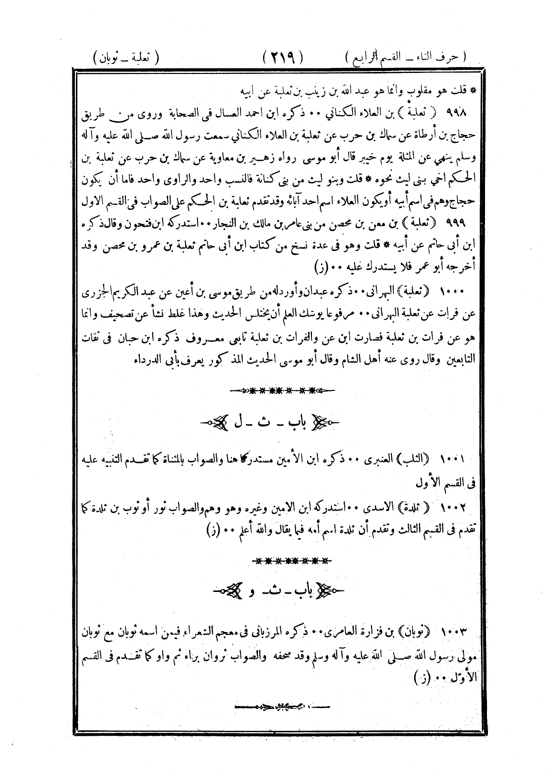 <219> قلت هو مقلوب وإنما هو عبد الله بن زبيب بن ثعلبة عن أبيه ثعلبة بن العلاء الكناني ذكره أبو أحمد العسال في الصحابة وروى من طريق حجاج بن أرطاة عن سماك بن حرب عن ثعلبة بن العلاء الكناني سمعت رسول الله صلى الله عليه وسلم ينهى عن المثلة يوم خيبر قال أبو موسى رواه زهير بن معاوية عن سماك بن حرب عن ثعلبة بن الحكم أخي بني ليث نحوه قلت وبنو ليث من بني كنانة فالنسب واحد والراوي واحد فإما أن يكون حجاج وهم في اسم أبيه أو يكون العلاء اسم أحد آبائه وقد تقدم ثعلبة بن الحكم على الصواب في القسم الأول ثعلبة بن معن بن محصن من بني عامر بن مالك بن النجار استدركه بن فتحون وقال ذكره بن أبي حاتم عن أبيه عن أبيه قلت وهو في عدة نسخ من كتاب بن أبي حاتم ثعلبة بن عمرو بن محصن وقد أخرجه أبو عمر فلا يستدرك عليه ثعلبة البهراني ذكره عبدان وأورد له من طريق موسى بن أعين عن عبد الكريم الجزري عن فرات عن ثعلبة البهراني مرفوعا يوشك العلم أن يختلس الحديث وهذا غلط نشأ عن تصحيف وإنما هو عن فرات بن ثعلبة فصارت بن عن والفرات بن ثعلبة تابعي معروف ذكره بن حبان في ثقات التابعين وقال روى عنه أهل الشام وقال أبو موسى الحديث المذكور يعرف بأبي الدرداء الثاء بعدها اللام الثلب العنبري ذكره بن الأمين مستدركا هنا والصواب بالمثناة كما تقدم التنبيه عليه في القسم الأول ثلدة الأسدي استدركه بن الأمين وغيره وهو وهم والصواب ثور أو ثوب بن ثلدة كما تقدم في القسم الثالث وتقدم أن ثلدة اسم أمه فيما يقال والله أعلم الثاء بعدها الواو ثوبان بن فزارة العامري ذكره المرزباني في معجم الشعراء فيمن اسمه ثوبان مع ثوبان مولى رسول الله صلى الله عليه وسلم وقد صحفه والصواب ثروان راء ثم واو كما تقدم في القسم الأول §