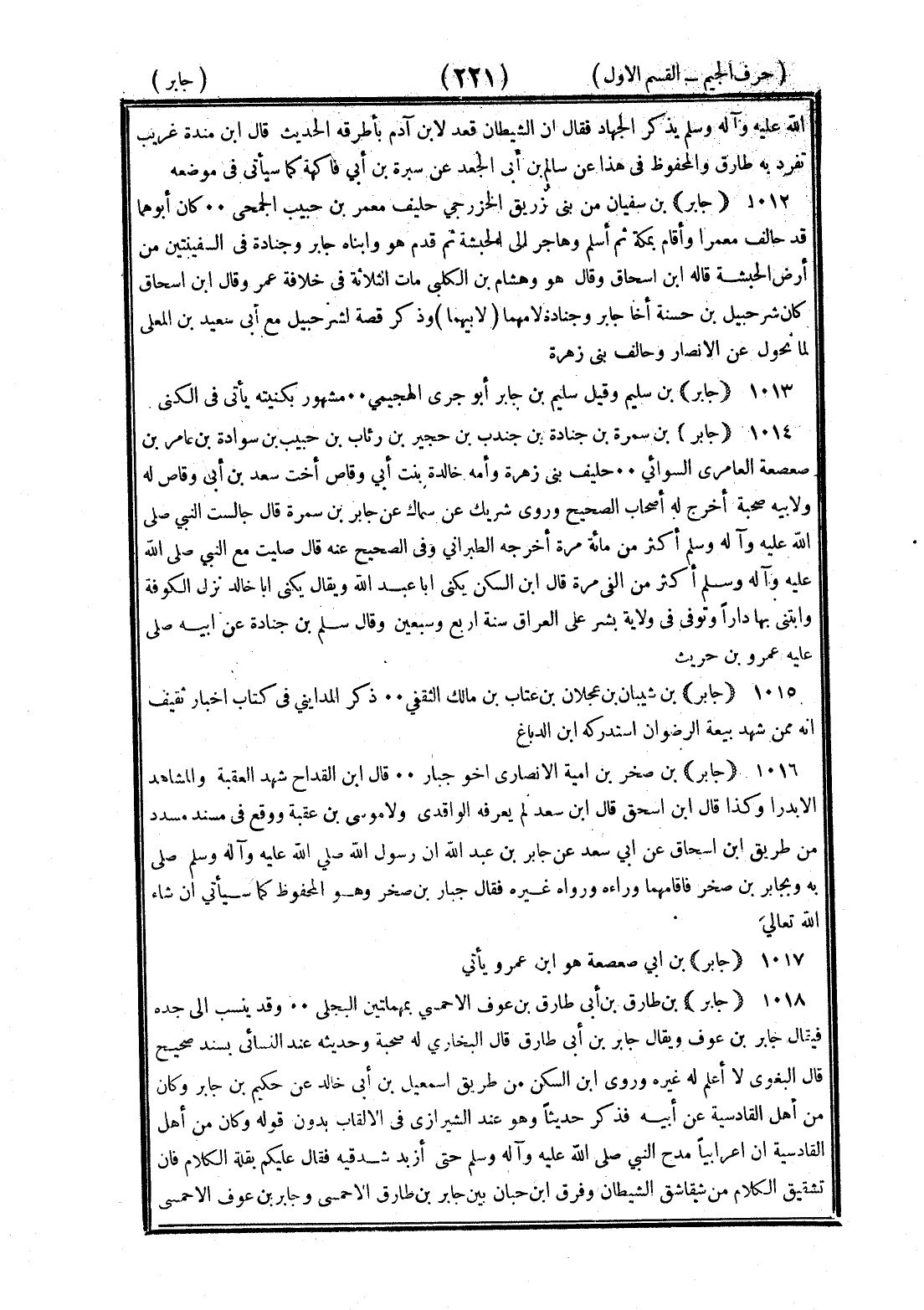 <221> الله عليه وسلم يذكر الجهاد فقال إن الشيطان قعد لابن آدم بأطرقه الحديث قال بن منده غريب تفرد به طارق والمحفوظ في هذا عن سالم بن أبي الجعد عن سبرة بن أبي فاكهة كما سيأتي في موضعه جابر بن سفيان من بني زريق الخزرجي حليف معمر بن حبيب الجمحي كان أبوهما قد حالف معمرا وأقام بمكة ثم أسلم وهاجر إلى الحبشة ثم قدم هو وابناه جابر وجنادة في السفينتين من أرض الحبشة قاله بن إسحاق وقال هو وهشام بن الكلبي مات الثلاثة في خلافة عمر وقال بن إسحاق كان شرحبيل بن حسنة أخا جابر وجنادة لأبيهما وذكر قصة لشرحبيل مع أبي سعيد بن المعلي لما تحول عن الأنصار وحالف بني زهرة جابر بن سليم وقيل سليم بن جابر أبو جرى الهجيمي مشهور بكنيته يأتي في الكنى جابر بن سمرة بن جنادة بن جندب بن حجير بن رئاب بن حبيب بن سواءة بن عامر بن صعصعة العامري السوائي حليف بني زهرة وأمه خالدة بنت أبي وقاص أخت سعد بن أبي وقاص له ولأبيه صحبة أخرج له أصحاب الصحيح وروى شريك عن سماك عن جابر بن سمرة قال جالست النبي صلى الله عليه وسلم أكثر من مائة مرة أخرجه الطبراني وفي الصحيح عنه قال صليت مع النبي صلى الله عليه وسلم أكثر من الفي مرة قال بن السكن يكنى أبا عبد الله ويقال يكنى أبا خالد نزل الكوفة وابتنى بها دارا وتوفي في ولاية بشر على العراق سنة أربع وسبعين وقال سلم بن جنادة عن أبيه صلى عليه عمرو بن حريث جابر بن شيبان بن عجلان بن عتاب بن مالك الثقفي ذكر المدائني في كتاب أخبار ثقيف أنه ممن شهد بيعة الرضوان واستدركه بن الدباغ جابر بن صخر بن أمية الأنصاري أخو جبار قال بن القداح شهد العقبة والمشاهد الا بدرا وكذا قال بن إسحاق قال بن سعد لم يعرفه الواقدي ولا موسى بن عقبة ووقع في مسند مسدد من طريق بن إسحاق عن أبي سعد عن جابر بن عبد الله أن رسول الله صلى الله عليه وسلم صلى به وبجابر بن صخر فأقامهما وراءه ورواه غيره فقال جبار بن صخر وهو المحفوظ كما سيأتي إن شاء الله تعالى جابر بن أبي صعصعة هو بن عمرو يأتي جابر بن طارق بن أبي طارق بن عوف الأحمسي بمهملتين البجلي وقد ينسب إلى جده فيقال جابر بن عوف ويقال جابر بن أبي طارق قال البخاري له صحبة وحديثه عند النسائي بسند صحيح قال البغوي لا أعلم له غيره وروى بن السكن من طريق إسماعيل بن أبي خالد عن حكيم بن جابر وكان من أهل القادسية عن أبيه فذكر حديثا وهو عند الشيرازي في الألقاب بدون قوله وكان من أهل القادسية أن أعرابيا مدح النبي صلى الله عليه وسلم حتى ازبد شدقيه فقال عليكم بقلة الكلام فإن تشقيق الكلام من شقاشق الشيطان وفرق بن حبان بين جابر بن طارق الأحمسي وجابر بن عوف الأحمسي §