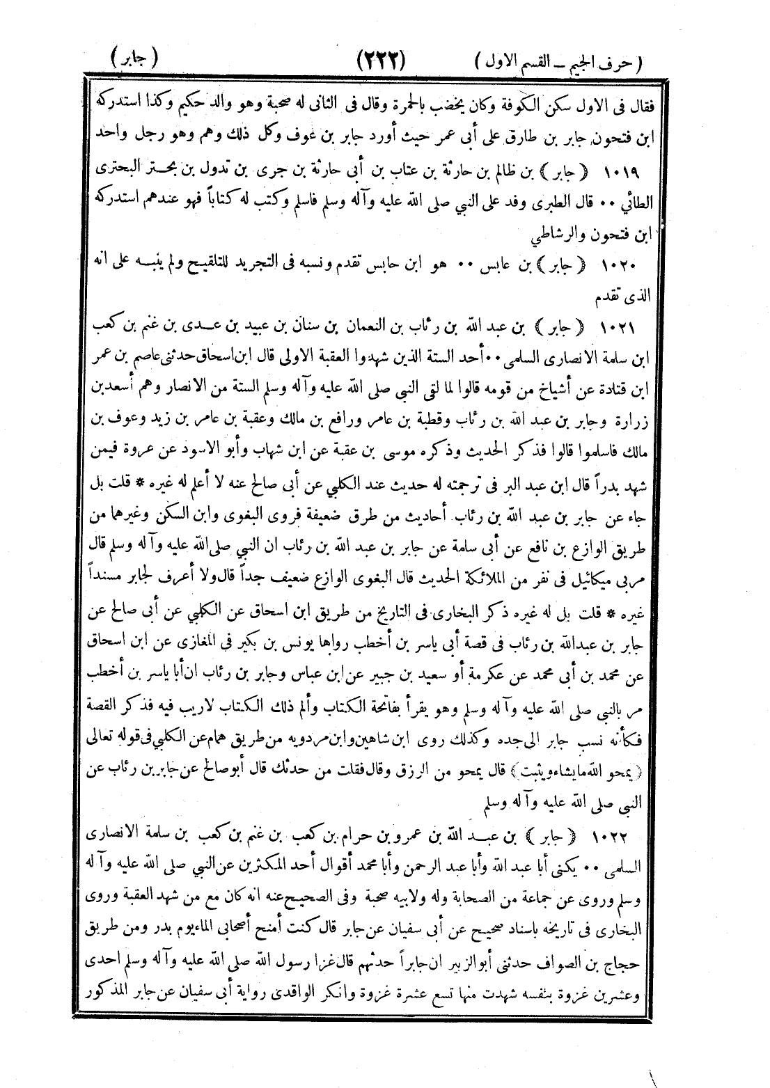 <222> فقال في الأول سكن الكوفة وكان يخضب بالحمرة وقال في الثاني له صحبة وهو والد حكيم كذا استدرك بن فتحون جابر بن طارق على أبي عمر حيث أورد جابر بن عوف وكل ذلك وهم فهو رجل واحد جابر بن ظالم بن حارثة بن عتاب بن أبي حارثة بن جدي بن تدول بحتر البحتري الطائي قال الطبري وفد على النبي صلى الله عليه وسلم فأسلم وكتب له كتابا فهو عندهم استدركه بن فتحون والرشاطي جابر بن عابس هو بن حابس تقدم ونسبه في التجريد للتلقيح ولم ينبه على أنه الذي تقدم جابر بن عبد الله بن رئاب بن النعمان بن سنان بن عبيد بن عدي بن غنم بن كعب بن سلمة الأنصاري السلمي أحد الستة الذين شهدوا العقبة الأولى قال بن إسحاق حدثني عاصم بن عمر بن قتادة عن أشياخ من قومه قالوا لما لقي النبي صلى الله عليه وسلم الستة من الأنصار وهم أسعد بن زرارة وجابر بن عبد الله بن رئاب وقطبة بن عامر ورافع بن مالك وعقبة بن عامر بن زيد وعوف بن مالك فاسلموا قالوا فذكر الحديث وذكره موسى بن عقبة عن بن شهاب وأبو الأسود عن عروة فيمن شهد بدرا قال بن عبد البر في ترجمته له حديث عند الكلبي عن أبي صالح عنه لا أعلم له غيره قلت بل جاء عن جابر بن عبد الله بن رئاب أحاديث من طرق ضعيفة فروى البغوي وابن السكن وغيرهما من طريق الوازع بن نافع عن أبي سلمة عن جابر بن عبد الله بن رئاب أن النبي صلى الله عليه وسلم قال مربي ميكائيل في نفر من الملائكة الحديث قال البغوي الوازع ضعيف جدا قال ولا أعرف لجابر مسندا غيره قلت بل له غيره ذكر البخاري في التاريخ من طريق بن إسحاق عن الكلبي عن أبي صالح عن جابر بن عبد الله بن رئاب في قصة أبي ياسر بن أخطب رواها يونس بن بكير في المغازي عن بن إسحاق عن محمد بن أبي محمد عن عكرمة او سعيد بن جبير عن بن عباس وجابر بن رئاب أن أبا ياسر بن أخطب مر بالنبي صلى الله عليه وسلم وهو يقرأ فاتحة الكتاب وألم ذلك الكتاب لا ريب فيه فذكر القصة فكأنه نسب جابرا إلى جده وكذلك روى بن شاهين وابن مردويه من طريق همام عن الكلبي في قوله تعالى يمحو الله ما يشاء ويثبت قال يمحو من الرزق وقال فقلت من حدثك قال أبو صالح عن جابر بن رئاب عن النبي صلى الله عليه وسلم جابر بن عبد الله بن عمرو بن حرام بن كعب بن غنم بن كعب بن سلمة الأنصاري السلمي يكنى أبا عبد الله وأبا عبد الرحمن وأبا محمد أقوال أحد المكثرين عن النبي صلى الله عليه وسلم وروى عنه جماعة من الصحابة وله ولأبيه صحبة وفي الصحيح عنه أنه كان مع من شهد العقبة وروى البخاري في تاريخه بإسناد صحيح عن أبي سفيان عن جابر قال كنت اميح أصحابي الماء يوم بدر ومن طريق حجاج بن الصواف حدثني أبو الزبير أن جابرا حدثهم قال غزا رسول الله صلى الله عليه وسلم إحدى وعشرين غزوة بنفسه شهدت منها تسع عشرة غزوة وأنكر الواقدي رواية أبي سفيان عن جابر المذكور §