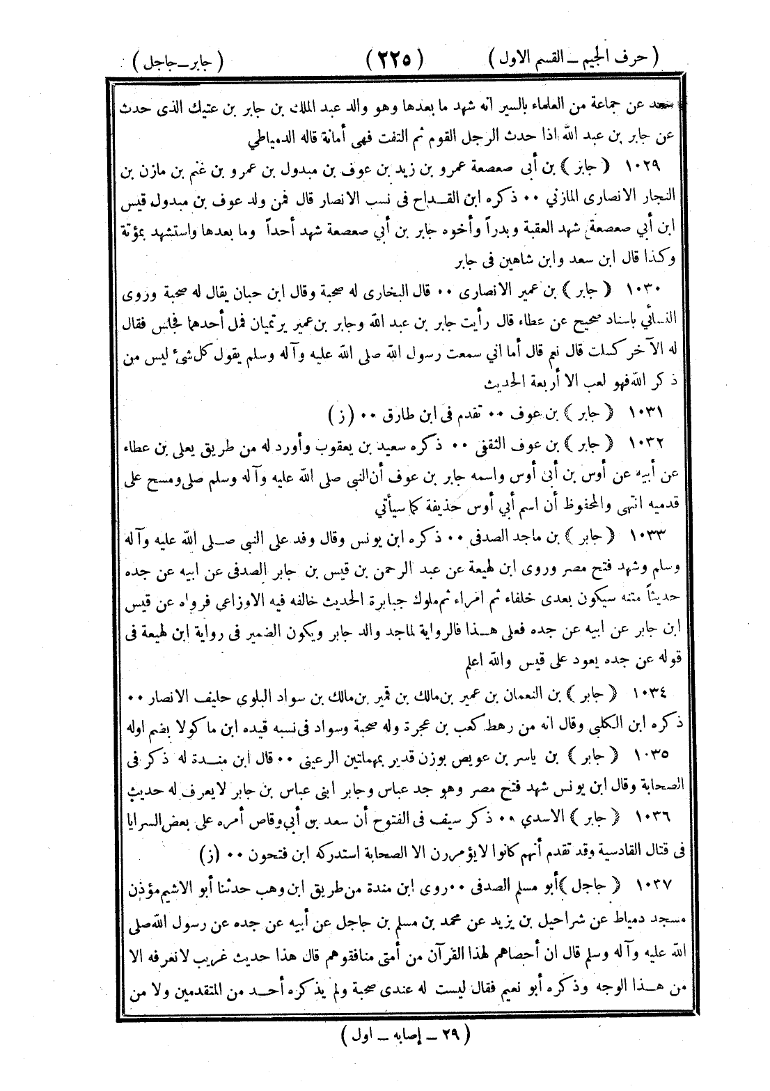 <225> سعد عن جماعة من العلماء بالسير أنه شهد ما بعدها وهو والد عبد الملك بن جابر بن عتيك الذي حدث عن جابر بن عبد الله إذا حدث الرجل القوم ثم ألتفت فهي أمانة قاله الدمياطي جابر بن أبي صعصعة عمرو بن زيد بن عوف بن مبذول بن عمرو بن غنم بن مازن بن النجار الأنصاري المازني ذكره بن القداح في نسب الأنصار قال فمن ولد عوف بن مبذول قيس بن أبي صعصعة شهد العقبة وبدرا وأخوه جابر بن أبي صعصعة شهد أحدا وما بعدها واستشهد بمؤتة وكذا قال بن سعد وابن شاهين في جابر جابر بن عمير الأنصاري قال البخاري له صحبة وقال بن حبان يقال له صحبة وروى النسائي بإسناد صحيح قال رأيت جابر بن عبد الله وجابر بن عمير يرتميان فمل أحدهما فجلس فقال له الآخر كسلت قال نعم قال أما إني سمعت رسول الله صلى الله عليه وسلم يقول كل شيء ليس من ذكر الله فهو لعب الا أربعة الحديث جابر بن عوف تقدم في أبن طارق جابر بن عوف الثقفي ذكره سعيد بن يعقوب وارود له من طريق يعلى بن عطاء عن أبيه عن أوس بن أبي أوس واسمه جابر بن عوف أن النبي صلى الله عليه وسلم ومسح على قدميه انتهى والمحفوظ أن اسم أبي أوس حذيفة كما سيأتي جابر بن ماجد الصدفي ذكره بن يونس وقال وفد على النبي صلى الله عليه وسلم وشهد فتح مصر وروى بن لهيعة عن عبد الرحمن بن قيس بن جابر الصدفي عن أبيه عن جده حديثا متنه سيكون بعدي خلفاء ثم أمراء ثم ملوك جبابرة الحديث خالفه في الأوزاعي فرواه عن قيس بن جابر عن أبيه عن جده فعلى هذا فالرواية لماجد والد جابر ويكون الضمير في رواية بن لهيعة في قوله عن جده يعود على قيس والله أعلم جابر بن النعمان بن عمير بن مالك بن قمير بن مالك بن سواد البلوي حليف الأنصار ذكره بن الكلبي وقال إنه من رهط كعب بن عجرة وله صحبة وسواد في نسبه قيده بن ماكولا بضم أوله جابر بن ياسر بن عويص بوزن قدير بمهملتين الرعيني قال بن منده له ذكر في الصحابة وقال بن يونس شهد فتح مصر وهو جد عباس وجابر ابني عباس بن جابر ولا يعرف له حديث جابر الأسدي ذكر سيف في الفتوح أن سعد بن أبي وقاص أمره على بعض السرايا في قتال القادسية وقد تقدم أنهم كانوا لا يؤمرون الا الصحابة استدركه بن فتحون جاحل أبو مسلم الصدفي روى بن منده من طريق بن وهب حدثنا أبو الأشيم مؤذن مسجد دمياط عن شراحيل بن يزيد عن محمد بن مسلم بن جاحل عن أبيه عن جده أن رسول الله صلى الله عليه وسلم قال إن احصاهم لهذا القرآن من أمتي منافقوهم قال هذا حديث غريب لا نعرفه الا من هذا الوجه وذكره أبو نعيم فقال ليست له عندي صحبة ولم يذكره أحد من المتقدمين ولا من §