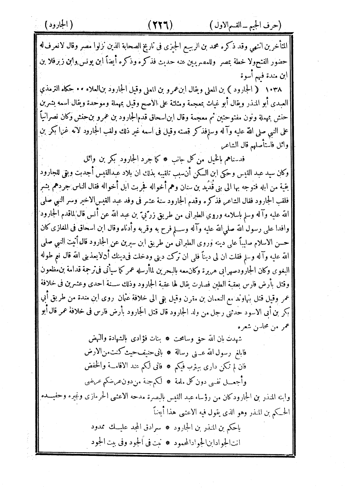 <226> المتأخرين انتهى وقد ذكره محمد بن الربيع الجيزي في تاريخ الصحابة الذين نزلوا مصر وقال لا نعرف له حضور الفتح ولا خطة بمصر وللمصرين عنه حديث فذكره وذكره أيضا بن يونس وابن زبر فلابن منده فيهم أسوة الجارود بن المعلى ويقال بن عمرو بن المعلى وقيل الجارود بن العلاء حكاه الترمذي العبدي أبو المنذر ويقال أبو غياث بمعجمة ومثلثة على الأصح وقيل بمهملة وموحدة ويقال اسمه بشر بن حنش بمهملة ونون مفتوحتين ثم معجمة وقال بن إسحاق قدم الجارود بن عمرو بن حنش وكان نصرانيا على النبي صلى الله عليه وسلم فذكر قصة وقال في اسمه غير ذلك ولقب الجارود لأنه غزا بكر بن وائل فاستأصلهم قال الشاعر فدسناهم بالخيل من كل جانب كما جرد الجارود بكر بن وائل وكان سيد عبد القيس وحكى بن السكن أن سبب تلقيبه بذلك أن بلاد عبد القيس اجدبت وبقي للجارود بقية من إبله فتوجه بها إلى بني قديد بن شيبان وهم أخواله فجربت إبل أخواله فقال الناس جردهم بشر فلقب الجارود فقال الشاعر فذكره وقدم الجارود سنة عشر في وفد عبد القيس الأخير وسر النبي صلى الله عليه وسلم بإسلامه وروى الطبراني من طريق زربي بن عبد الله عن أنس قال لما قدم الجارود وافدا على رسول الله صلى الله عليه وسلم فرح به وقربه وادناه وقال بن إسحاق في المغازي كان حسن الإسلام صليبا على دينه وروى الطبراني من طريق بن سيرين عن الجارود قال أتيت النبي صلى الله عليه وسلم فقلت إن لي دينا فلي إن تركت ديني ودخلت في دينك الا يعذبني الله قال نعم طوله البغوي وكان الجارود صهر أبي هريرة وكان معه بالبحرين لما أرسله عمر كما سيأتي في ترجمة قدامة بن مظعون وقتل بأرض فارس بعقبة الطين فصارت يقال له عقبة الجارود وذلك سنة إحدى وعشرين في خلافة عمر وقيل قتل بنهاوند مع النعمان بن مقرن وقيل بقي إلى خلافة عثمان روى بن منده من طريق أبي بكر بن أبي الأسود حدثني رجل من ولد الجارود قال قتل الجارود بأرض فارس في خلافة عمر قال أبو عمر من محاسن شعره شهدت بأن الله حق وسامحت بنات فؤادي بالشهادة والنهض فأبلغ رسول الله عني رسالة بأبي حنيف حيث كنت من الأرض فإن لم تكن داري بيثرب فيكم فإني لكم عند الإقامة والخفض واجعل نفسي دون كل ملمة لكم جنة من دون عرضكم عرضي وابنه المنذر بن الجارود كان من رؤساء عبد القيس بالبصرة مدحه الأعشى الحرمازي وغيره وحفيده الحكم بن المنذر وهو الذي يقول فيه الأعشى هذا أيضا يا حكم بن المنذر بن الجارود سرادق المجد عليك ممدود أنت الجواد بن الجواد المحمود نبت في الجود وفي بيت الجود §