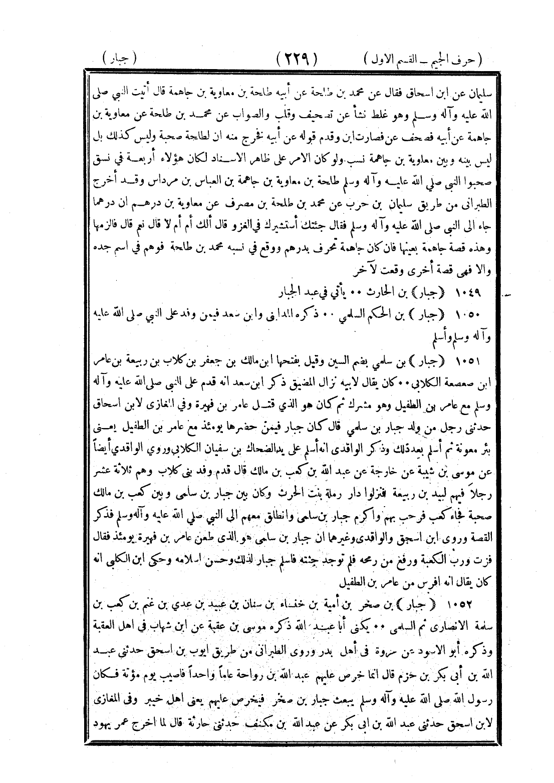 <229> سليمان عن بن إسحاق فقال عن محمد بن طلحة عن أبيه طلحة بن معاوية بن جاهمة قال أتيت النبي صلى الله عليه وسلم وهو غلط نشأ عن تصحيف وتقليب والصواب عن محمد بن طلحة عن معاوية بن جاهمة عن أبيه فصحف عن فصارت بن وقدم قوله عن أبيه فخرج منه أن لطلحة صحبة وليس كذلك بل ليس بينه وبين معاوية بن جاهمة نسب ولو كان الأمر على ظاهر الإسناد لكان هؤلاء أربعة في نسق صحبوا النبي صلى الله عليه وسلم طلحة بن معاوية بن جاهمة بن العباس بن مرداس وقد أخرج الطبراني من طريق سليمان بن حرب عن محمد بن طلحة بن مصرف عن معاوية بن درهم أن درهما جاء إلى النبي صلى الله عليه وسلم فقال جئتك استشيرك في الغزو وقال الك أم أم لا قال نعم قال فالزمها وهذه قصة جاهمة بعينها فإن كان جاهمة تحرف بدرهم ووقع في نسبه محمد بن طلحة فوهم في اسم جده وإلا فهي قصة أخرى وقعت لآخر جبار بن الحارث يأتي في عبد الجبار جبار بن الحكم السلمي ذكره المدائني وابن سعد فيمن وفد على النبي صلى الله عليه وسلم وأسلم جبار بن سلمي بضم السين وقيل بفتحها بن مالك بن جعفر بن كلاب بن ربيعة بن عامر بن صعصعة الكلابي كان يقال لأبيه نزال المضيق ذكر أبي سعد أنه قدم على النبي صلى الله عليه وسلم مع عامر بن الطفيل وهو مشرك ثم كان هو الذي قتل عامر بن فهيرة وفي المغازي لابن إسحاق حدثني رجل من ولد جبار بن سلمي قال كان جبار فيمن حضرها يومئذ مع عامر بن الطفيل يعني بئر معونة ثم أسلم بعد ذلك وذكر الواقدي أنه أسلم على يد الضحاك بن سفيان الكلابي وروى الواقدي أيضا عن موسى بن شيبة عن خارجة عن عبد الله بن كعب بن مالك قال قدم وفد بني كلاب وهم ثلاثة عشر رجلا فيهم لبيد بن ربيعة فنزلوا دار رملة بنت الحارث وكان بين جبار بن سلمى وبين كعب بن مالك صحبة فجاء كعب فرحب بهم واكرم جبار بن سلمى وانطلق معهم إلى النبي صلى الله عليه وسلم فذكر القصة وروى بن إسحاق والواقدي وغيرهما أن جبار بن سلمى هو الذي طعن عامر بن فهيرة يومئذ فقال فزت ورب الكعبة ووقع من رمحه فلم توجد جثته فأسلم جبار لذلك وحسن إسلامه وحكى بن الكلبي أنه كان يقال إنه افرس من عامر بن الطفيل جبار بن صخر بن أمية بن خنساء بن سنان بن عبيد بن عدي بن عنم بن كعب بن سلمة الأنصاري ثم السلمي يكنى أبا عبد الله ذكره موسى بن عقبة عن بن شهاب في أهل العقبة وذكره أبو الأسود عن عروة في أهل بدر وروى الطبراني من طريق بن إسحاق حدثني عبد الله بن أبي بكر بن حزم قال إنما خرص عليهم عبد الله بن رواحة عاما واحدا فأصيب يوم مؤتة فكان رسول الله صلى الله عليه وسلم يبعث جبار بن صخر فيخرص عليهم يعني أهل خيبر وفي المغازي لابن إسحاق حدثني عبد الله بن أبي بكر عن عبد الله بن مكنف حدثني حارثة قال لما أخرج عمر يهود §
