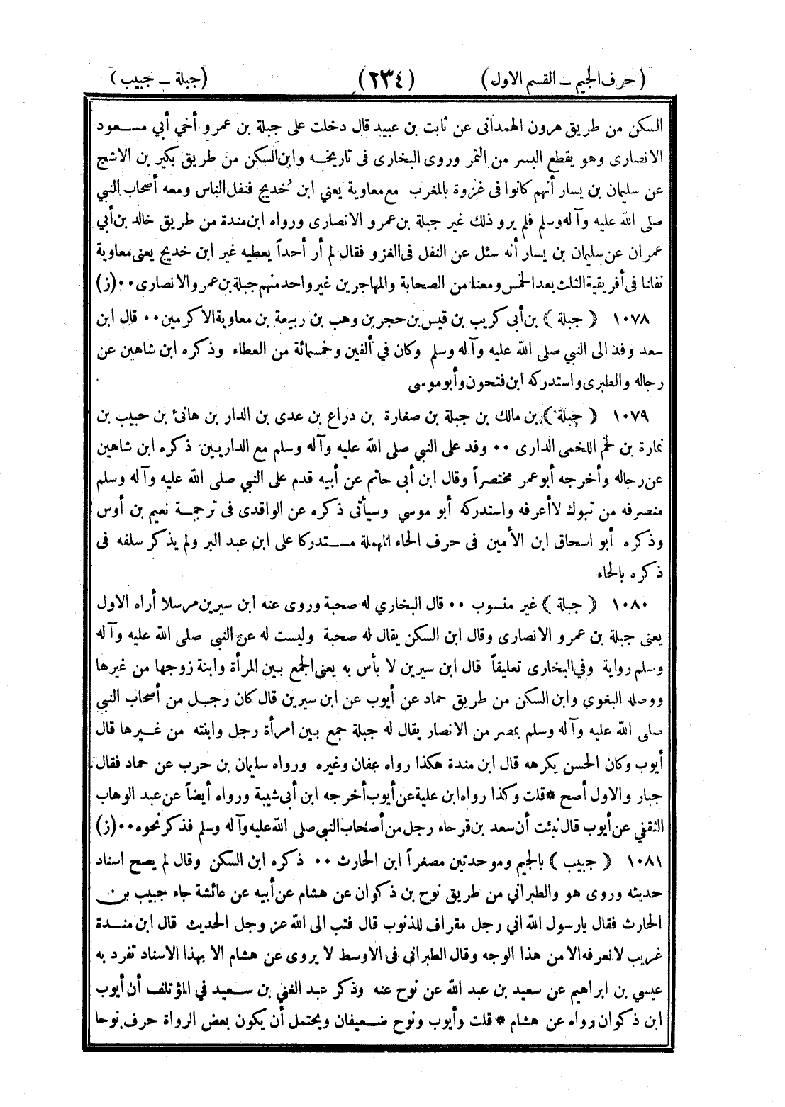 <234> السكن من طريق هارون الهمداني عن ثابت بن عبيد قال دخلت على جبلة بن عمر وأخي أبي مسعود الأنصاري وهو يقطع البسر من التمر وروى البخاري في تاريخه وابن السكن من طريق بكير بن الأشج عن سليمان بن يسار أنهم كانوا في غزوة المغرب مع معاوية يعني بن حديج فنفل الناس ومعه أصحاب النبي صلى الله عليه وسلم فلم يرد ذلك غير جبلة بن عمرو الأنصاري ورواه بن منده من طريق خالد بن أبي عمران عن سليمان بن يسار أنه سئل عن النفل في الغزو فقال لم أر أحدا يطيعه غير بن حديج يعني معاوية نفلنا في إفريقية الثلث بعد الخمس ومعنا من الصحابة والمهاجرين غير واحد منهم جبلة بن عمرو الأنصاري جبلة بن أبي كريب بن قيس بن حجر بن وهب بن ربيعة بن معاوية الاكرمين قال بن سعد وفد على النبي صلى الله عليه وسلم وكان في ألفين وخمسمائة من العطاء وذكره بن شاهين عن رجاله واستدركه بن فتحون وأبو موسى جبلة بن مالك بن جبلة بن صفارة بن دراع بن عدي بن الدار بن هانئ بن حبيب بن نمارة بن لخم اللخمي الداري وفد على النبي صلى الله عليه وسلم مع الدارين ذكره بن شاهين عن رجاله أخرجه أبو عمر مختصرا وقال بن أبي حاتم عن أبيه قدم على النبي صلى الله عليه وسلم منصرفه من تبوك لا أعرفه واستدركه أبو موسى وسيأتي ذكره عن الواقدي في ترجمة نعيم بن أوس وذكره أبو إسحاق بن الأمين في حرف الحاء المهملة مستدركا على بن عبد البر ولم يذكره سلفه في ذكره بالحاء جبلة غير منسوب قال البخاري له صحبة وروى عنه بن سيرين مرسلا أراه الأول يعني جبلة بن عمرو الأنصاري وقال بن السكن يقال له صحبة وليست له عن النبي صلى الله عليه وسلم رواية وفي البخاري تعليقا قال بن سيرين لا بأس به يعني الجمع بين المرأة وابنة زوجها من غيرها ووصله البغوي وابن السكن من طريق حماد عن أيوب عن بن سيرين قال كان رجل من أصحاب النبي صلى الله عليه وسلم بمصر من الأمصار يقال له جبلة جمع بين امرأة رجل وابنته من غيرها قال أيوب وكان الحسن يكرهه قال بن منده هكذا رواه عفان وغيره ورواه سليمان بن حرب عن حماد فقال جبار والأول أصح قلت وكذا رواه بن علية عن أيوب أخرجه بن أبي شيبة عنه ورواه أيضا عبد الوهاب الثقفي عن أيوب قال نبئت أن سعد بن قرحاء رجل من أصحاب النبي صلى الله عليه وسلم فذكره نحوه جبيب بالجيم وموحدتين مصغرا بن الحارث ذكره بن السكن وقال لم يصح إسناد حديثه وروى هو والطبراني من طريق نوح بن ذكوان عن هشام عن أبيه عن عائشة جاء جبيب بن الحارث فقال يا رسول الله إني رجل مقراف للذنوب قال فتب إلى الله عز وجل الحديث قال بن منده غريب لا نعرفه الا من هذا الوجه وقال الطبراني في الأوسط لا يروي عن هشام إلا بهذا الإسناد تفرد به عيسى عن إبراهيم عن سعيد بن عبد الله عن نوح عنه وذكر عبد الغني بن سعيد في المؤتلف أن أيوب بن ذكوان رواه عن هشام قلت وأيوب ونوح ضعيفان ويحتمل أن يكون بعض الرواة حرف نوحا §