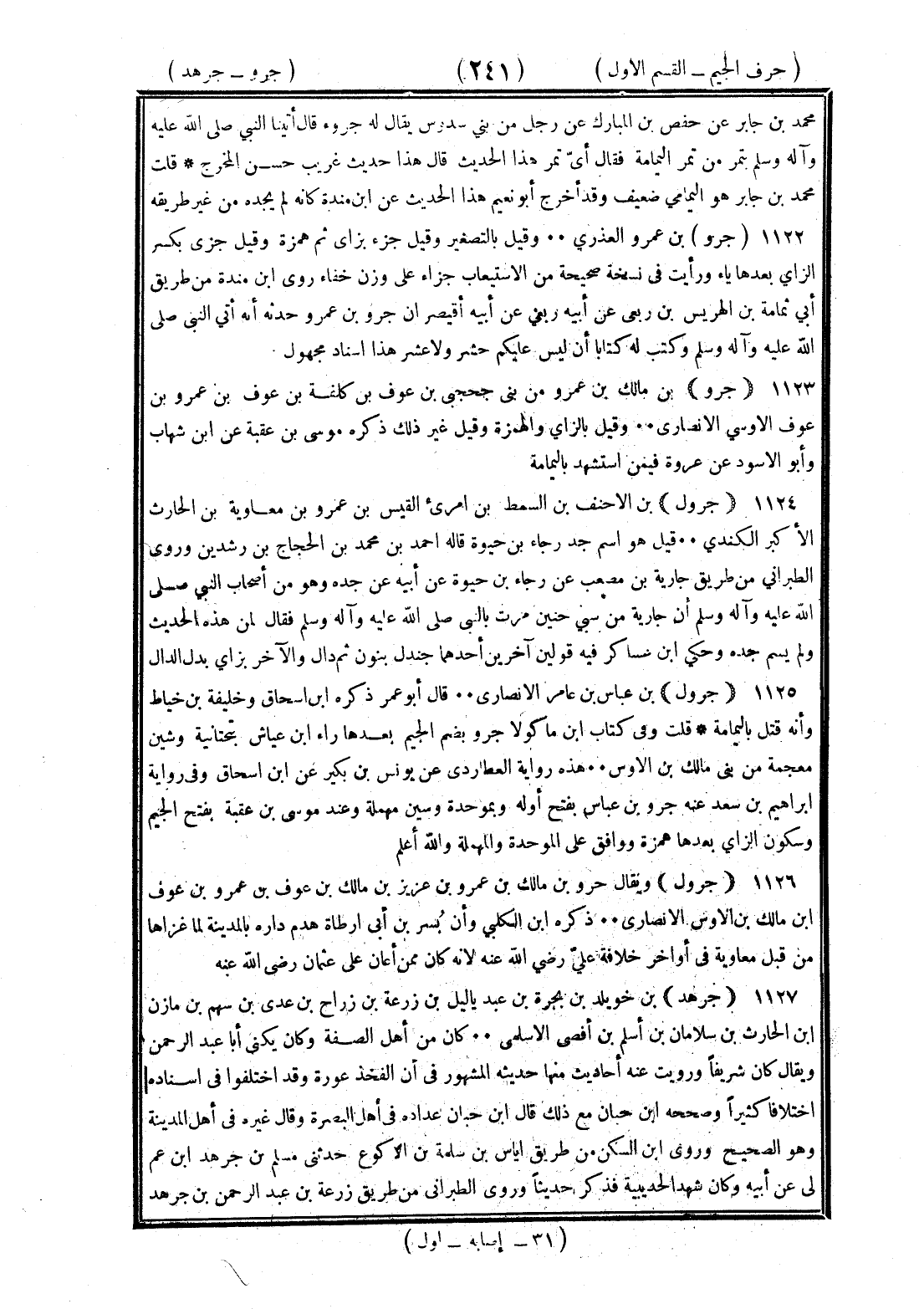 <241> محمد بن جابر عن حفص بن المبارك عن رجل من بني سدوس يقال له جرو قال أتينا النبي صلى الله عليه وسلم بتمر من تمر اليمامة فقال أي نمر هذا الحديث قال هذا حديث غريب حسن المخرج قلت محمد بن جابر هو اليمامي ضعيف وقد أخرج أبو نعيم هذا الحديث عن بن منده وكأنه لم يجده من غير طريقه جرو بن عمرو العذري وقيل بالتصغير وقيل جزء بزاي ثم همزة وقيل جزي بكسر الزاي بعدها ياء ورأيت في نخسه صحيحة من الاستيعاب جزاء على وزن خفاء روى بن منده من طريق أبي ثمامة بن الضريس بن ربعي عن أبيه عن أبيه ربعي عن أبيه أقيصر أن جرو بن عمرو حدثه أنه أتى النبي صلى الله عليه وسلم وكتب له كتابا أن ليس عليكم حشر ولا عشر هذا إسناد مجهول جرو بن مالك بن عمرو من بني جحجبي بن عوف بن كلفة بن عوف بن عمرو عوف الأوسي الأنصاري وقيل بالزاي والهمز وقيل غير ذلك ذكره موسى بن عقبة عن بن شهاب وأبو الأسود عن عروة فيمن استشهد باليمامة جرول بن الأحنف بن السمط بن امرئ القيس بن عمرو بن معاوية بن الحارث الأكبر الكندي قيل هو اسم جد رجاء بن حيوة قاله أحمد بن محمد بن الحجاج بن رشدين وروى الطبراني من طريق جارية بن مصعب عن رجاء بن حيوة عن أبيه عن جده وهو من أصحاب النبي صلى الله عليه وسلم أن جارية من سبي حنين مرت بالنبي صلى الله عليه وسلم فقال لمن هذه الحديث ولم يسم جده وحكى بن عساكر فيه قولين آخرين أحدهما جندل بنون ثم دال والآخر بزاي بدل الدال جرول بن عباس بن عامر الأنصاري قال أبو عمر ذكره بن إسحاق وخليفة بن خياط وأنه قتل باليمامة قلت وفي كتاب بن ماكولا جرو بضم الجيم بعدها راء بن عياش بتحتانية وشين معجمة من بني مالك بن الأوس هذه رواية العطاردي عن يونس بن بكير عن بن إسحاق وفي رواية إبراهيم بن سعد عنه جرو بن عباس بفتح أوله وبموحدة وسين مهملة وعند موسى بن عقبة بفتح الجيم وسكون الزاي بعدها همزة ووافق على الموحدة والمهملة والله أعلم جرول ويقال جرو بن مالك بن عمرو بن عويمر بن مالك بن عوف بن عمرو بن عوف بن مالك بن الأوس الأنصاري ذكره بن الكلبي وأن بسر بن أبي أرطاة هدم داره ولده زرارة بن جرول بالمدنية لما غزاها من قبل معاوية في أواخر خلافة علي رضي الله عنه لأنه كان ممن أعان على عثمان رضي الله عنه جرهد بن خويلد بن بجرة بن عبد ياليل بن زرعة بن رزاح بن عدي بن سهم بن تميم بن مازن بن الحارث بن سلامان بن أسلم بن أفصى الأسلمي كان من أهل الصفة وكان يكنى أبا عبد الرحمن ويقال كان شريفا ورويت عنه أحاديث منها حديثه المشهور في أن الفخذ عورة وقد اختلفوا في إسناده اختلافا كثيرا وصححه بن حبان قال بن حبان عداده في أهل البصرة وقال غيره في أهل المدينة وهو الصحيح وروى بن السكن من طريق إياس بن سلمة بن الأكوع حدثني مسلم بن جرهد عن بن عم لي عن أبيه وكان شهد الحديبية فذكر حديثا وروى الطبراني من طريق زرعة بن عبد الرحمن بن جرهد §
