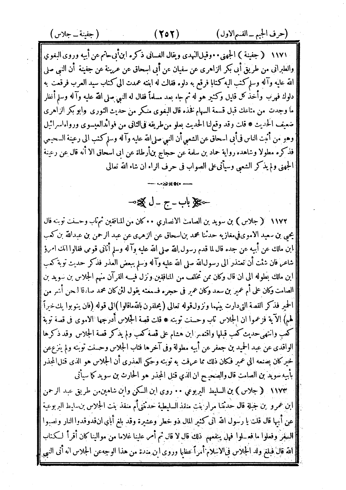 <252> جفينة الجهني وقيل النهدي ويقال الغساني ذكره بن أبي حاتم عن أبيه وروى البغوي والطبراني من طريق أبي بكر الزاهري عن سفيان عن أبي إسحاق عن عرينة عن جفينة أن النبي صلى الله عليه وسلم كتب إليه كتابا فرقع به دلوه فقالت له ابنته عمدت إلى كتاب سيد العرب فرقعت به دلوك فهرب وأخذ كل قليل وكثير هو له ثم جاء بعد مسلما فقال له النبي صلى الله عليه وسلم انظر ما وجدت من متاعك قبل قسمة السهام فخذه قال البغوي منكر من حديث الثوري وأبو بكر الزاهري ضعيف الحديث قلت وقد وقع لنا الحديث بعلو من طريقه في الثاني من فوائد العيسوي ورواه إسرائيل وهو من أثبت الناس في أبي إسحاق عن أبي إسحاق عن الشعبي أن النبي صلى الله عليه وسلم كتب إلي رعية السحيمي فذكره مطولا وشاهده رواية حماد بن سلمة عن حجاج بن أرطاة عن أبي إسحاق إلا أنه قال عن رعية الجهني ولم يذكر الشعبي وسيأتي على الصواب في حرف الراء إن شاء الله تعالى الجيم بعدها اللام جلاس بن سويد بن الصامت الأنصاري كان من المنافقين ثم تاب وحسنت توبته قال يحيى بن سعيد الأموي في مغازيه حدثنا محمد بن إسحاق عن الزهري عن عبد الرحمن بن عبد الله بن كعب بن مالك عن أبيه عن جده قال لما قدم رسول الله صلى الله عليه وسلم أتاني قومي فقالوا إنك امرؤ شاعر فإن شئت أن تعتذر إلى رسول الله صلى الله عليه وسلم ببعض العذر فذكر حديث توبة كعب بن مالك بطوله إلى أن قال وكان ممن تخلف من المنافقين ونزل فيه القرآن منهم الجلاس بن سويد بن الصامت وكان على أم عمير بن سعد وكان عمير في حجره فسمعه يقول لئن كان محمدا صادقا لنحن شر من الحمير فذكر القصة التي دارت بينهما ونزول قوله تعالى يحلفون بالله ما قالوا إلى قوله فإن يتوبوا يك خيرا لهم الآية فزعموا أن الجلاس تاب وحسنت توبته قلت قصة الجلاس أدرجها الأموي في قصة توبة كعب وانتهى حديث كعب قبلها واقتصر بن هشام على قصة كعب ولم يذكر قصة الجلاس وقد ذكرها الواقدي عن عبد الحميد بن جعفر عن أبيه مطولة وفي آخرها فتاب الجلاس وحسنت توبته ولم ينزع عن خير كان يصنعه إلى عمير فكان ذلك مما عرفت به توبته وحكى العذري أن الجلاس هو الذي قتل المجذر بأبيه سويد بن الصامت قال والصحيح أن الذي قتل المجذر هو الحارث بن سويد كما سيأتي جلاس بن صليت اليربوعي روى بن السكن وابن شاهين من طريق عبد الرحمن بن عمرو بن جبلة قال حدثتنا مرار بنت منقذ الصليتية حدثتني أم منقذ بن الجلاس بن صليت اليربوعية عن أبيها قال قلت يا رسول الله إني كثير المال ذو خطر وعشيرة وقد بلغ آبائي أن قد أوقدوا النار ونصبوا السفر وفعلوا وفعلوا فهل ينفعهم ذلك قال لا قال ثم أمر علينا غلاما من موالينا كان اقرأ لكتاب الله قال فبلغ ولد الجلاس في الإسلام أمرا عظيما وعلق بن منده من هذا الوجه عن الجلاس أنه أتى النبي §