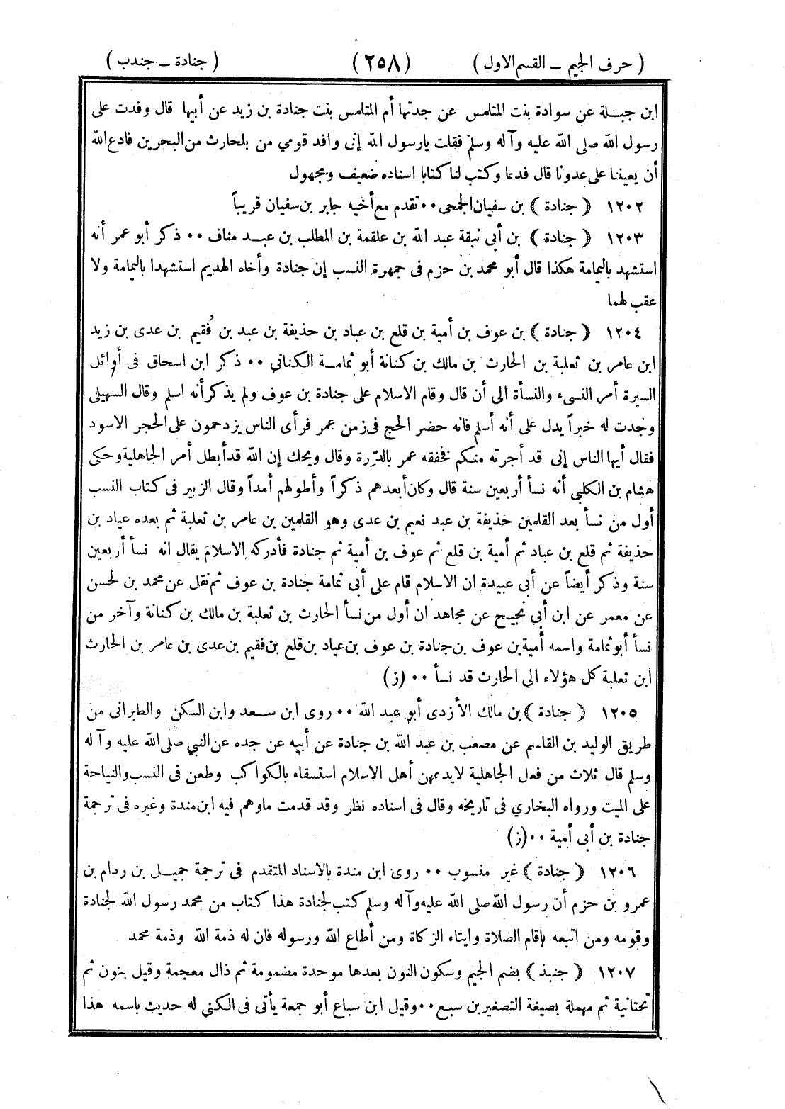 <258> بن جبلة عن سودة بنت المتلمس عن جدتها أم المتلمس بنت جنادة بن زيد عن أبيها قال وفدت على رسول الله صلى الله عليه وسلم فقلت يا رسول الله إني وافد قومي من بلحارث من البحرين فادع الله أن يعيننا على عدونا قال فدعا وكتب لنا كتابا إسناده ضعيف ومجهول جنادة بن سفيان الجمحي تقدم مع أخيه جابر بن سفيان قريبا جنادة بن أبي نبقة عبد الله بن علقمة بن المطلب بن عبد مناف ذكر أبو عمر أنه استشهد باليمامة هكذا قال أبو محمد بن حزم في جمهرة النسب إن جنادة وأخاه الهذيم استشهدا باليمامة ولا عقب لهما جنادة بن عوف بن أمية بن قلع بن عباد بن حذيفة بن عبد بن فقيم بن عدي بن زيد بن عامر بن ثعلبة بن الحارث بن مالك بن كنانة أبو ثمامة الكناني ذكر بن إسحاق في أوائل السيرة أمر النسئ والنسأة إلى أن قال وقام الإسلام على جنادة بن عوف ولم يذكر أنه أسلم قال السهيلي وجدت له خبرا يدل على أنه أسلم فإنه حضر الحج في زمن عمر فرأى الناس يزدحمون على الحجر الأسود فقال أيها الناس إني قد أجرته منكم فخفقه عمر بالدرة وقال ويحك إن الله قد أبطل أمر الجاهلية وحكى هشام بن الكلبي أنه نسأ أربعين سنة قال وكان أبعدهم ذكرا وأطولهم أمدا وقال الزبير في كتاب النسب أول من نسأ بعد القلمس حذيفة بن عبد بن فقيم بن عدي وهو القلمس بن عامر بن ثعلبة ثم بعده عباد بن حذيفة ثم قلع بن عباد ثم أمية بن قلع ثم عوف بن أمية ثم جنادة فأدركه الإسلام يقال إنه نسأ أربعين سنة وذكر أيضا عن أبي عبيدة أن الإسلام قام على أبي ثمامة جنادة بن عوف ثم نقل عن محمد بن الحسن عن معمر عن بن أبي نجيح عن مجاهد أن أول من نسأ الحارث بن ثعلبة بن مالك بن كنانة وآخر من نسأ أبو ثمامة واسمه أمية بن عوف بن جنادة بن عوف بن عباد بن قلع بن فقيم بن عدي بن عامر بن الحارث بن ثعلبة كل هؤلاء إلى الحارث قد نسأ جنادة بن مالك الأزدي أبو عبد الله روى بن سعد وابن السكن والطبراني من طريق الوليد بن القاسم عن مصعب بن عبد الله بن جنادة عن أبيه عن جده عن النبي صلى الله عليه وسلم قال ثلاث من فعل الجاهلية لا يدعهن أهل الإسلام استسقاء بالكواكب وطعن في النسب والنياحة على الميت ورواه البخاري في تاريخه وقال في إسناده نظر وقد قدمت ما وهم فيه بن منده وغيره في ترجمة جنادة بن أبي أمية جنادة غير منسوب روى بن منده بالإسناد المتقدم في ترجمة جميل بن ردام بن عمرو بن حزم أن رسول الله صلى الله عليه وسلم كتب لجنادة هذا كتاب من محمد رسول الله لجنادة وقومه ومن اتبعه بإقام الصلاة وإيتاء الزكاة ومن أطاع الله ورسوله فإن له ذمة الله وذمة محمد جنبذ بضم الجيم وسكون النون بعدها موحدة مضمومة ثم ذال معجمة وقيل بنون ثم تحتانية ثم مهملة بصيغة التصغير بن سبع وقيل بن سباع أبو جمعة يأتي في الكنى له حديث باسمه هذا §