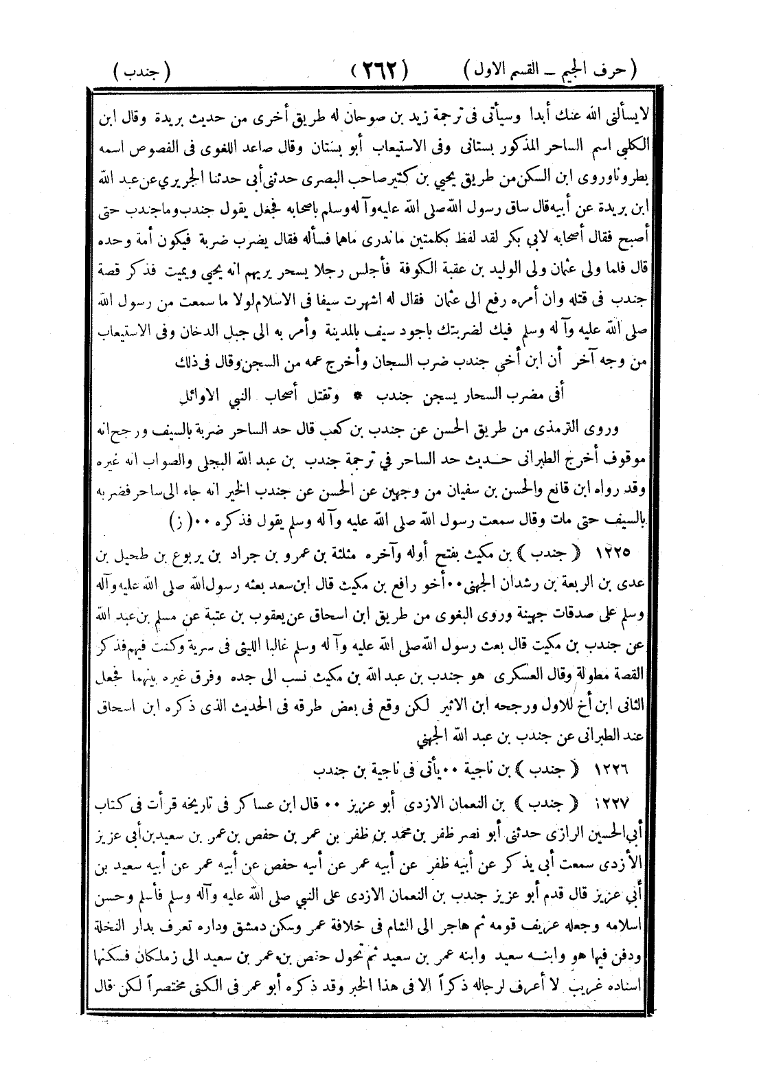 <262> لا يسألني الله عنك أبدا وسيأتي في ترجمة زيد بن صوحان له طريق أخرى من حديث بريدة وقال بن الكلبي اسم الساحر المذكور بستاني وفي الاستيعاب أبو بستان وقال صاعد اللغوي في الفصوص اسمه بطرونا وروى بن السكن من طريق يحيى بن كثير صاحب البصري حدثني أبي حدثنا الجريري عن عبد الله بن بريدة عن أبيه قال ساق رسول الله صلى الله عليه وسلم بأصحابه فجعل يقول جندب وما جندب حتى أصبح فقال أصحابه لأبي بكر لقد لقظ بكلمتين ما ندري ما هما فسأله فقال يضرب ضربة فيكون أمة وحده قال فلما ولي عثمان ولي الوليد بن عقبة الكوفة فأجلس رجلا يسحر يريهم أنه يحيي ويميت فذكر قصة جندب في قتله وأن أمره رفع إلى عثمان فقال له أشهرت سيفا في الإسلام لولا ما سمعت رسول الله صلى الله عليه وسلم فيك لضربتك بأجود سيف بالمدينة وأمر به إلى جبل الدخان وفي الاستيعاب من وجه آخر أن بن أخي جندب ضرب السجان وأخرج عمه من السجن وقال في ذلك أفي مضرب السحار يسجن جندب ويقتل أصحاب النبي الأوائل وروى الترمذي من طريق الحسن عن جندب بن كعب قال حد الساحر ضربه بالسيف ورجح أنه موقوف أخرج الطبراني حديث حد الساحر في ترجمة جندب بن عبد الله البجلي والصواب أنه غيره وقد رواه بن قانع والحسن بن سفيان من وجهين عن الحسن عن جندب الخير أنه جاء إلى ساحر فضربه بالسيف حتى مات وقال سمعت رسول الله صلى الله عليه وسلم يقول فذكره جندب بن مكيث بفتح أوله وآخره مثلثة بن عمرو بن جراد بن يربوع بن طحيل بن عدي بن الربعة بن رشدان الجهني أخو رافع بن مكيث قال بن سعد بعثه رسول الله صلى الله عليه وسلم على صدقة جهينة وروى البغوي من طريق بن إسحاق عن يعقوب بن عتبة عن مسلم بن عبد الله عن جندب بن مكيث قال بعث رسول الله صلى الله عليه وسلم غالبا الليثي في سرية وكنت فيهم فذكر القصة مطولة وقال العسكري هو جندب بن عبد الله بن مكيث نسب إلى جده وفرق غيره بينهما فجعل الثاني بن أخ للأول ورجحه بن الأثير لكن وقع في بعض طرقه في الحديث الذي ذكره بن إسحاق عند الطبراني عن جندب بن عبد الله الجهني جندب بن ناجية يأتي في ناجية بن جندب جندب بن النعمان الأزدي أبو عزيز قال بن عساكر في تاريخه قرأت في كتاب أبي الحسن الرازي حدثني أبو نصر ظفر بن محمد بن ظفر بن عمر بن حفص بن عمر بن سعيد بن أبي عزيز الأزدي سمعت أبي يذكر عن أبيه ظفر عن أبيه عمر عن أبيه حفص عن أبيه عمر عن أبيه سعيد بن أبي عزيز قال قدم أبو عزيز جندب بن النعمان الأزدي على النبي صلى الله عليه وسلم فأسلم وحسن إسلامه وجعله عريف قومه ثم هاجر إلى الشام في خلافة عمر وسكن دمشق وداره تعرف بدار النخلة ودفن فيها هو وابنه سعيد وابنه عمر بن سعيد ثم تحول حفص بن عمر بن سعيد إلى زملكا فسكنها إسناده غريب لا أعرف لرجاله ذكرا الا في هذا الخبر وقد ذكره أبو عمر في الكنى مختصرا لكن قال §