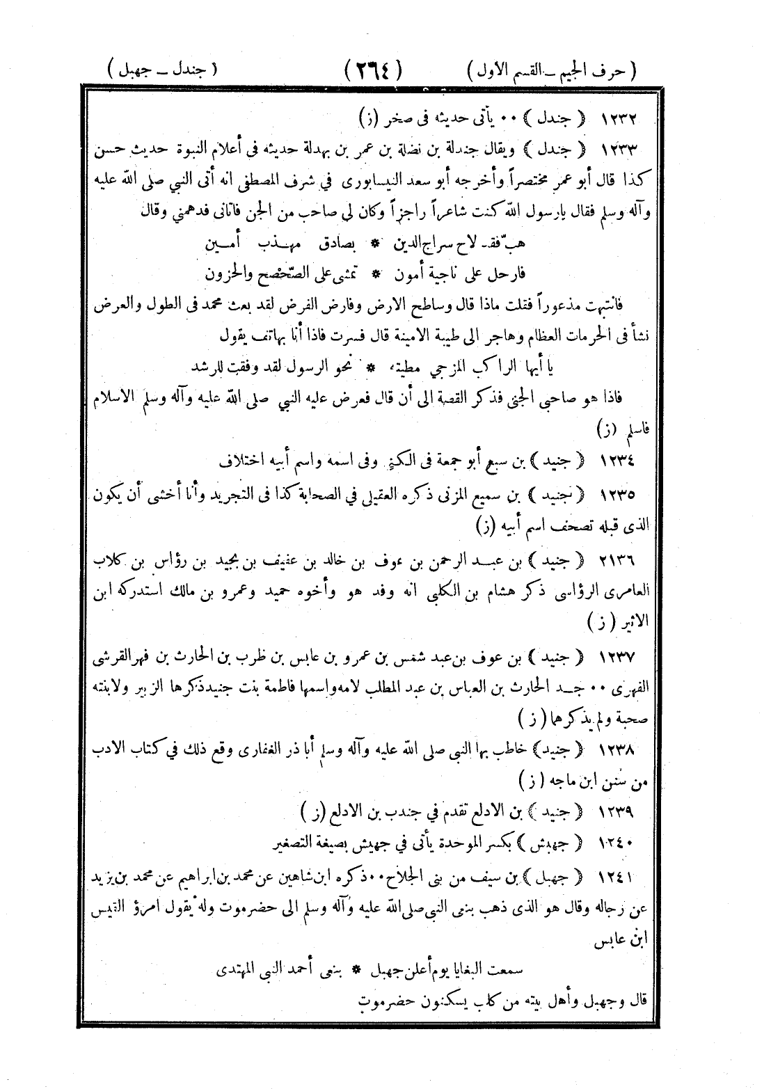 <264> جندل يأتي حديثه في صخر جندل ويقال جندلة بن نضلة بن عمرو بن بهدلة حديثه في إعلام النبوة حديث حسن كذا قال أبو عمر مختصرا وأخرجه أبو سعد النيسابوري في شرف المصطفى أنه أتى النبي صلى الله عليه وسلم فقال يا رسول الله كنت شاعرا راجزا وكان لي صاحب من الجن فأتاني فدهمني وقال هب فقد لاح سراج الدين بصادق مهذب أمين فارحل على ناجية أمون تمشي على الصحصح والحزون فانتبهت مذعورا فقلت ماذا قال وساطح الأرض وفارض الفرض لقد بعث محمد في الطول والعرض نشأ في الحرمات العظام وهاجر إلى طيبة الأمينة قال فسرت فإذا أنا بهاتف يقول يأيها الراكب المزجى مطيته نحو الرسول لقد وفقت للرشد فإذا هو صاحبي الجني فذكر القصة إلى أن قال فعرض عليه النبي صلى الله عليه وسلم الإسلام فأسلم جنيد بن سبع أبو جمعة في الكنى وفي اسمه واسم أبيه اختلاف جنيد بن سميع المزني ذكره العقيلي في الصحابة كذا في التجريد وأنا أخشى أن يكون الذي قبله تصحف اسم أبيه جنيد بن عبد الرحمن بن عوف بن خالد بن عفيف بن بجيد بن رؤاس بن كلاب العامري الرؤاسي ذكر هشام بن الكلبي أنه وفد هو وأخوه حميد وعمرو بن مالك استدركه بن الأثير جنيد بن عوف بن عبد شمس بن عمرو بن عابس بن ظرب بن الحارث بن فهر القرشي الفهري جد الحارث بن العباس بن عبد المطلب لأمه واسمها فاطمة بنت جنيد ذكرها الزبير ولابنته صحبة ولم يذكروهما جنيدب خاطب بها النبي صلى الله عليه وسلم أبا ذر الغفاري وقع ذلك في كتاب الأدب من سنن بن ماجة جنيدب بن الأدلع تقدم في جندب بن الأدلع جهبش بكسر الموحدة يأتي في جهيش بصيغة التصغير جهبل بن سيف من بني الجلاح ذكره بن شاهين عن محمد بن إبراهيم عن محمد بن يزيد عن رجاله وقال هو الذي ذهب بنعي النبي صلى الله عليه وسلم إلى حضرموت وله يقول امرؤ القيس بن عابس شمت النعايا يوم أعلن جهبل بنعي أحمد النبي المهتدي قال وجهبل وأهل بيته من كلب يسكنون حضرموت §