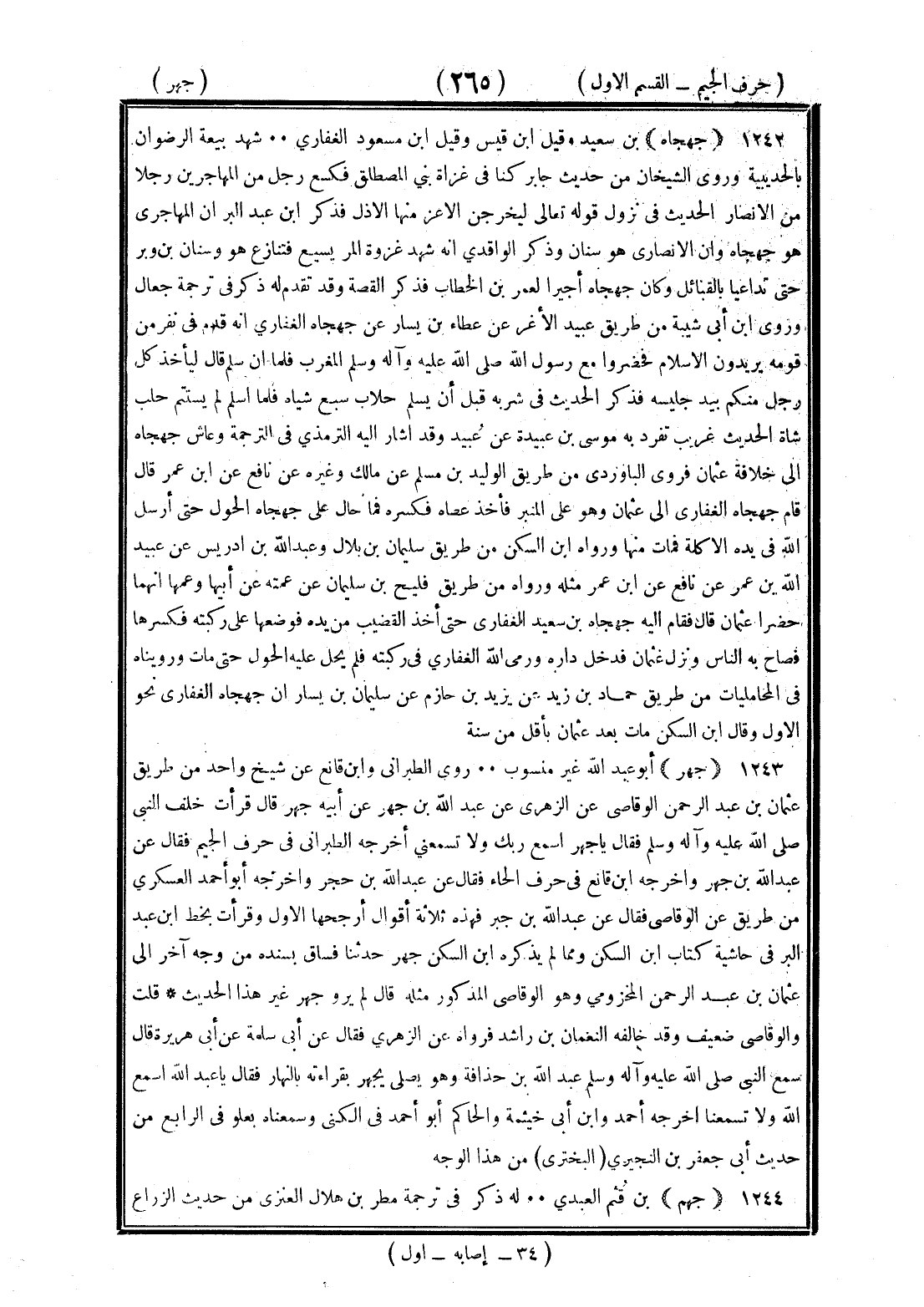 <265> جهجاه بن سعيد وقيل بن قيس وقيل بن مسعود الغفاري شهد بيعة الرضوان بالحديبية وروى الشيخان من حديث جابر كنا في غزاة بني المصطلق فكسع رجل من المهاجرين رجلا من الأنصار الحديث في نزول قوله تعالى ليخرجن الأعز منها الأذل فذكر بن عبد البر أن المهاجري هو جهجاه وأن الأنصاري هو سنان وذكر الواقدي أنه شهد غزوة المريسيع فتنازع هو وسنان بن وبرة حتى تداعيا بالقبائل وكان جهجاه أجيرا لعمر بن الخطاب فذكر القصة وقد تقدم له ذكر في ترجمة جعال وروى بن أبي شيبة من طريق عبيد الأغر عن عطاء بن يسار عن جهجاه الغفاري أنه قدم في نفر من قومه يريدون الإسلام فحضروا مع رسول الله صلى الله عليه وسلم المغرب فلما أن سلم قال ليأخذ كل رجل منكم بيد جليسه فذكر الحديث في شربه قبل أن يسلم حلاب سبع شياه فلما أسلم لم يستتم حلب شاة الحديث غريب تفرد به موسى بن عبيدة عن عبيد وقد أشار إليه الترمذي في الترجمة وعاش جهجاه إلى خلافة عثمان فروى الباوردي من طريق الوليد بن مسلم عن مالك وغيره عن نافع عن بن عمر قال قدم جهجاه الغفاري إلى عثمان وهو على المنبر فأخذ عصاه فكسرها فما حال على جهجاه الحول حي أرسل الله في يده الأكلة فمات منها ورواه بن السكن من طريق سليمان بن بلال وعبد الله بن إدريس عن عبيد الله بن عمر عن نافع عن بن عمر مثله ورواه من طريق فليح بن سليمان عن عمته وأبيها وعمها أنهما حضرا عثمان قال فقام إليه جهجاه بن سعيد الغفاري حتى أخذ القضيب من يده فوضعها على ركبته فكسرها فصاح به الناس ونزل عثمان فدخل داره ورمى الله الغفاري في ركبته فلم يحل عليه الحول حتى مات ورويناه في المحامليات من طريق حماد بن زيد عن يزيد بن حازم عن سليمان بن يسار أن جهجاه الغفاري نحو الأول وقال بن السكن مات بعد عثمان بأقل من سنة جهر أبو عبد الله غير منسوب روى الطبراني وابن قانع عن شيخ واحد من طريق عثمان بن عبد الرحمن الوقاصي عن الزهري عن عبد الله بن جهر عن أبيه جهر قال قرأت خلف النبي صلى الله عليه وسلم فقال يا جهر أسمع ربك ولا تسمعني أخرجه الطبراني في حرف الجيم فقال عن عبد الله بن جهر وأخرجه بن قانع في حرف الحاء فقال عن عبد الله بن حجر وأخرجه أبو أحمد العسكري من طريق عن الوقاصي فقال عن عبد الله بن جابر فهذه ثلاثة أقوال أرجحها الأول وقرأت بخط بن عبد البر في حاشية كتاب بن السكن وممن لم يذكره بن السكن جهر حدثنا فساق بسنده من وجه آخر إلى عثمان بن عبد الرحمن المخزومي وهو الوقاصي المذكور مثله قال لم يرو جهر غير هذا الحديث قلت والوقاصي ضعيف وقد خالفه النعمان بن راشد فرواه عن الزهري فقال عن أبي سلمة عن أبي هريرة قال سمع النبي صلى الله عليه وسلم عبد الله بن حذافة وهو يصلي يجهر بقراءته بالنهار فقال يا عبد الله أسمع الله ولا تسمعنا أخرجه أحمد وابن أبي خيثمة والحاكم أبو أحمد في الكنى وسمعناه بعلو في الرابع من حديث أبي جعفر بن البختري من هذا الوجه جهم بن قثم العبدي له ذكر في ترجمة مطر بن هلال العنزي من حديث الزارع §