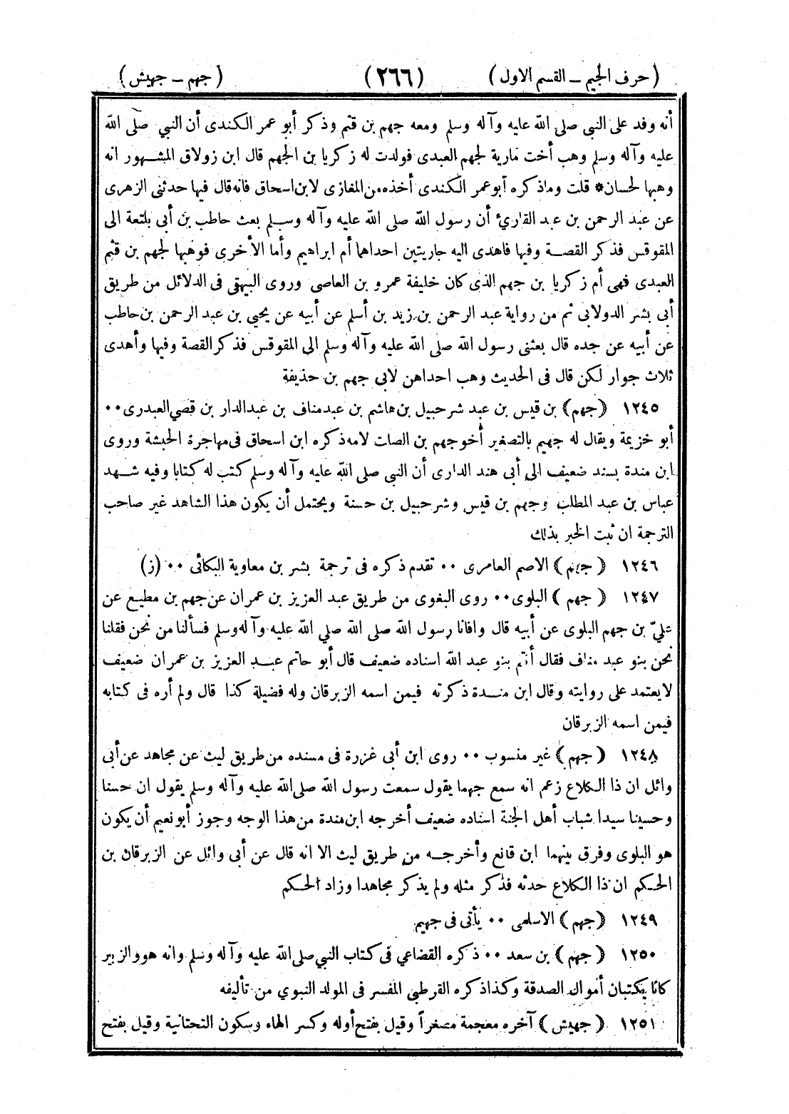 <266> أنه وفد على النبي صلى الله عليه وسلم ومعه جهم بن قثم وذكر أبو عمر الكندي أن النبي صلى الله عليه وسلم وهب أخت مارية لجهم العبدي فولدت له زكريا بن الجهم قال بن زولاق المشهور أنه وهبها لحسان قلت وما ذكره أبو عمر الكندي أخذه من المغازي لابن إسحاق فإنه قال فيها حدثني الزهري عن عبد الرحمن بن عبد القاري أن رسول الله صلى الله عليه وسلم بعث حاطب بن أبي بلتعة إلى المقوقس فذكر القصة وفيها فأهدى إليه جاريتان إحداهما أم إبراهيم وأما الأخرى فوهبها لجهم بن قثم العبدي فهي أم زكريا بن جهم الذي كان خليفة عمرو بن العاص وروى البيهقي في الدلائل من طريق أبي بشر الدولابي ثم من رواية عبد الرحمن بن زيد بن أسلم عن أبيه عن يحيى بن عبد الرحمن بن حاطب عن أبيه عن جده قال بعثني رسول الله صلى الله عليه وسلم إلى المقوقس فذكر القصة وفيها وأهدى ثلاث جوار لكن قال في الحديث وهب إحداهن لأبي جهم بن حذيفة جهم بن قيس بن عبد شرحبيل بن هاشم بن عبد مناف بن عبد الدار بن قصي العبدري أبو حزيمة ويقال له جهيم بالتصغير أخو جهيم بن الصلت لأمه ذكره بن إسحاق في مهاجرة الحبشة وروى بن منده بسند ضعيف إلى أبي هند الداري أن النبي صلى الله عليه وسلم كتب له كتابا وفيه شهد عباس بن عبد المطلب وجهم بن قيس وشرحبيل بن حسنة ويحتمل أن يكون هذا الشاهد غير صاحب الترجمة إن ثبت الخبر بذلك جهم الأصم العامري تقدم ذكره في ترجمة بشر بن معاوية البكائي جهم البلوي روى البغوي من طريق عبد العزيز بن عمران عن جهم بن مطيع عن علي بن جهم البلوي عن أبيه قال وافينا رسول الله صلى الله عليه وسلم فسألنا من نحن فقلنا نحن بنو عبد مناف فقال أنتم بنو عبد الله إسناده ضعيف قال أبو حاتم عبد العزيز بن عمران ضعيف لا يعتمد على روايته وقال بن منده ذكرته فيمن اسمه الزبرقان وله فضيلة كذا قال ولم أره في كتابه فيمن اسمه الزبرقان جهم غير منسوب روى بن أبي غرزة في مسنده من طريق ليث عن مجاهد عن أبي وائل أن ذا الكلاع زعم أنه سمع جهما يقول سمعت رسول الله صلى الله عليه وسلم يقول إن حسنا وحسينا سيدا شباب أهل الجنة إسناده ضعيف أخرجه بن منده من هذا الوجه وجوز أبو نعيم أن يكون هو البلوي وفرق بينهما بن قانع وأخرجه من طريق ليث الا أنه قال عن أبي وائل عن الزبرقان بن الحكم أن ذا الكلاع حدثه فذكر مثله ولم يذكر مجاهدا وزاد الحكم جهم الأسلمي يأتي في جهيم جهم بن سعد ذكره القضاعي في كتاب النبي صلى الله عليه وسلم وأنه هو والزبير كانا يكتبان أموال الصدقة وكذا ذكره القرطبي المفسر في المولد النبوي من تأليفه جهيش آخره معجمة مصغرا وقيل بفتح أوله وكسر الهاء وسكون التحتانية وقيل بفتح §