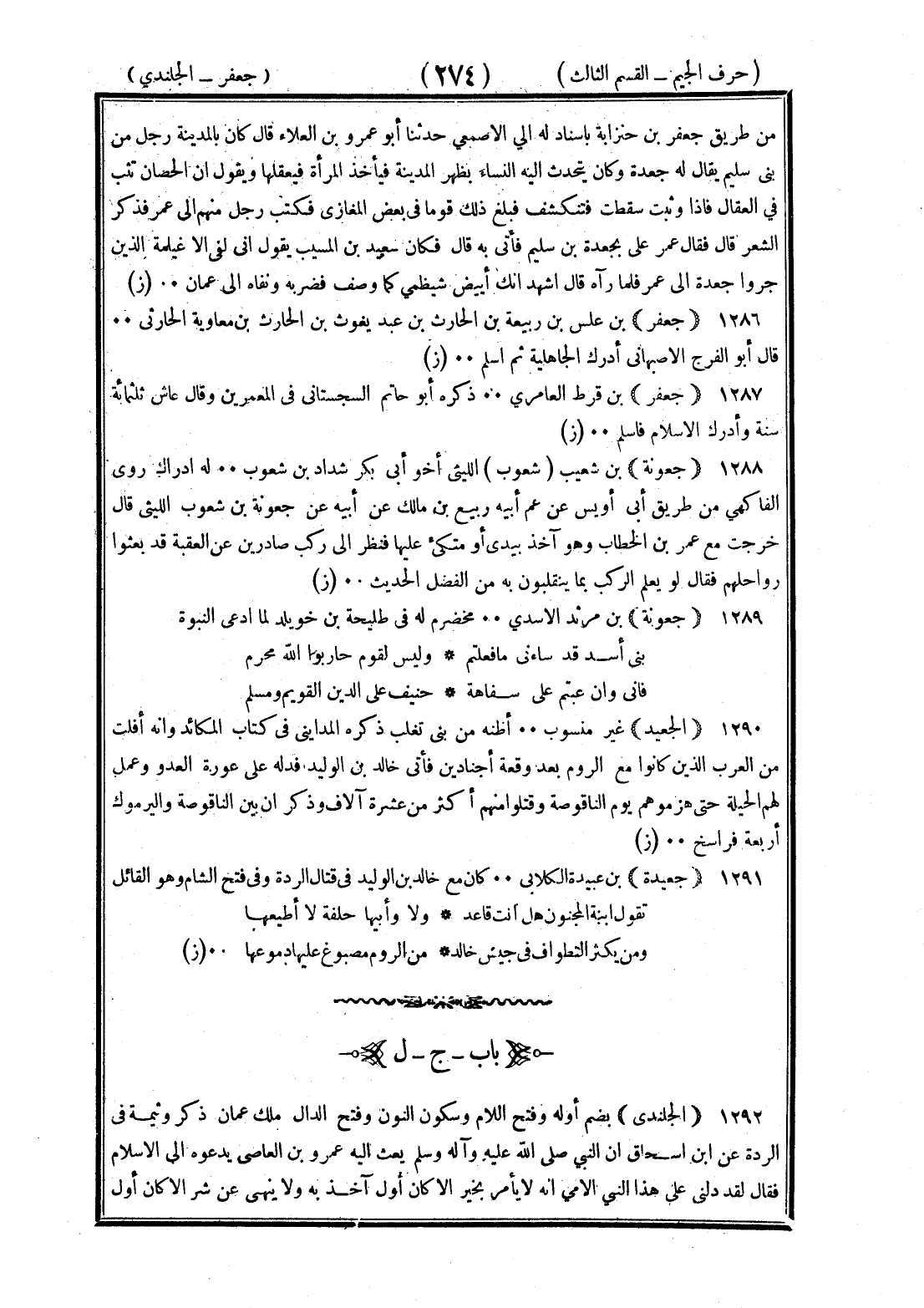 <274> من طريق جعفر بن خنزابة بإسناد له إلى الأصمعي حدثنا أبو عمرو بن العلاء قال كان بالمدينة رجل من بني سليم يقال له جعدة وكان يتحدث إليه النساء بظهر المدينة فيأخذ المرأة فيعقلها ويقول إن الحصان يثب في العقال فإذا وثبت سقطت فتنكشف فبلغ ذلك قوما في بعض المغازي فكتب رجل منهم إلى عمر فذكر الشعر قال فقال عمر علي بجعدة بن سليم فأتى به قال فكان سعيد بن المسيب يقول إني لفي الأغيلمة الذين جروا جعدة إلى عمر فلما رآه قال أشهد أنك أبيض شيظمي كما وصف فضربه ونفاه إلى عمان جعفر بن علس بن ربيعة بن الحارث بن عبد يغوث بن الحارث بن معاوية الحارثي قال أبو الفرج الأصبهاني أدرك الجاهلية ثم أسلم جعفر بن قرط العامري ذكره أبو حاتم السجستاني في المعمرين وقال عاش ثلاثمائة سنة وأدرك الإسلام فأسلم جعونة بن شعوب الليثي أخو أبي بكر بن شداد بن شعوب له إدراك روى الفاكهي من طريق أبي أويس عن عم أبيه ربيع بن مالك عن أبيه عن جعونة بن شعوب الليثي قال خرجت مع عمر بن الخطاب وهو آخذ بيدي أو متكئ عليها فنظر إلى ركب صادرين عن العقبة قد بعثوا رواحلهم فقال لو يعلم الركب بما ينقلبون به من الفضل الحديث جعونة بن مرثد الأسدي مخضرم له في طلحة بن خويلد لما ادعى النبوة بني أسد قد ساءني ما فعلتم وليس لقوم حاربوا الله محرم فإني وإن عبتم على سفاهة حنيف على الدين القويم ومسلم الجعيد غير منسوب أظنه من بني تغلب ذكره المدائني في كتاب المكايد وأنه أفلت من العرب الذين كانوا مع الروم بعد وقعة أجنادين فأتى خالد بن الوليد فدله على عورة العدو وعمل لهم الحيلة حتى هزموهم يوم الناقوصة وقتلوا منهم أكثر من عشرة آلاف وذكر أن بين الناقوصة واليرموك أربعة فراسخ جعيدة بن عبيدة الكلابي كان مع خالد بن الوليد في قتال الردة وفي فتح الشام وهو القائل تقول ابنة المجنون هل أنت قاعد ولا وأبيها خلفه لا أطيعها ومن يكثر التطواف في جيش خالد من الروم مصبوغ عليها دموعها الجيم بعدها اللام والميم الجلندي بضم أوله وفتح اللام وسكون النون وفتح الدال ملك عمان ذكر وثيمة في الردة عن بن إسحاق أن النبي صلى الله عليه وسلم بعث إليه عمرو بن العاصي يدعوه إلى الإسلام فقال لقد دلني على هذا النبي الأمي إنه لا يأمر بخير الا كان أول آخذ به ولا ينهى عن شر إلا كان أول §